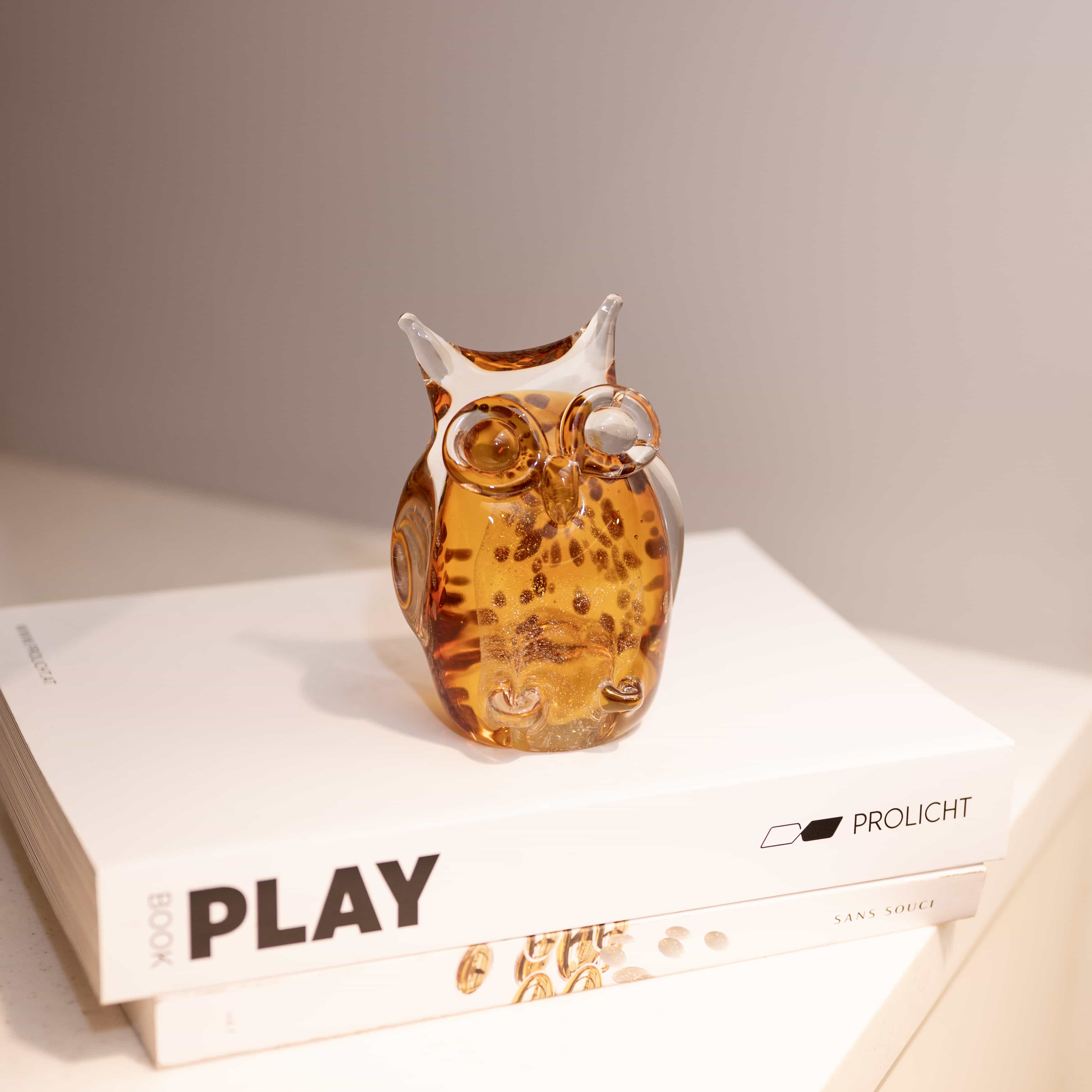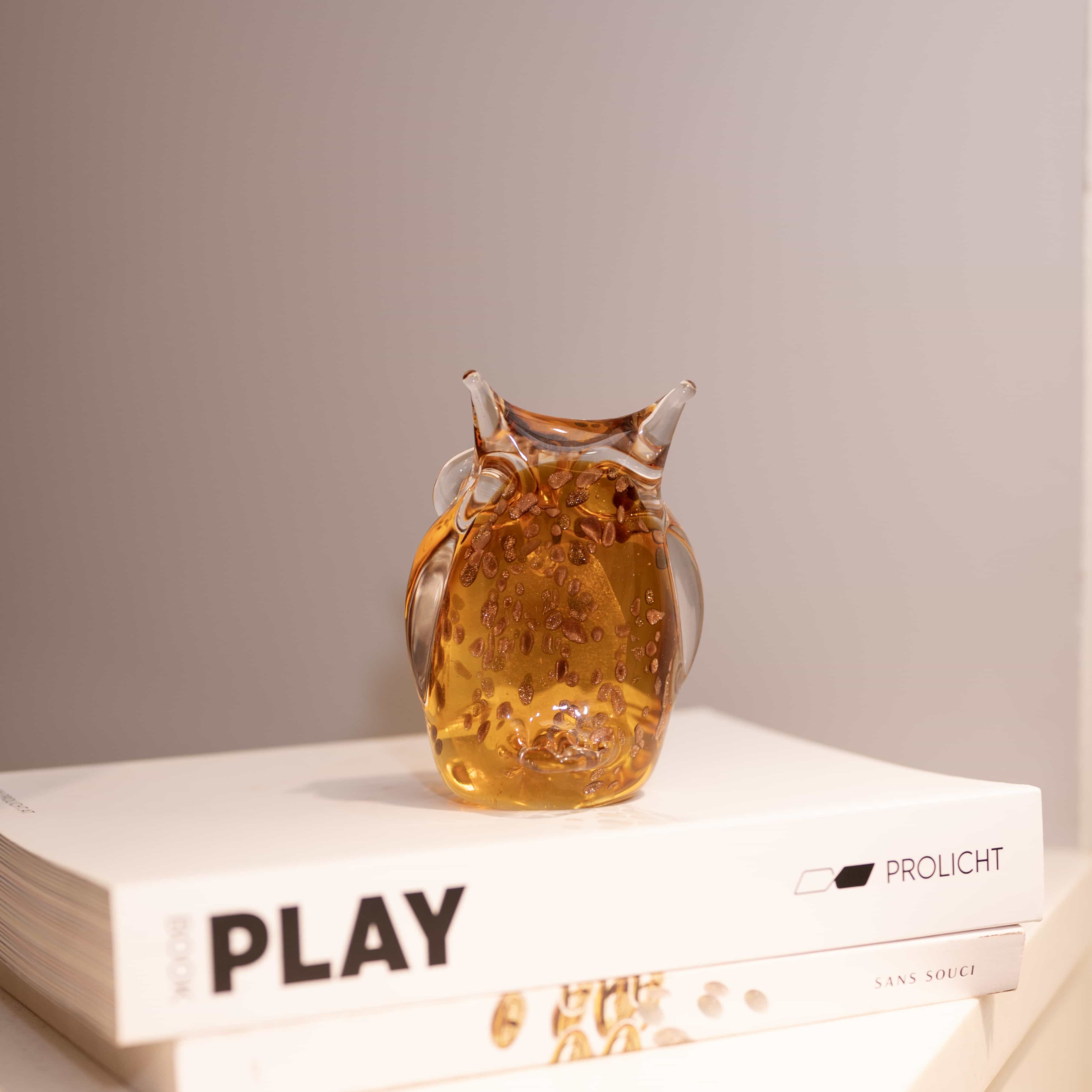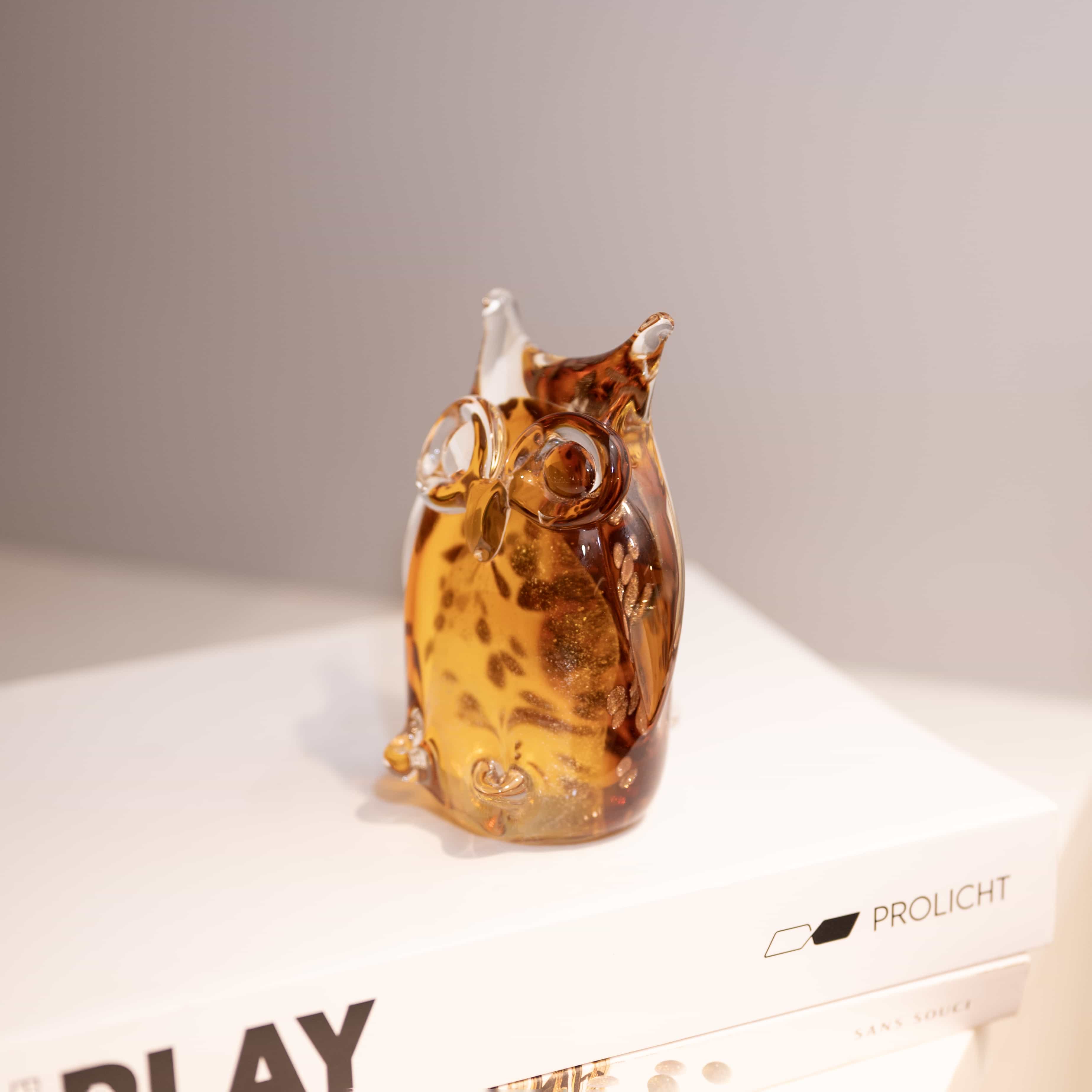 Amber is a beautifully detailed glass owl sculpture, blending warm honey tones with a textured finish that catches the light. Its compact form makes it perfect for shelves, desks, or curated displays, adding character and charm to any setting.