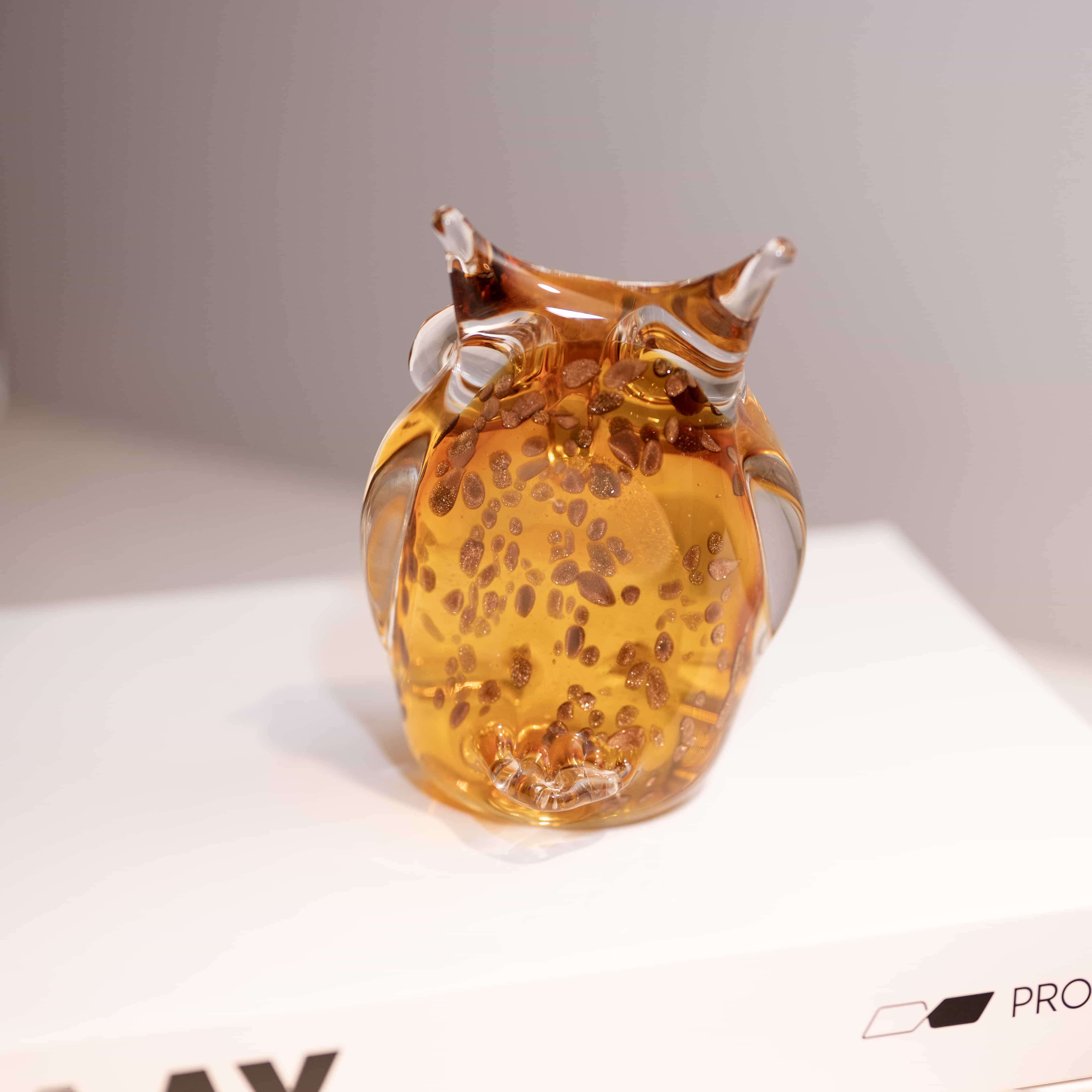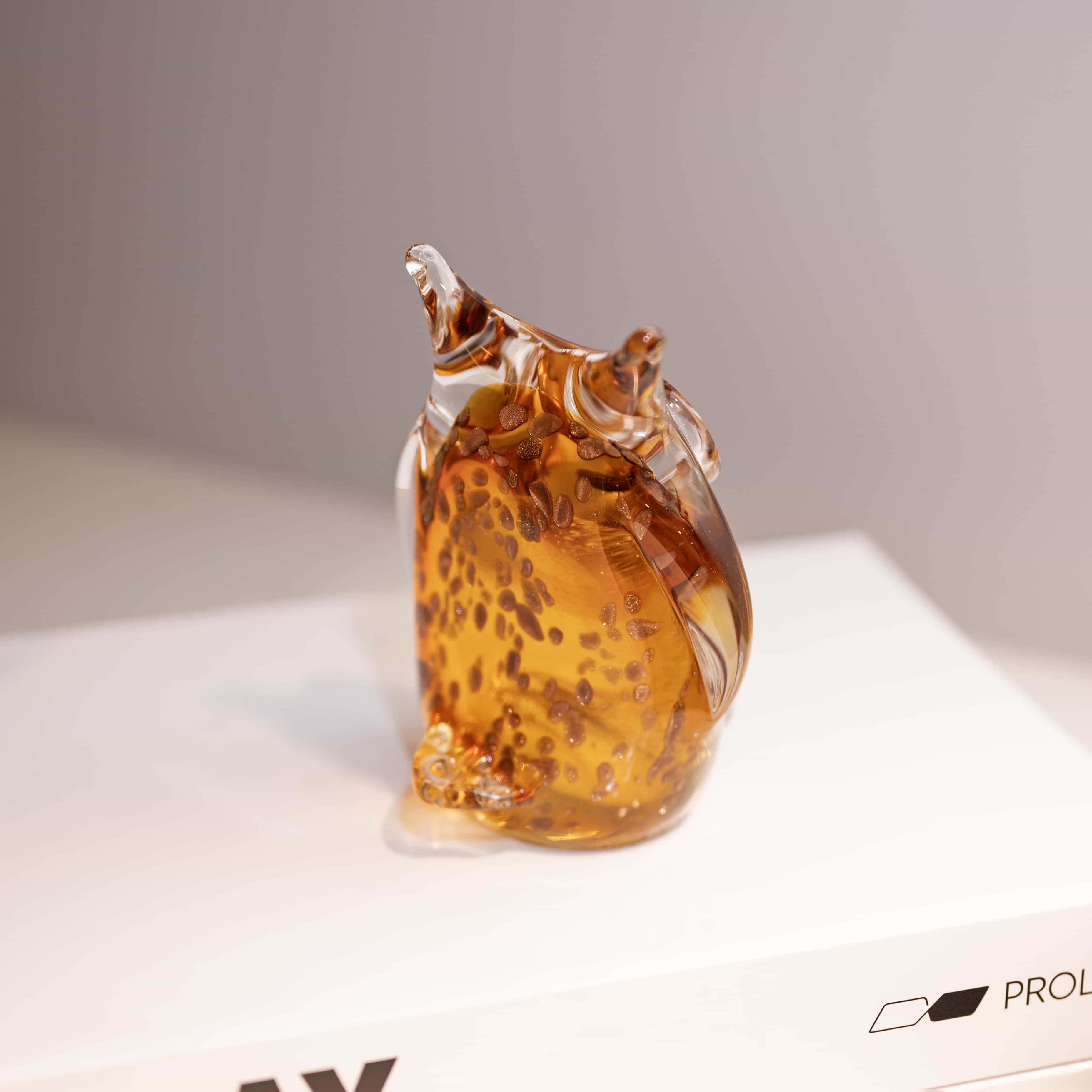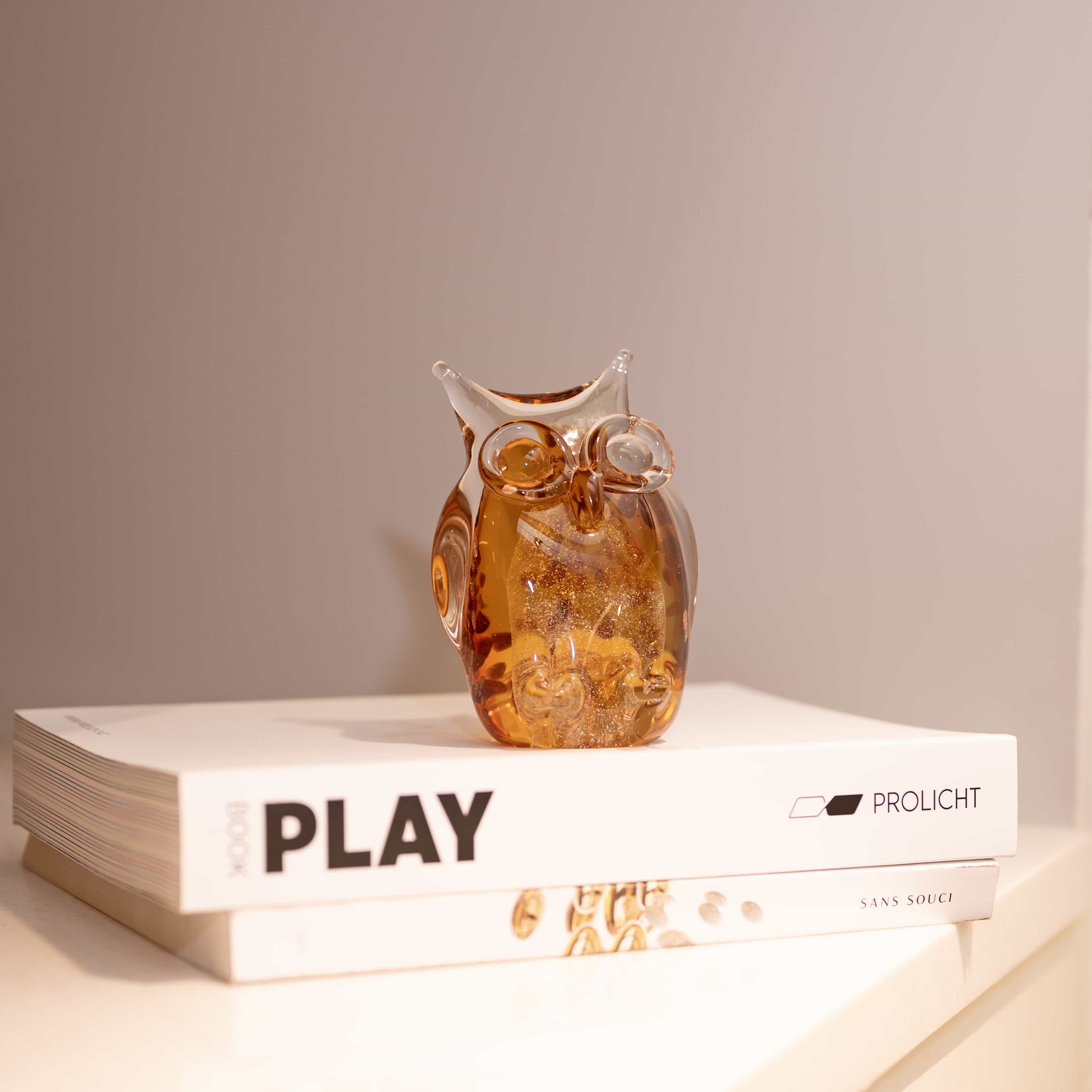 Amber is a beautifully detailed glass owl sculpture, blending warm honey tones with a textured finish that catches the light. Its compact form makes it perfect for shelves, desks, or curated displays, adding character and charm to any setting.