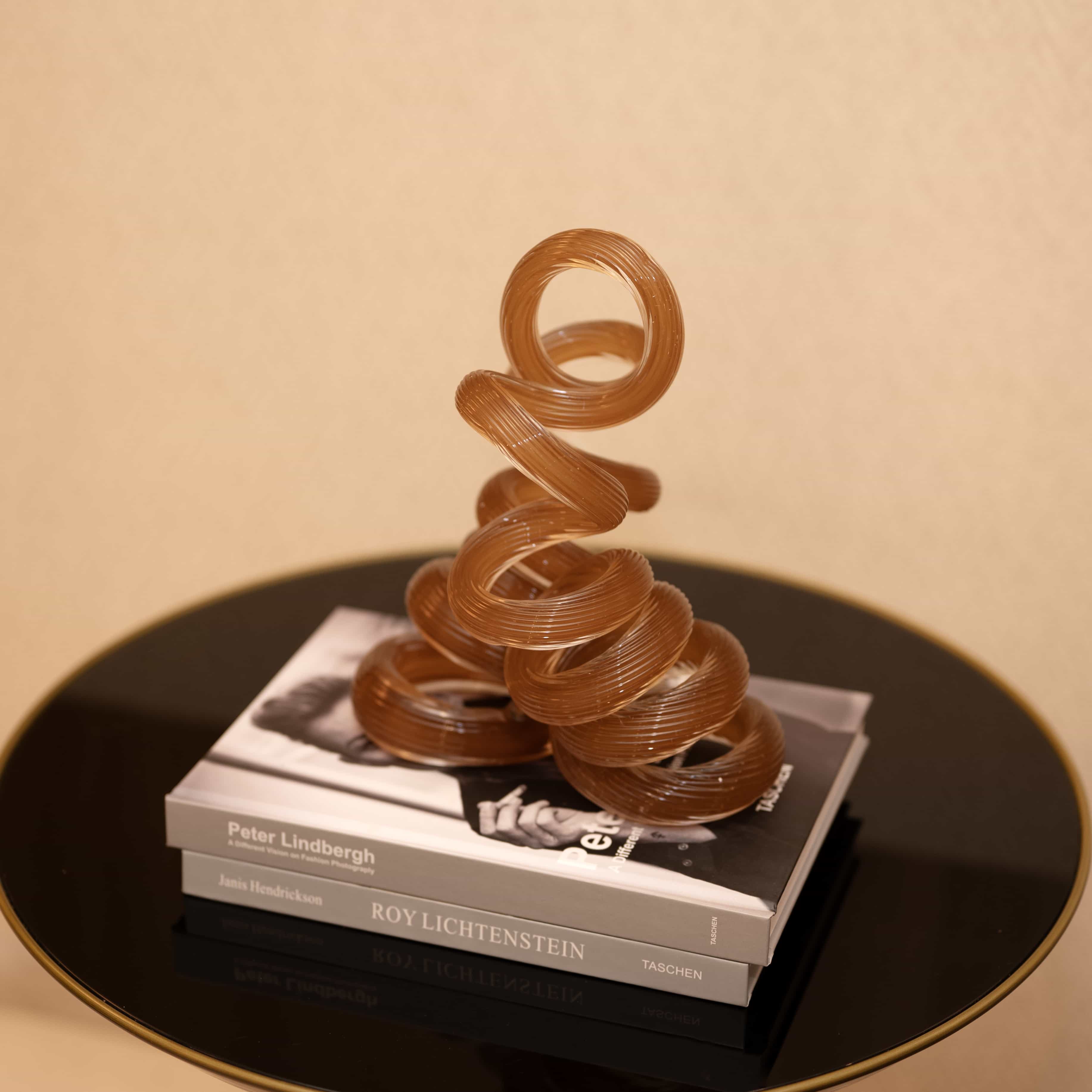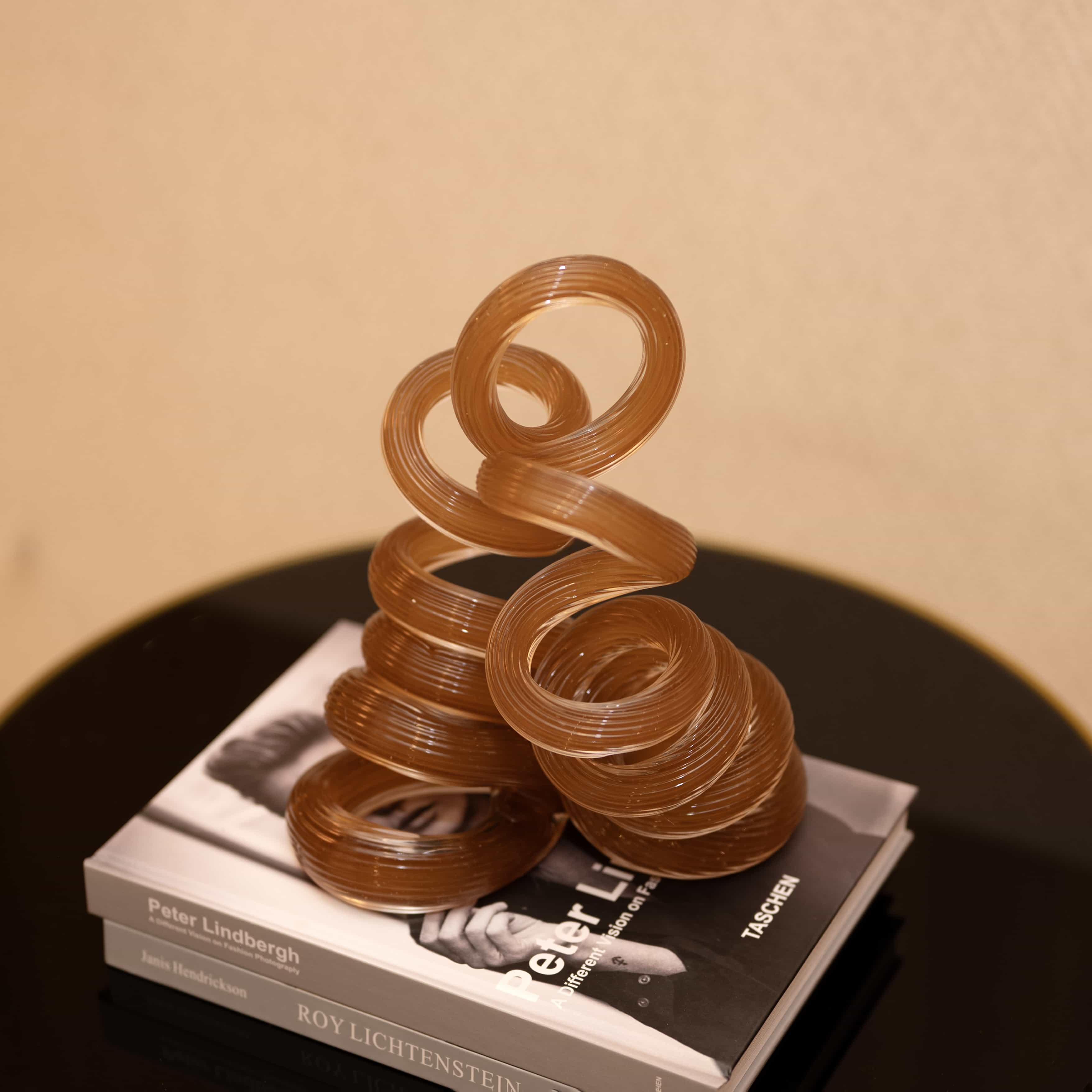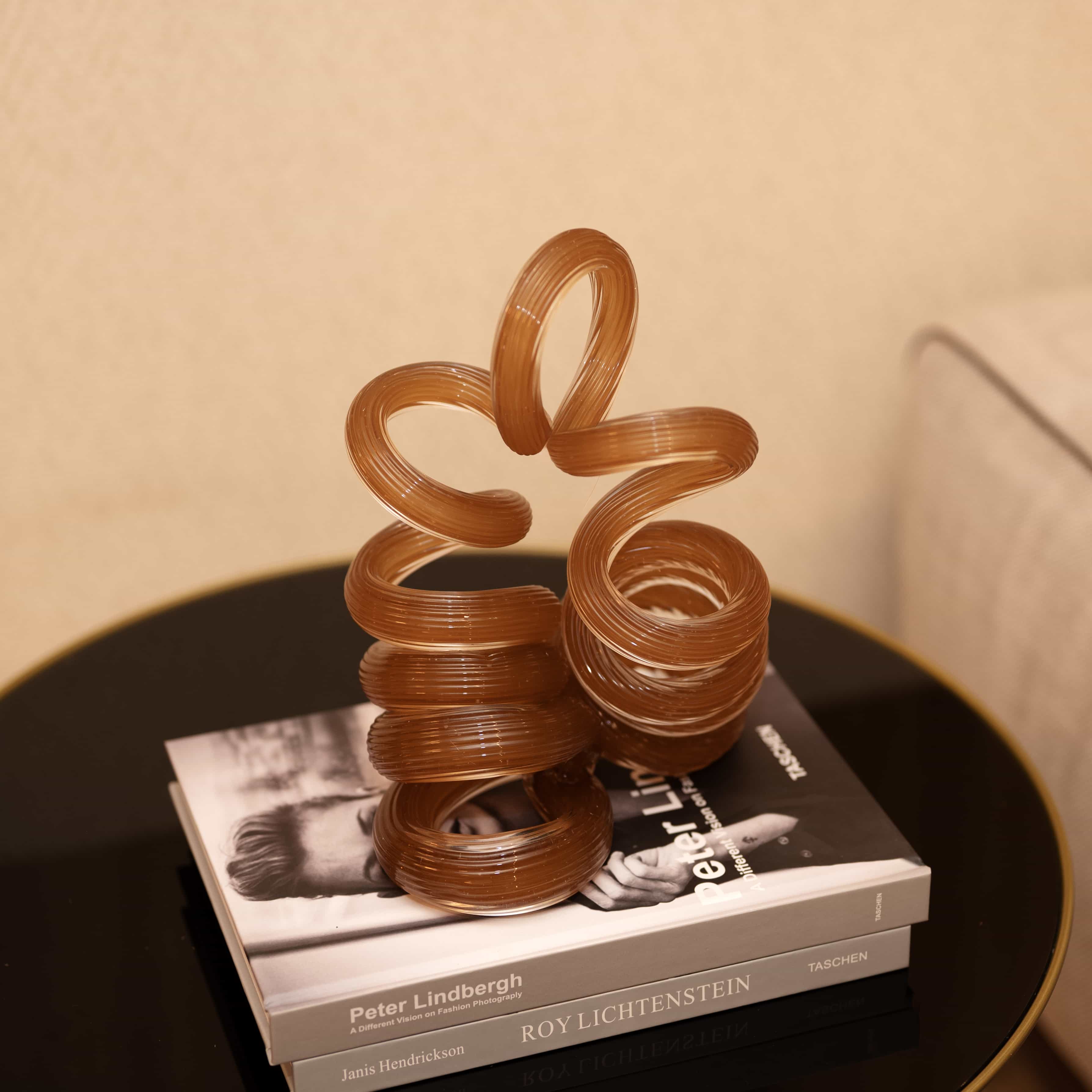 Amber Whirl is a captivating glass tabletop decor piece in warm amber tones, shaped in fluid, looping curves. Its artistic form brings a touch of modern elegance, making it an eye-catching statement for any living or workspace.