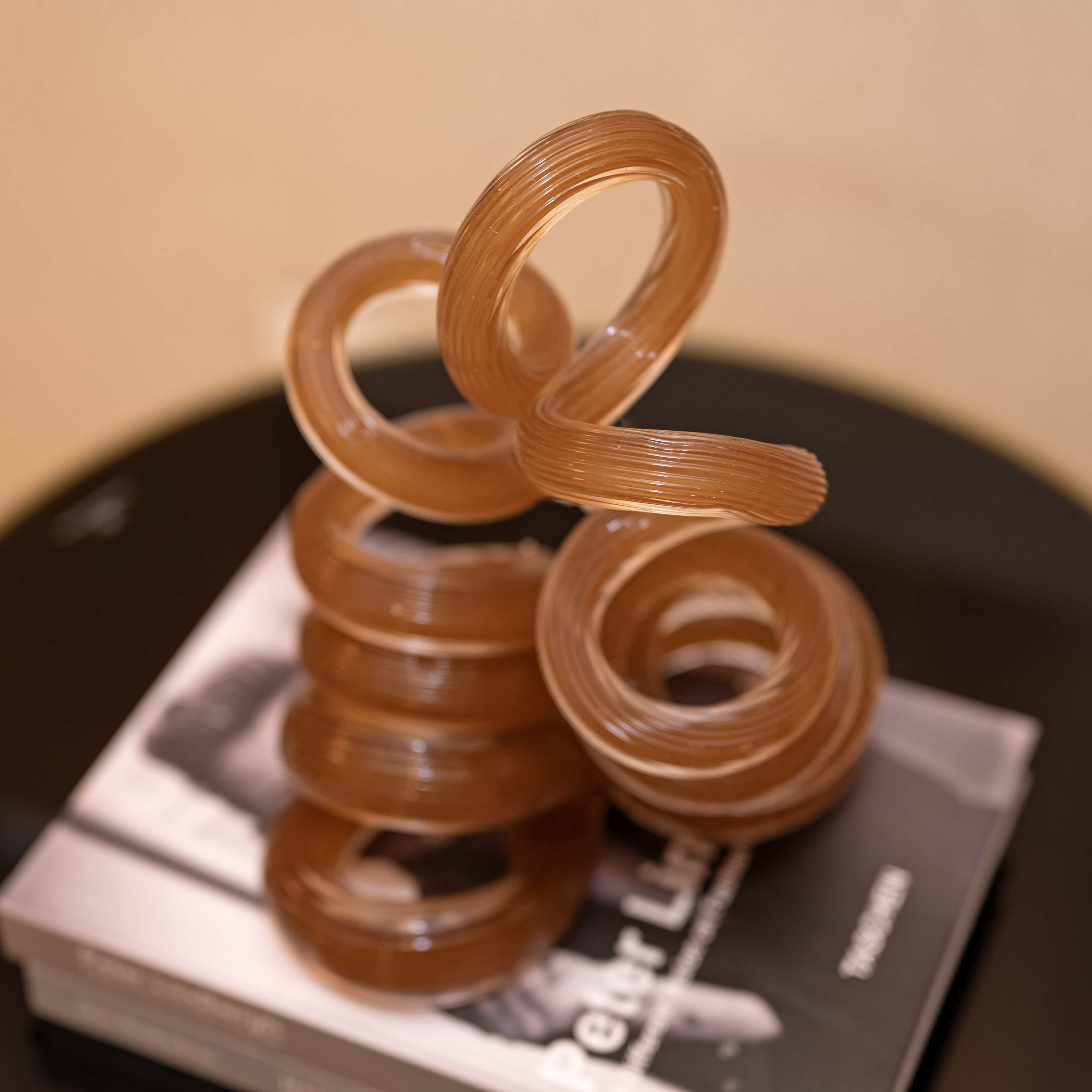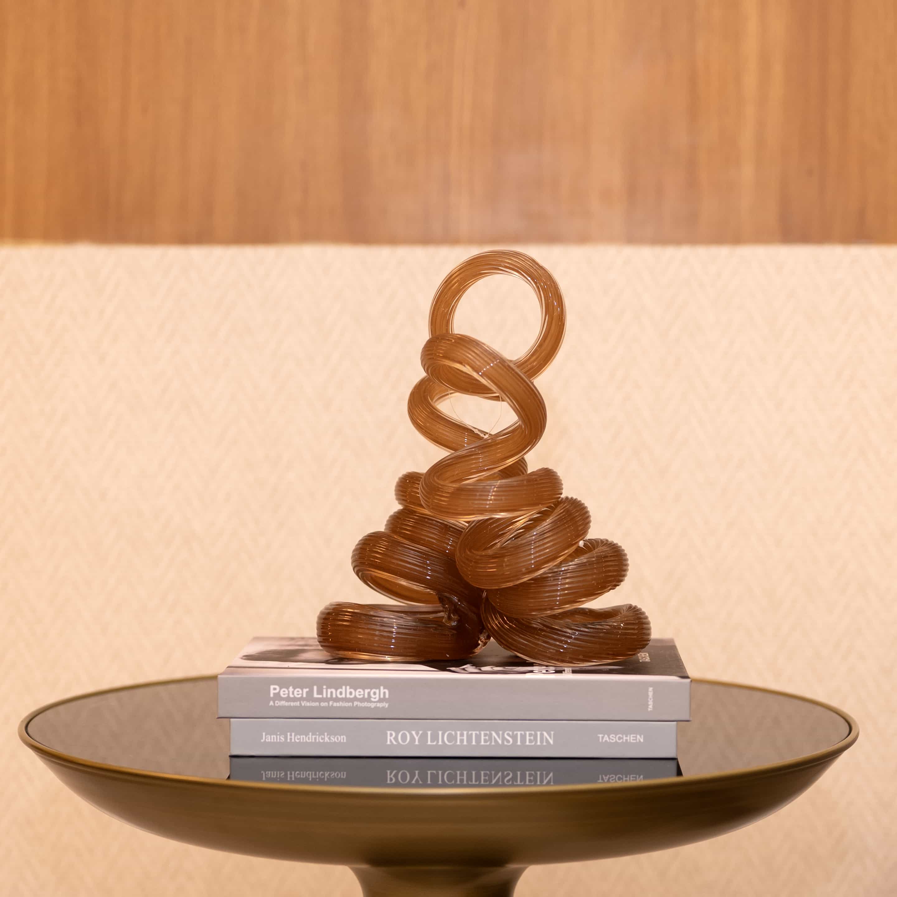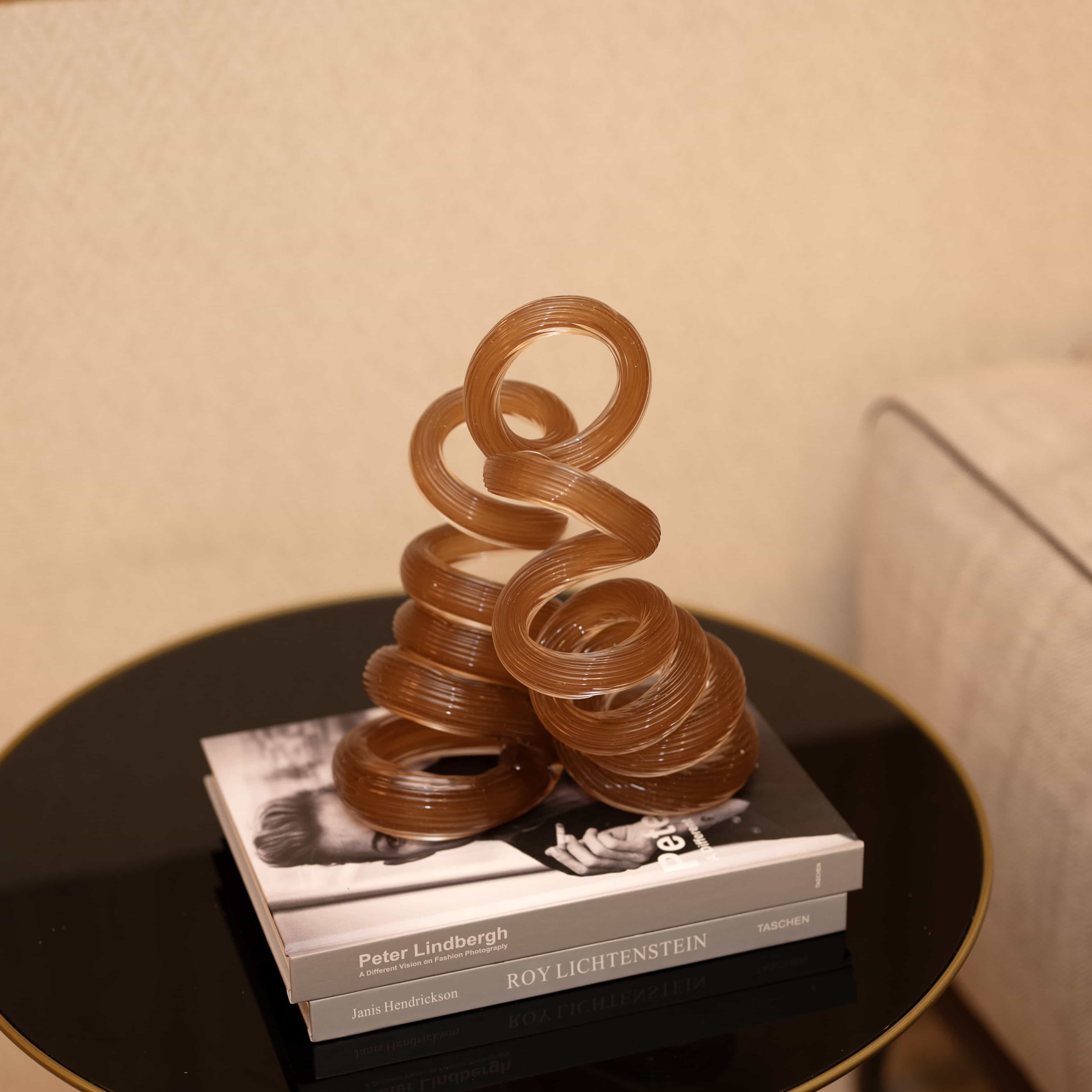 Amber Whirl is a captivating glass tabletop decor piece in warm amber tones, shaped in fluid, looping curves. Its artistic form brings a touch of modern elegance, making it an eye-catching statement for any living or workspace.