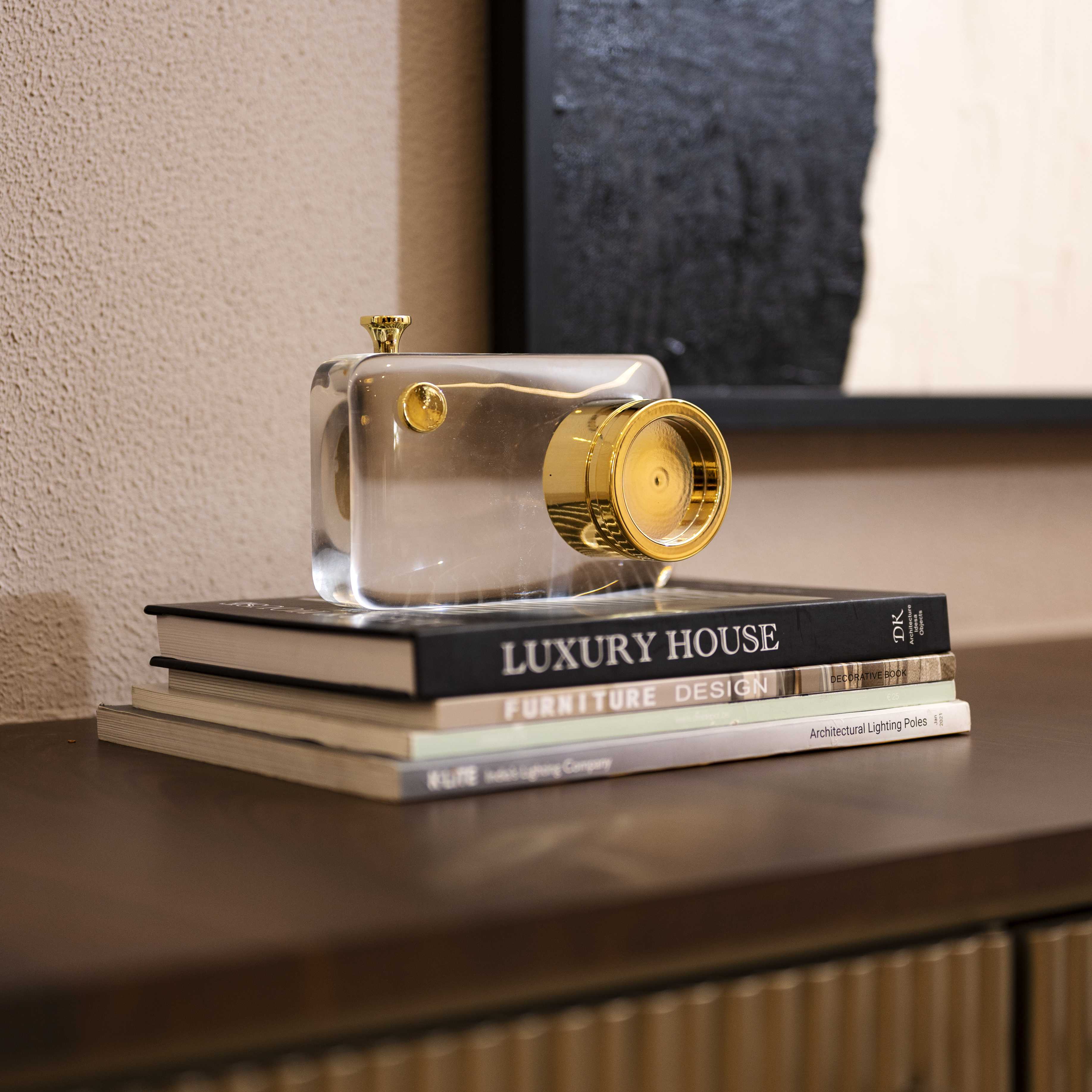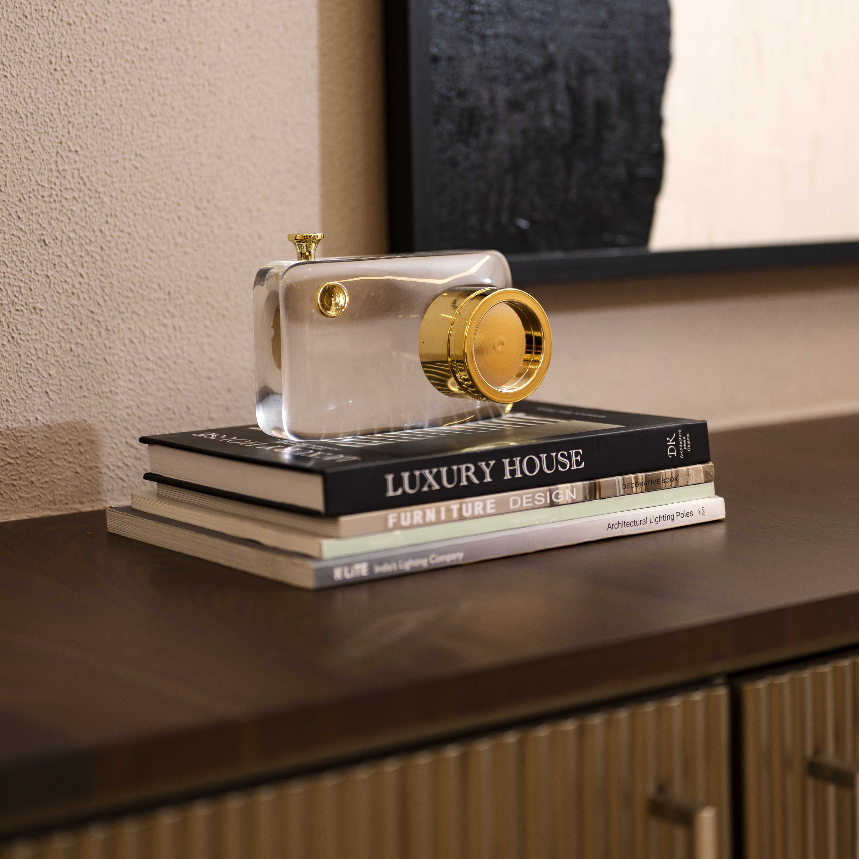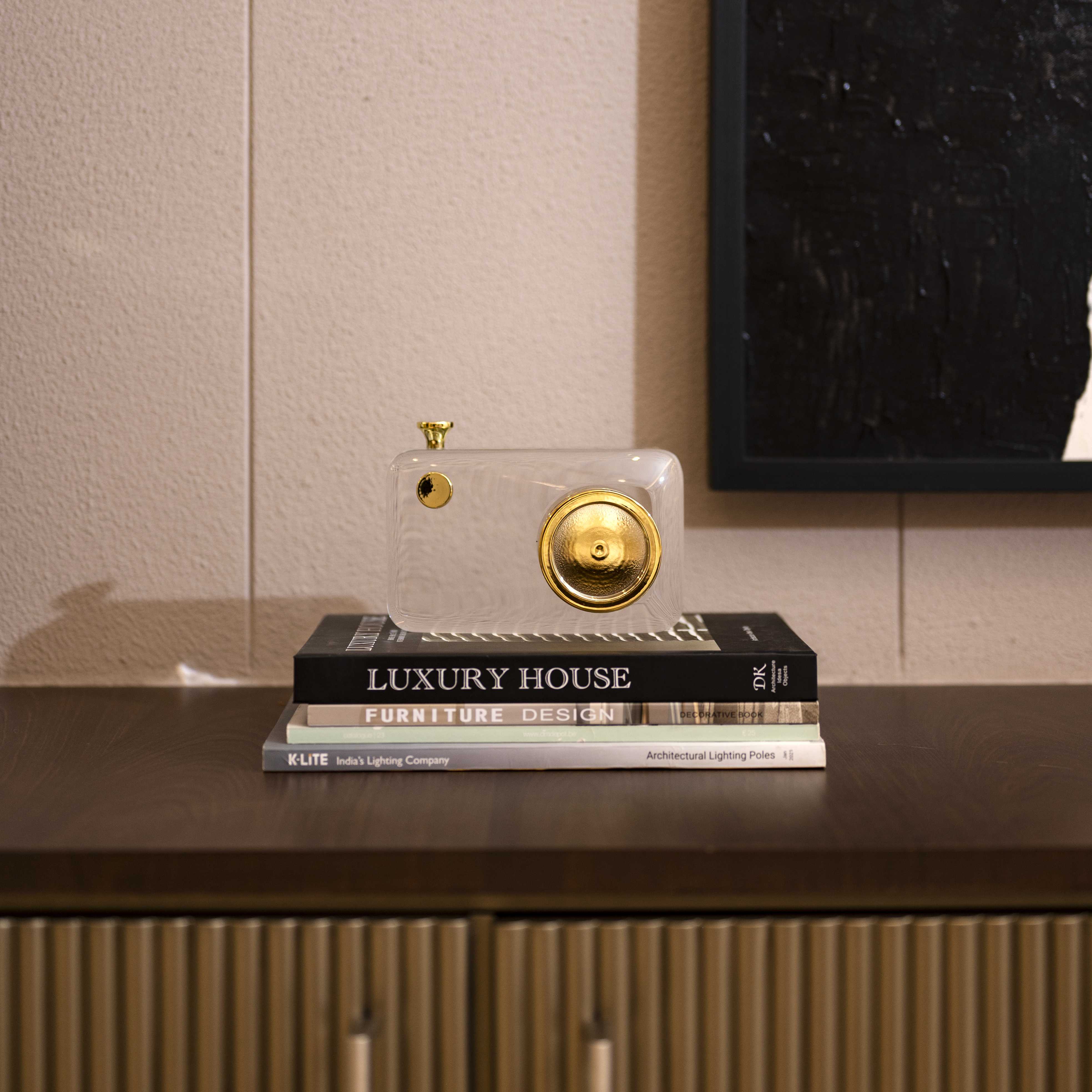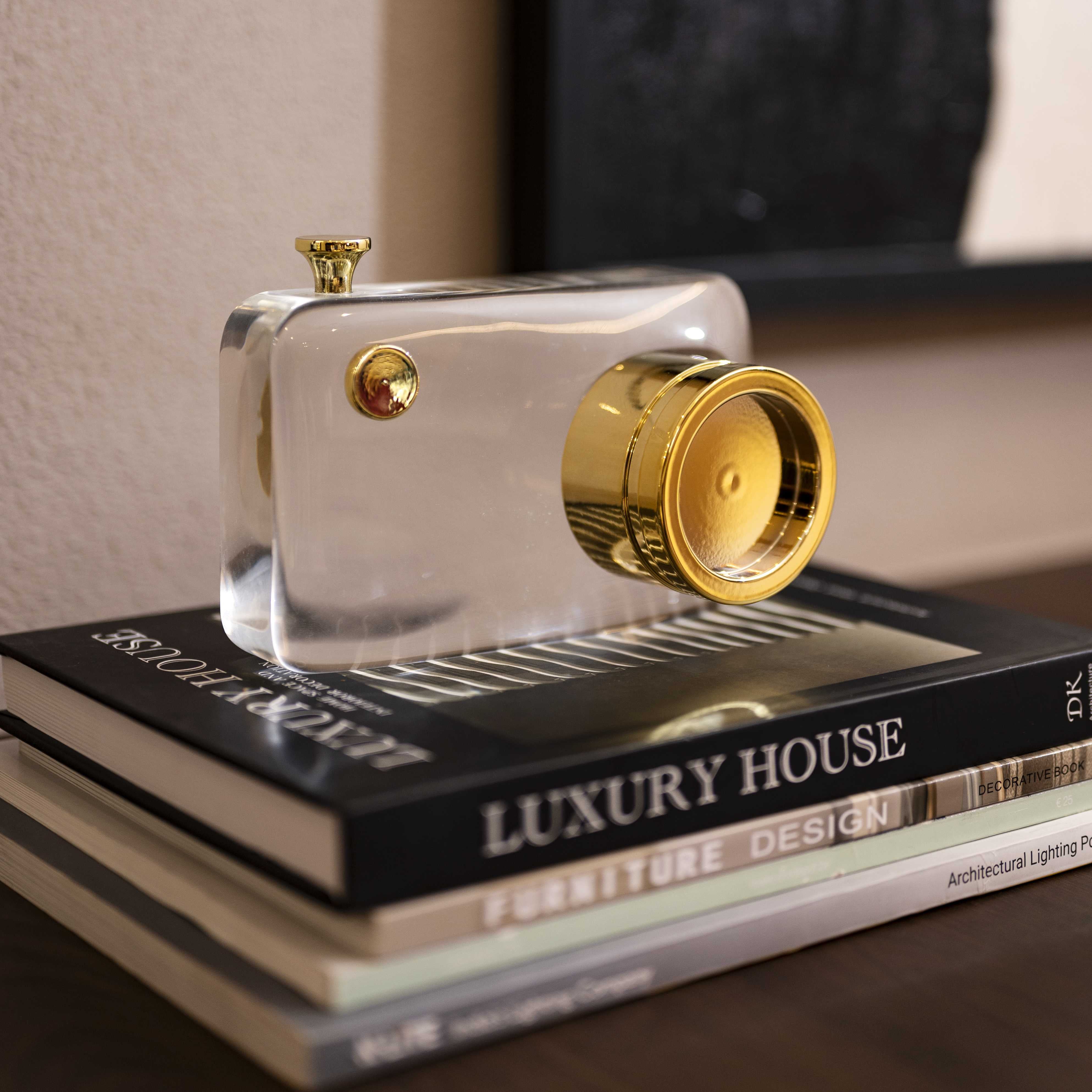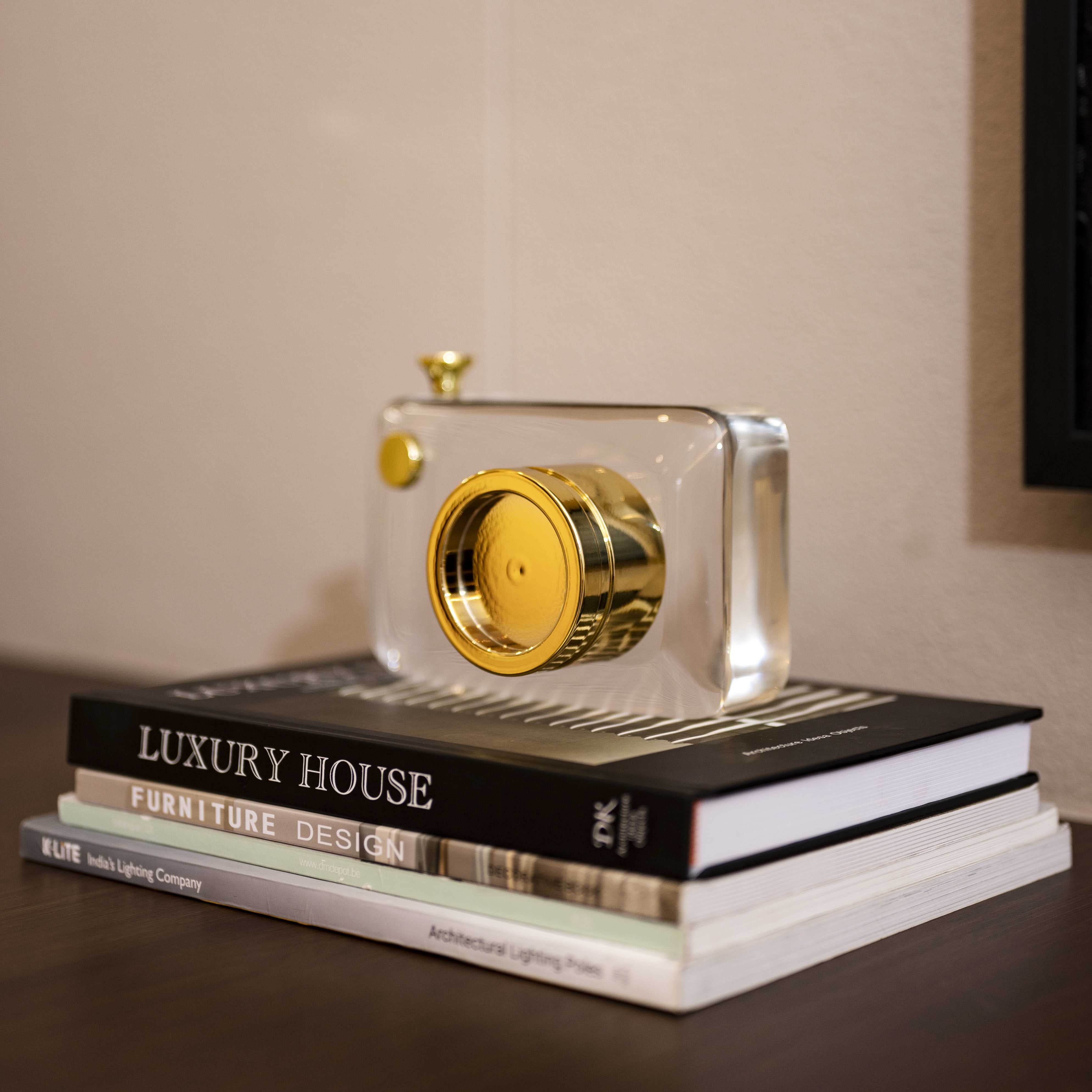 And Click is a transparent glass camera curio with limited gold detailing. This piece would be the perfect gift for someone that enjoys photography and likes incorporating elements of the same in their environment. the glass makes this piece unique and pinteresty!