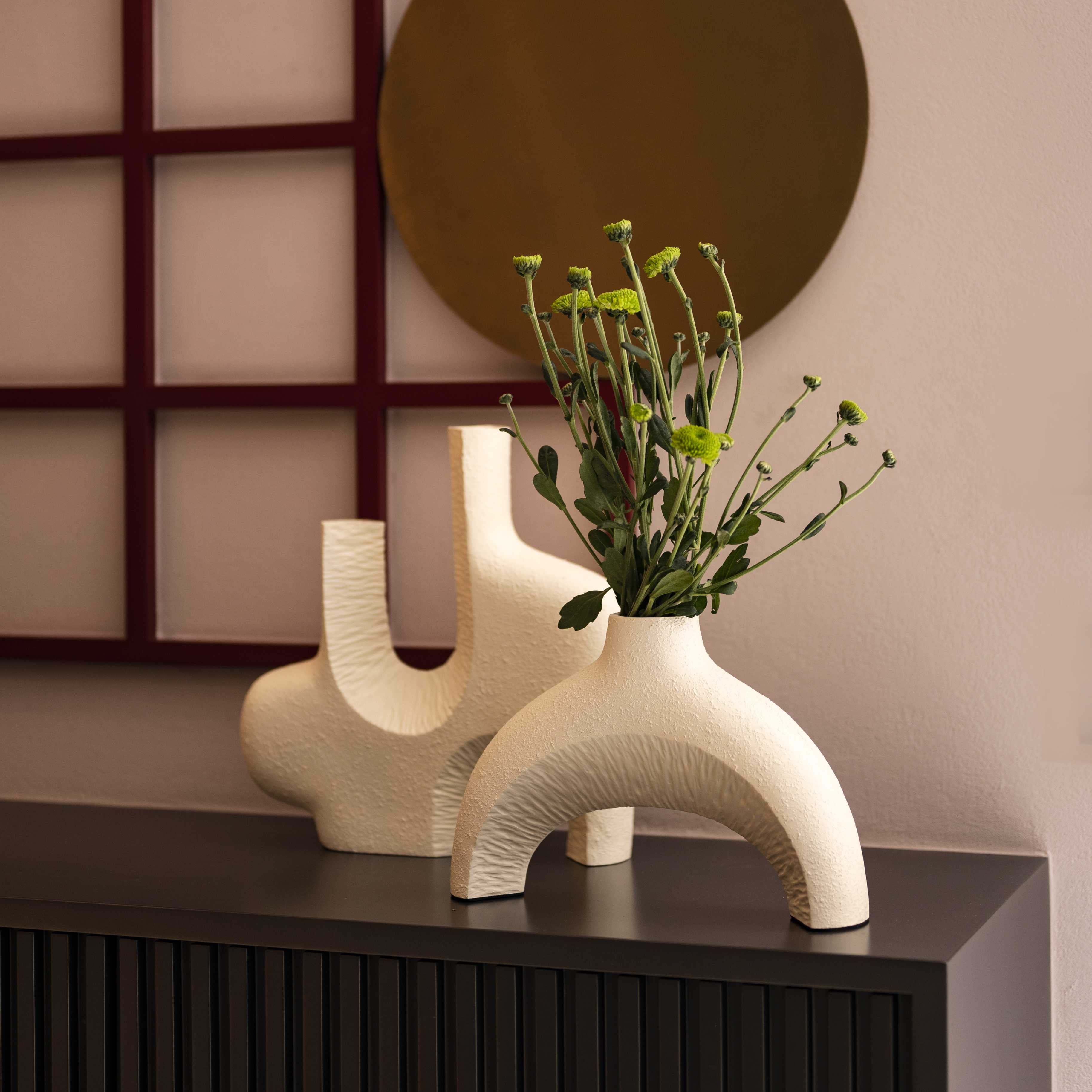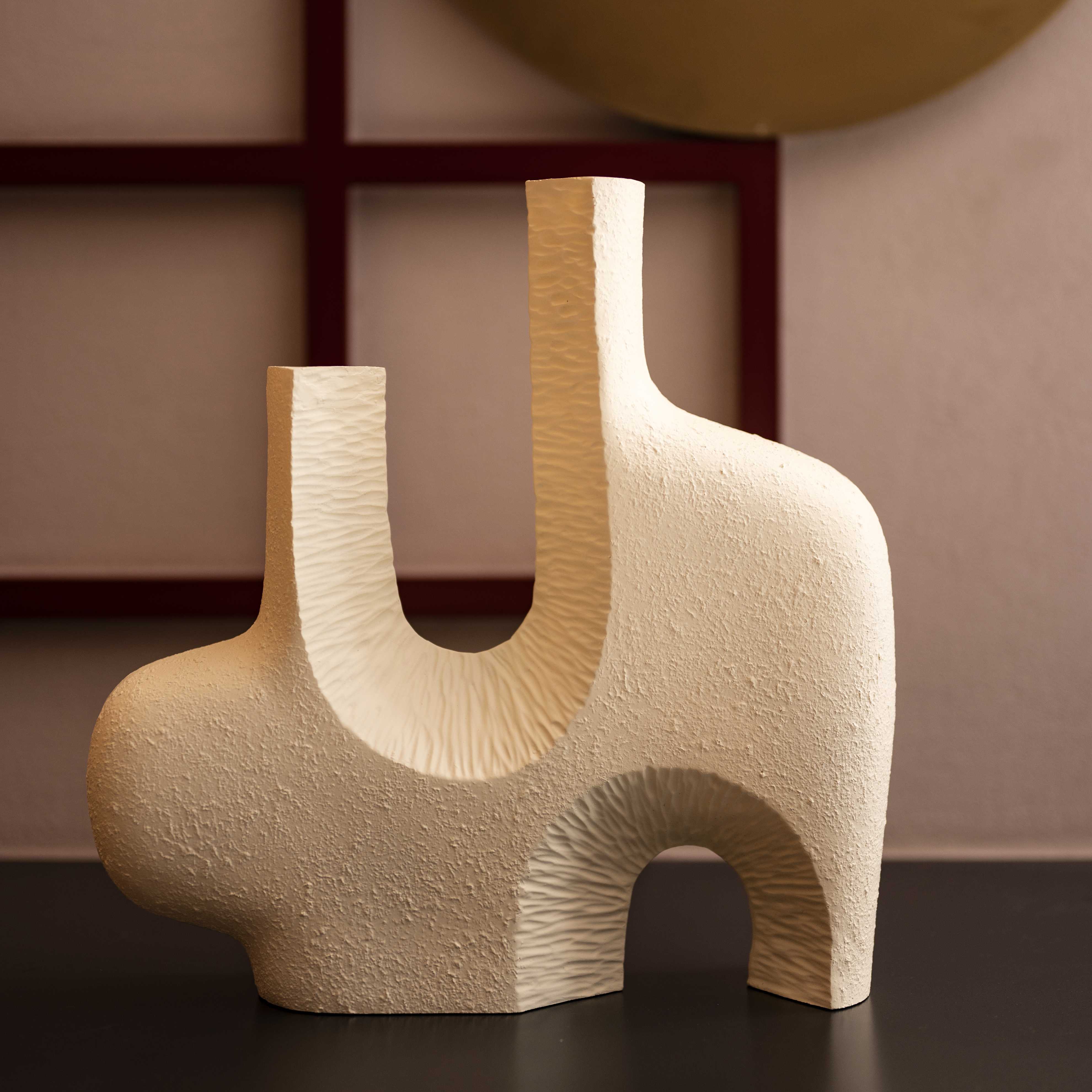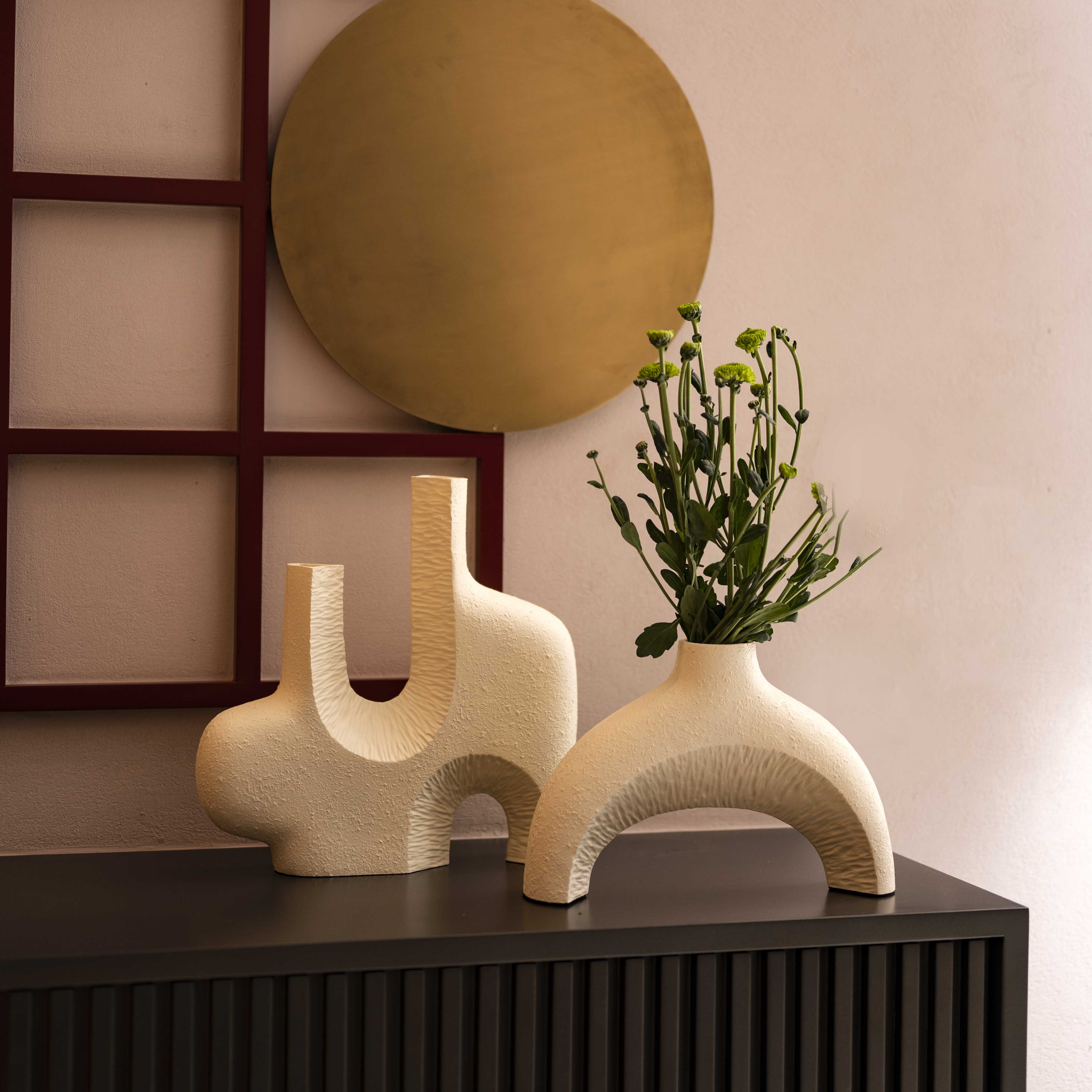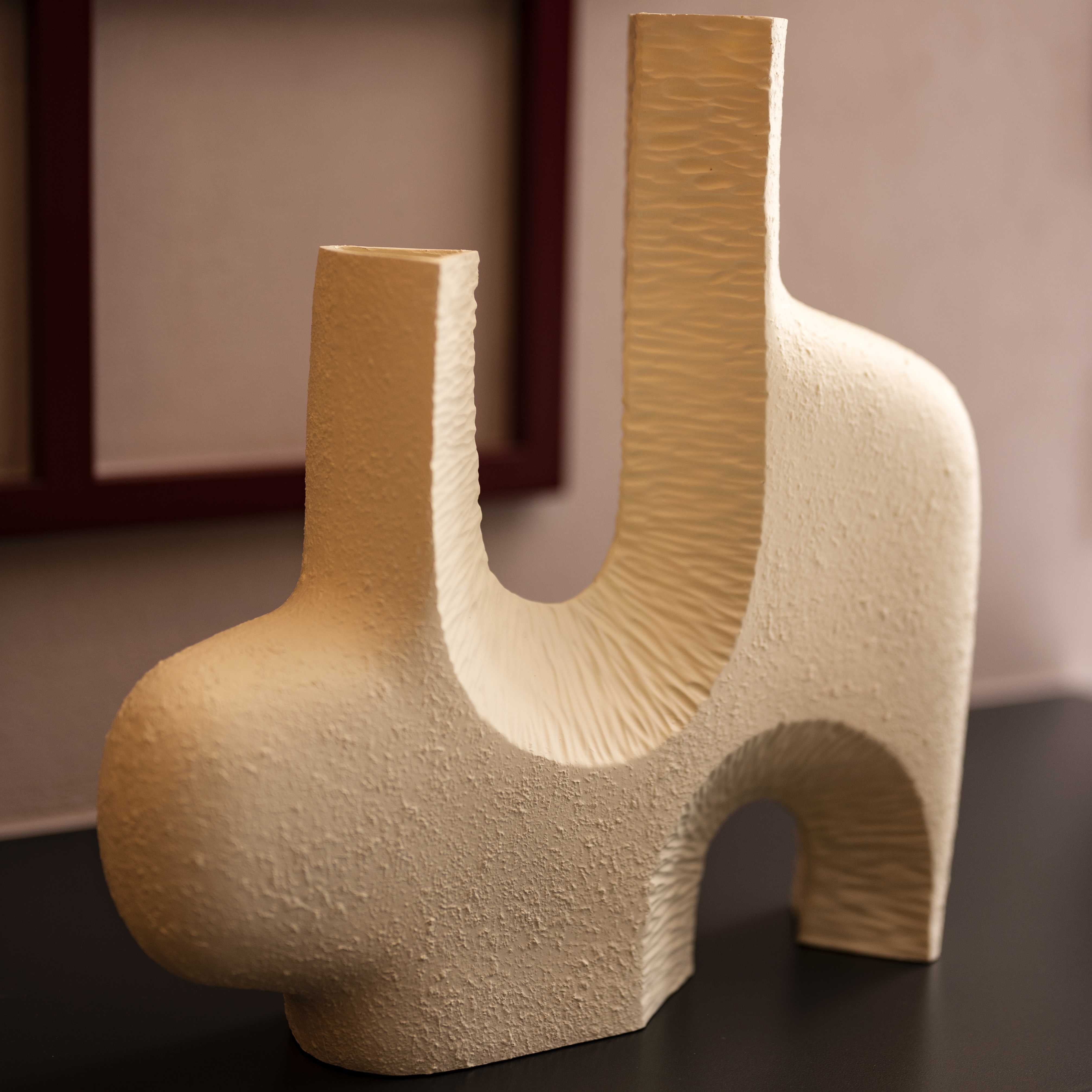 Avant area set of two stunning vases. This piece is abstract, raw and almost reminds you of the beach. These pieces with a few stems of colorful blooms, would bring in a lot of character to any corner of your space.