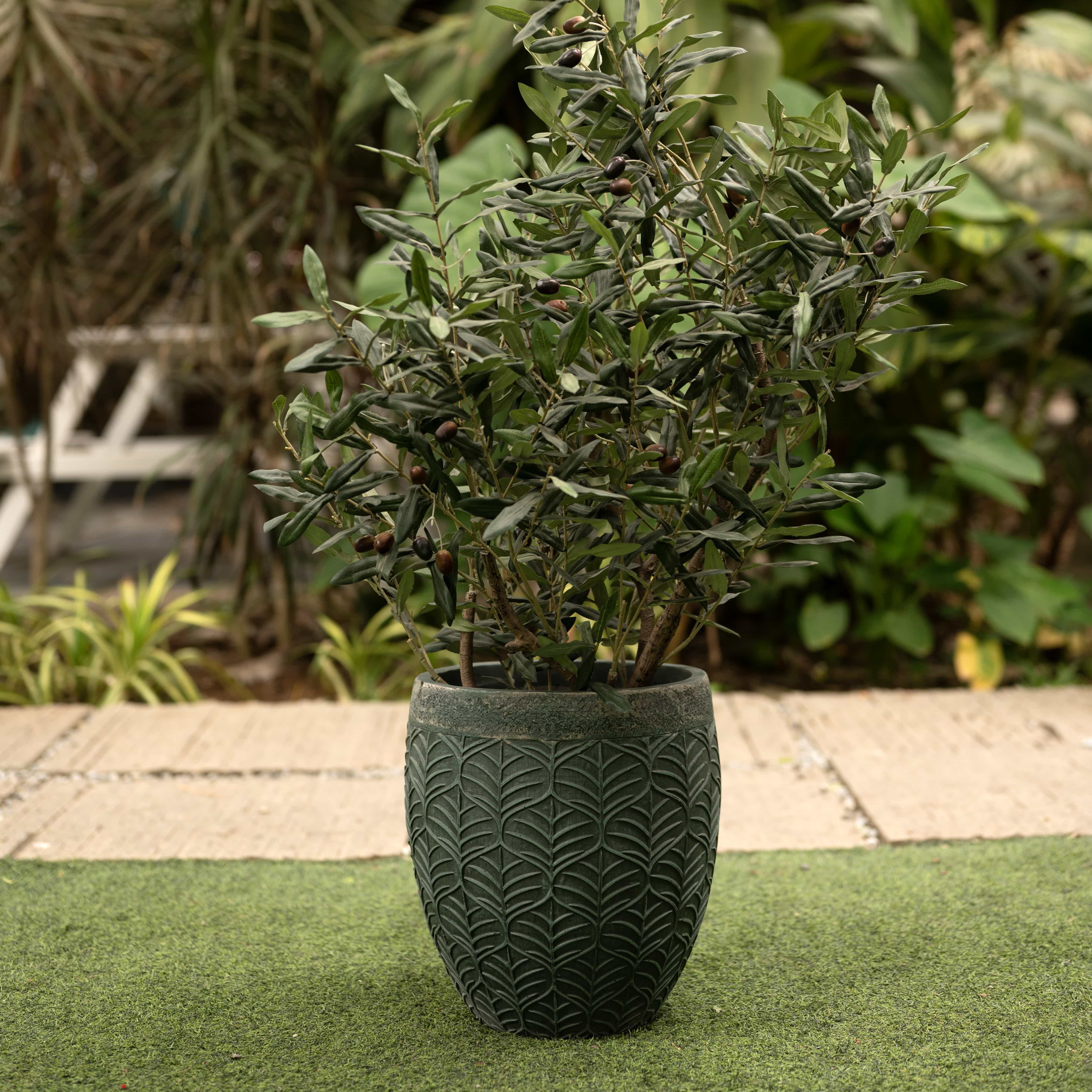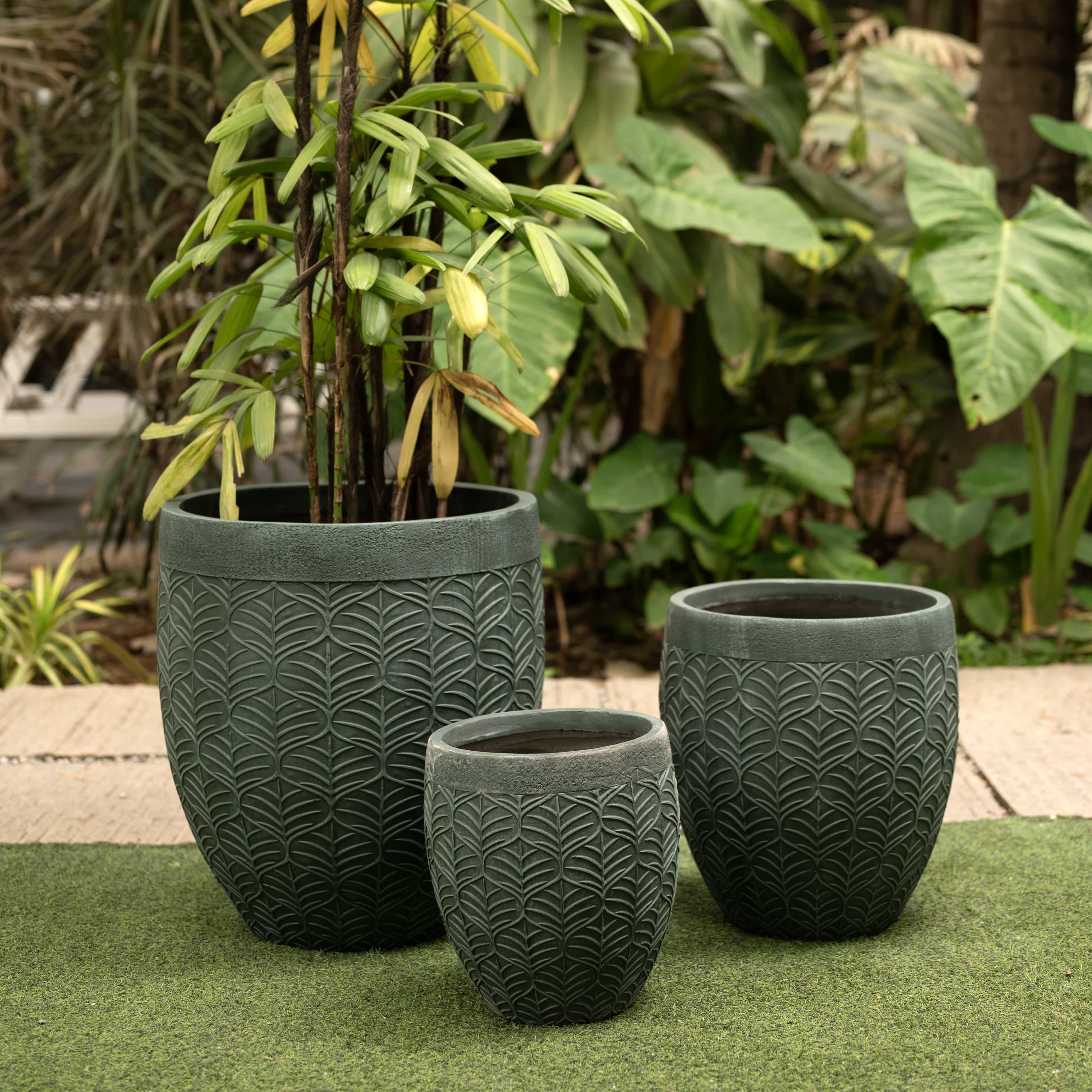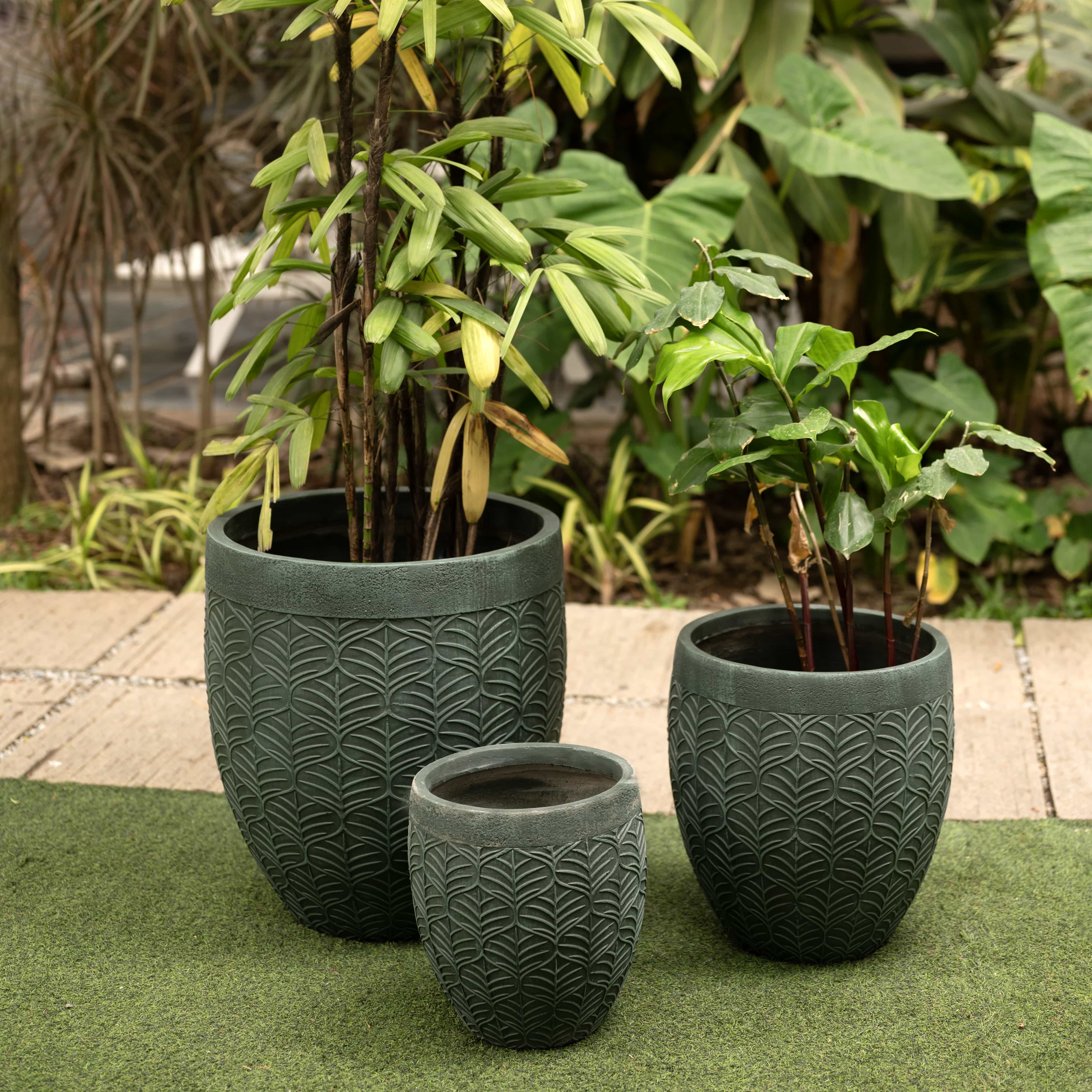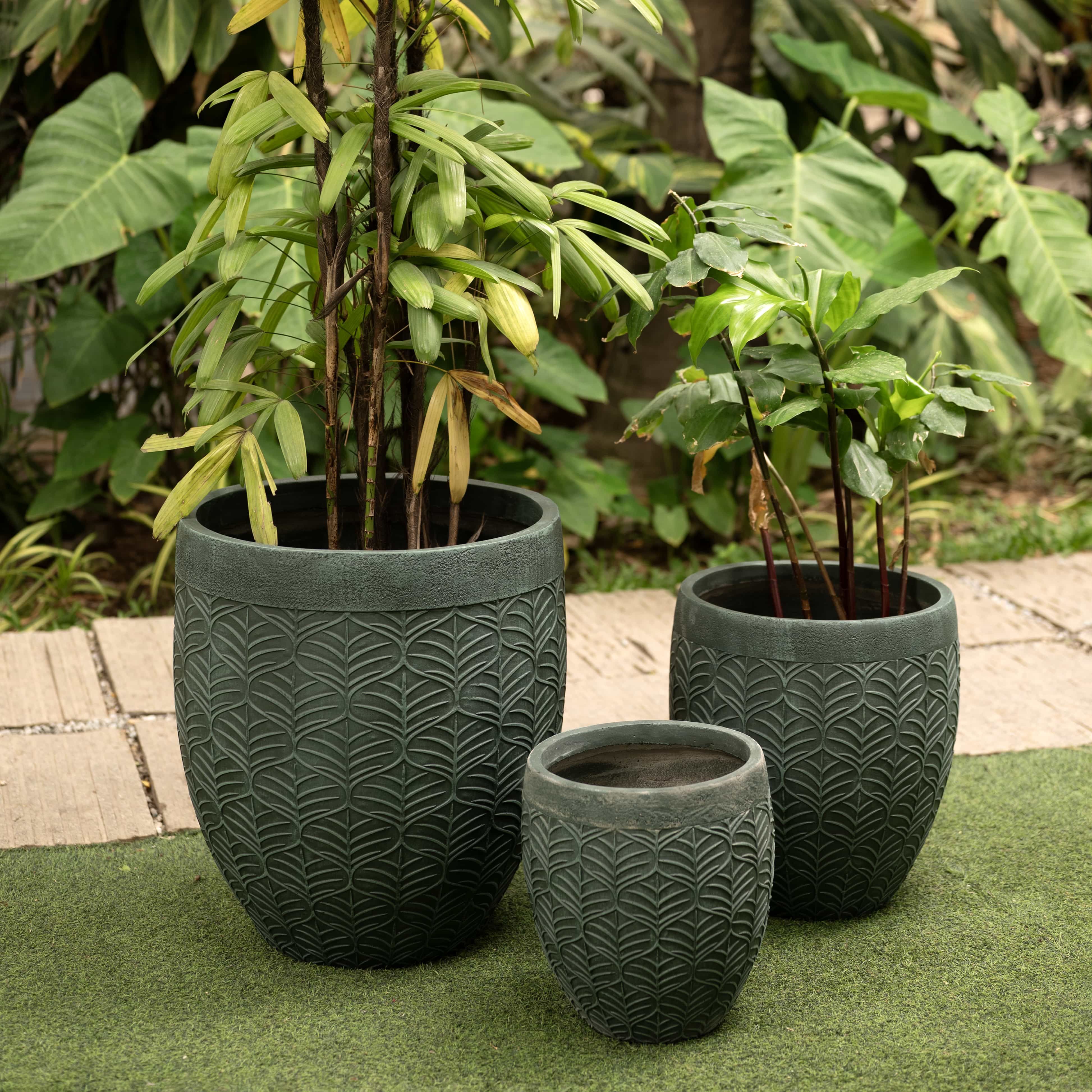 Fier is a set of three dark green cement planters that are light in weight. This set with its beautiful subtle hue of green, combined with florals would add a lot of natural aura to a space.