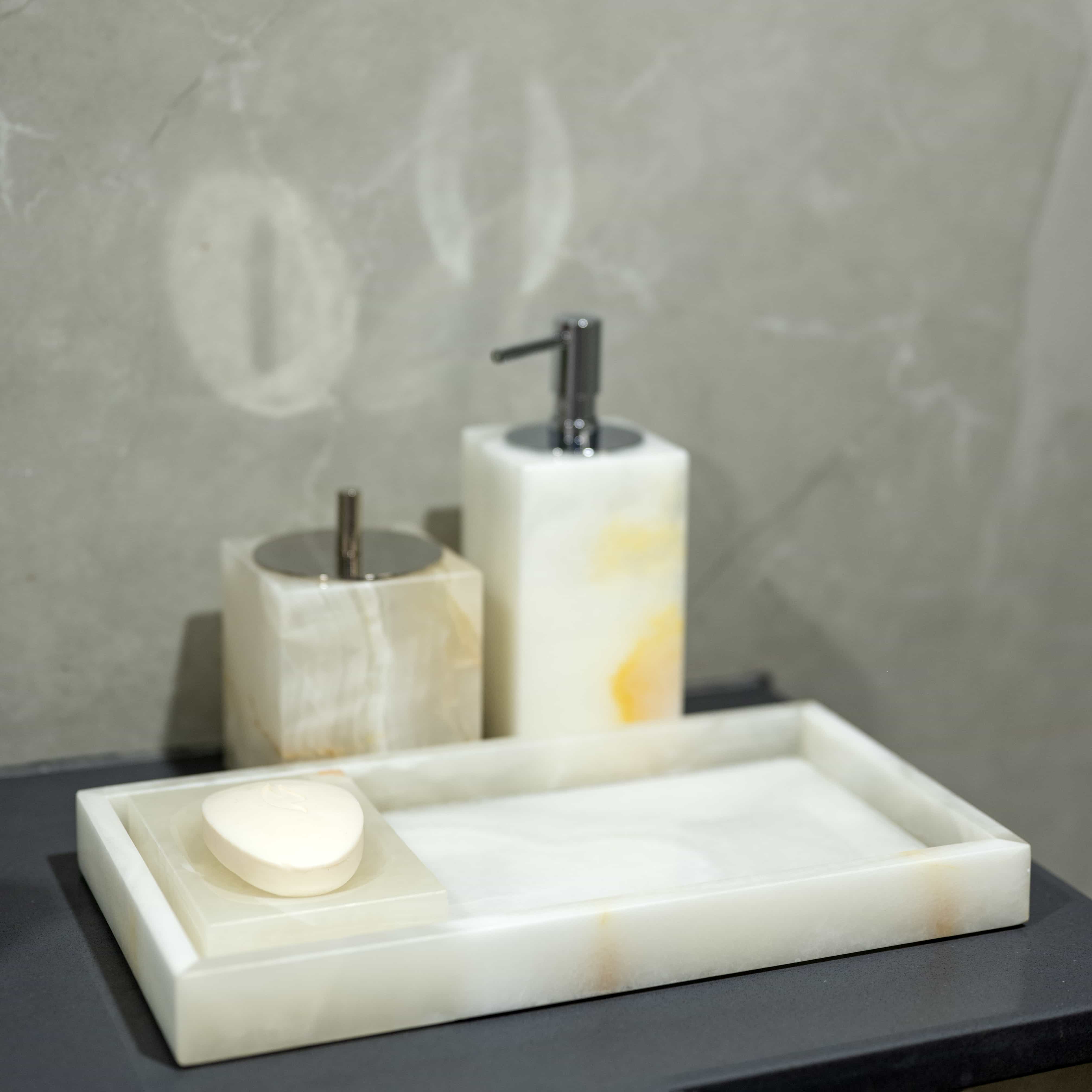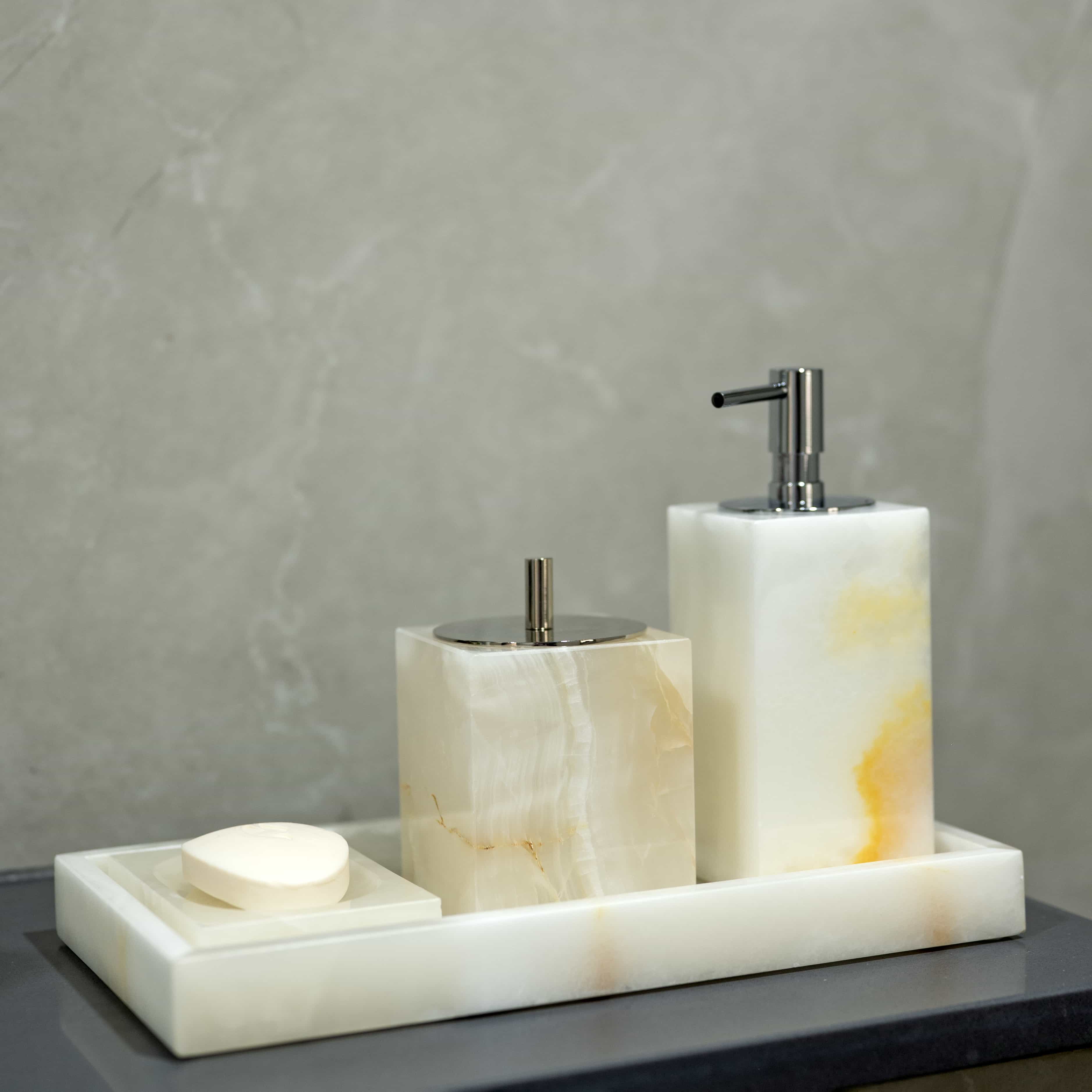 Onyx Wonderful is a set of bathroom accessories in the stunning material of white onyx. This set is everything chic, elegant and timeless. The design is minimal, and onyx allows seamless styling into any decor style.