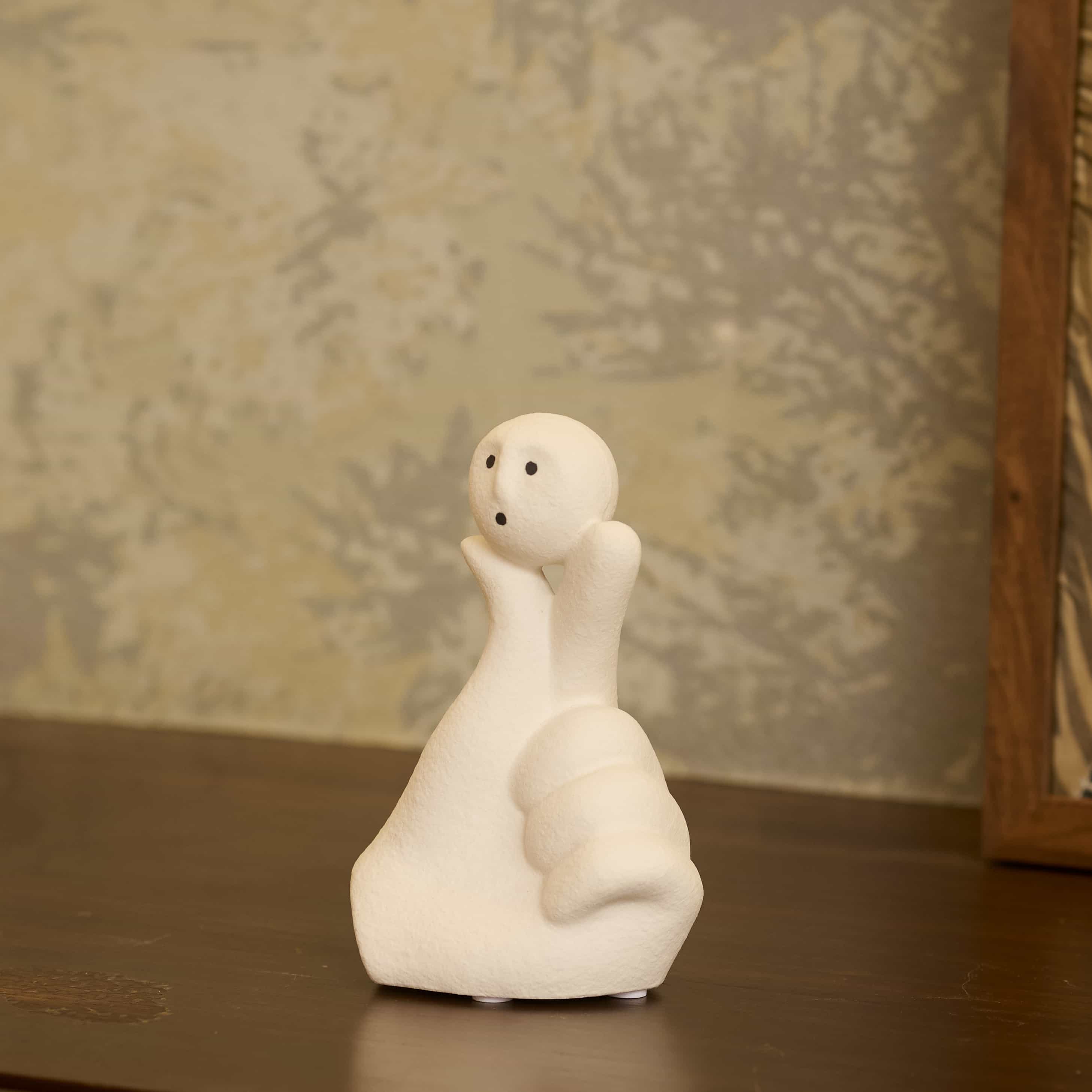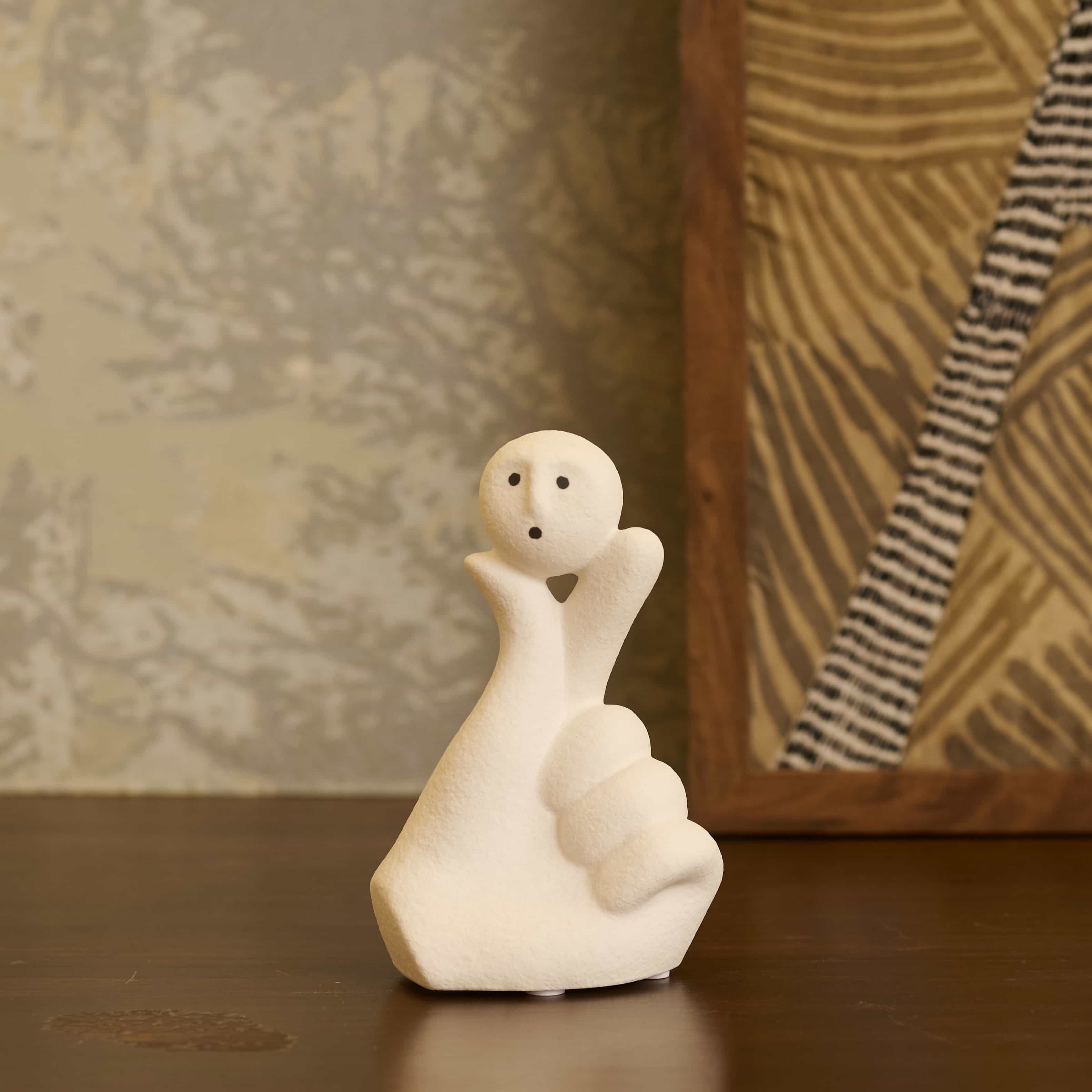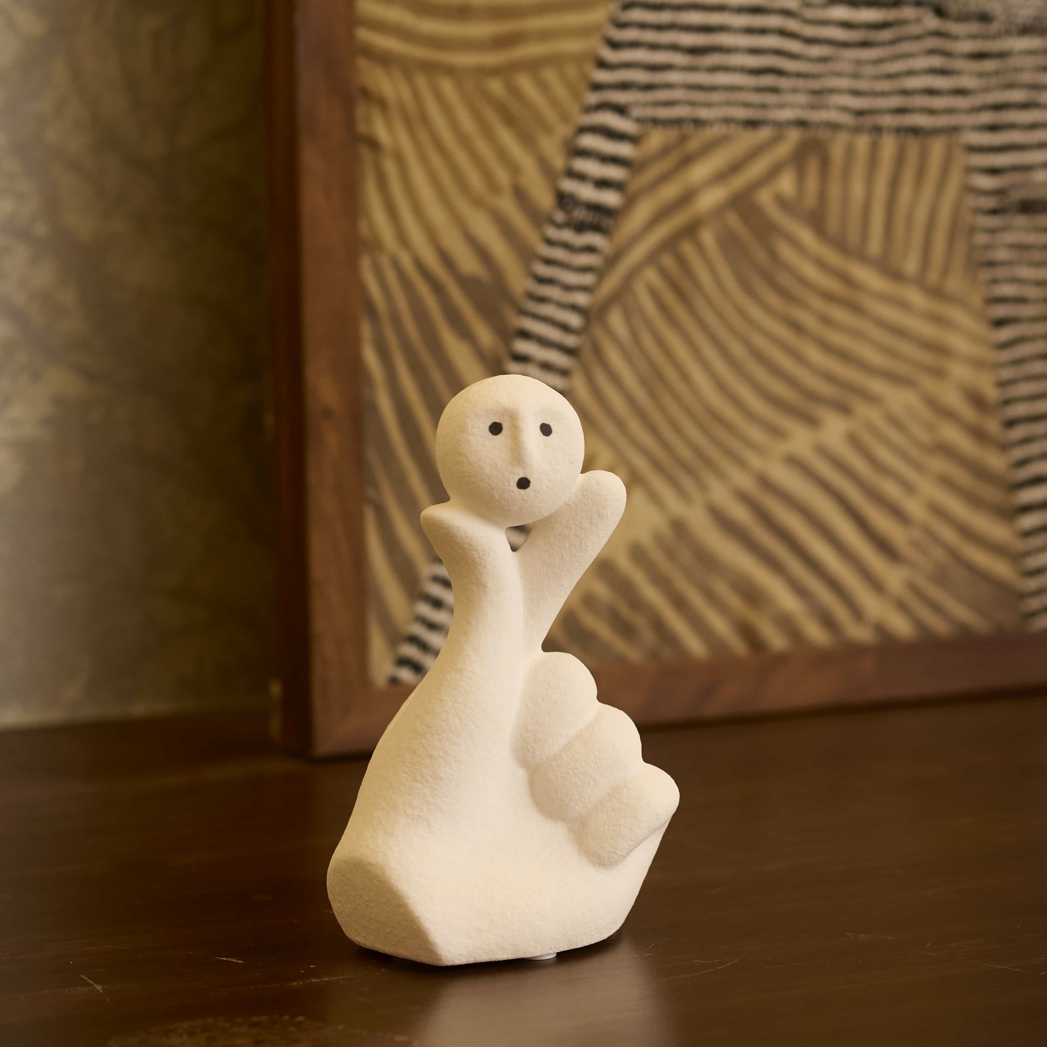 Palmstar is a playful tabletop curio, a sculpted hand cradling a round, expressive face. The matte white finish and texture feel soothing, while the upward gesture suggests encouragement, support, and a reminder hold joy gently.