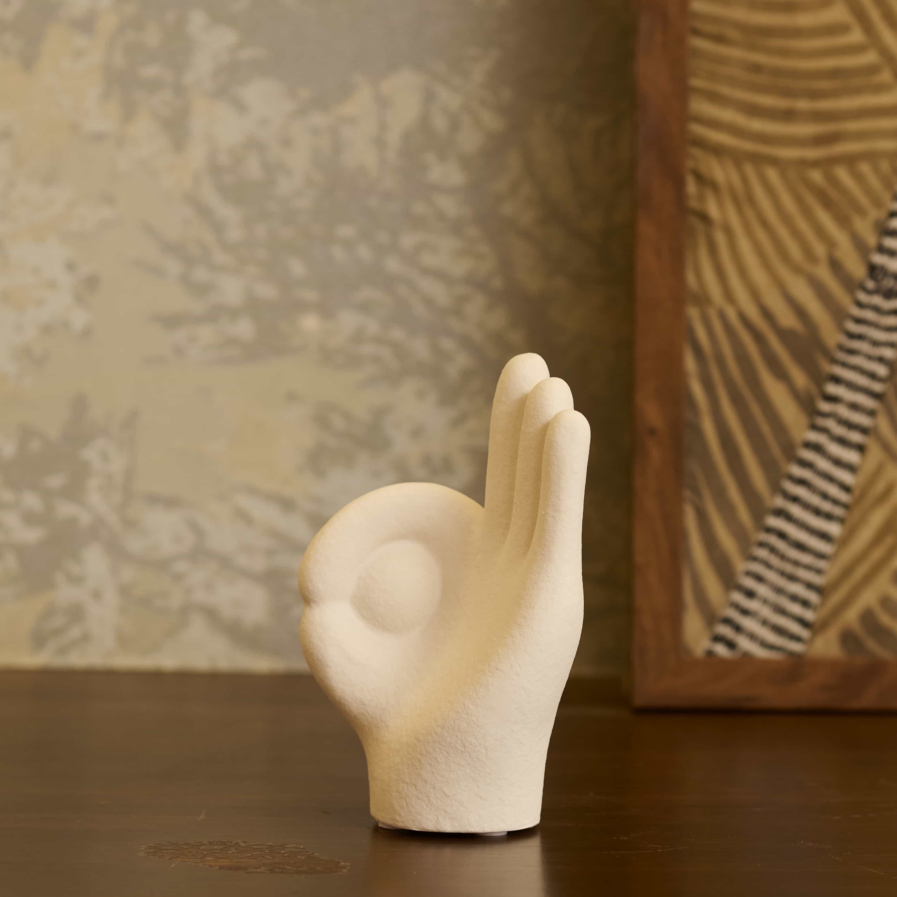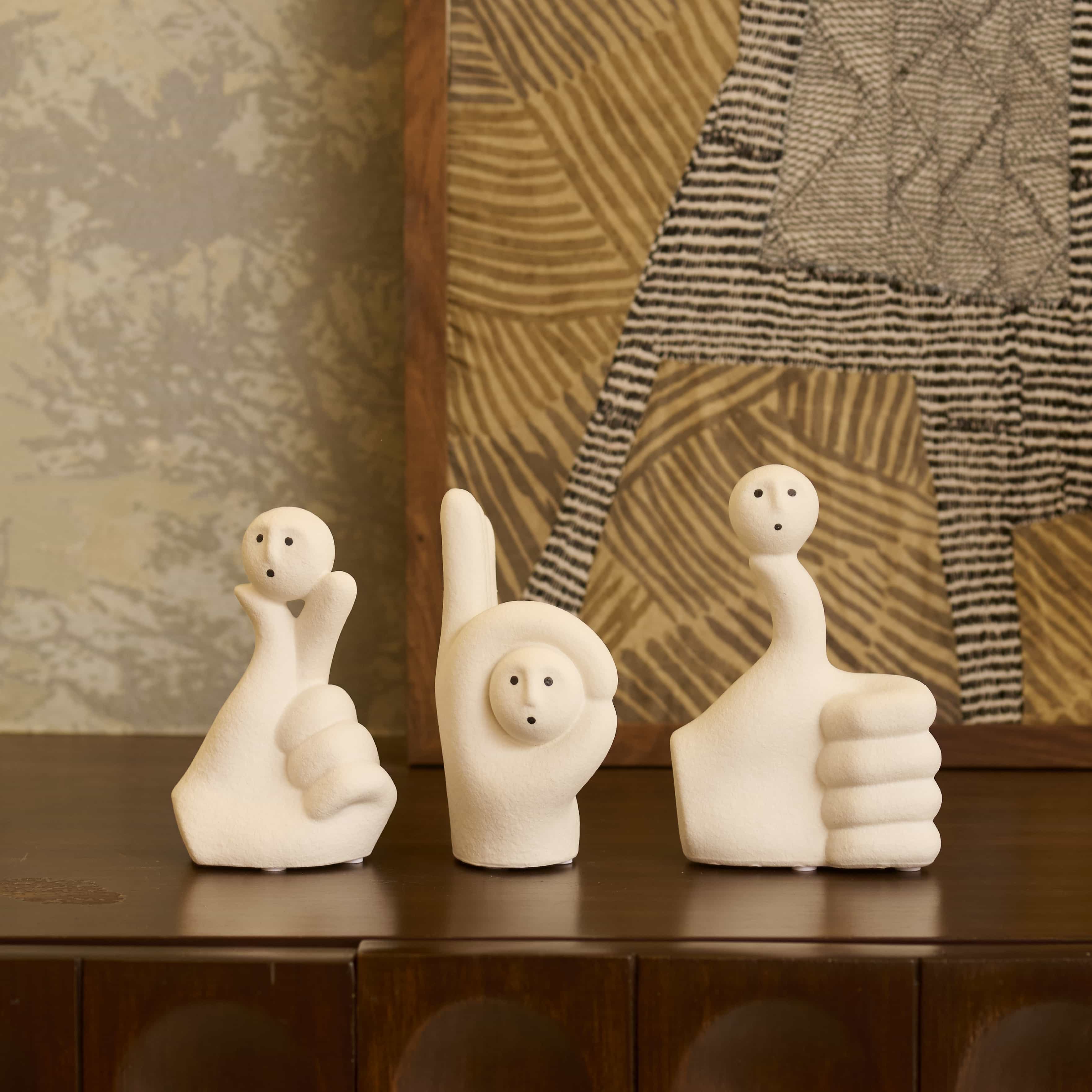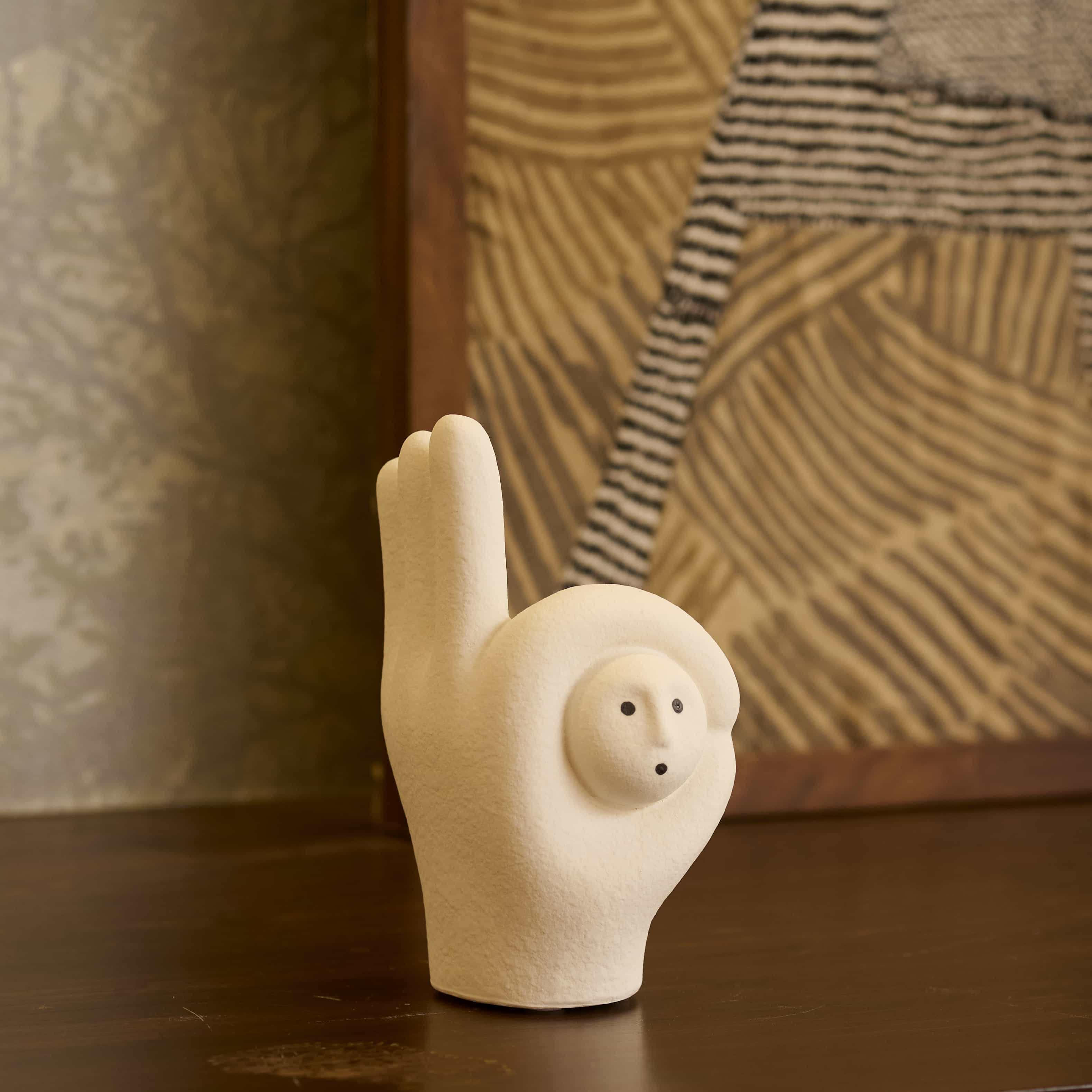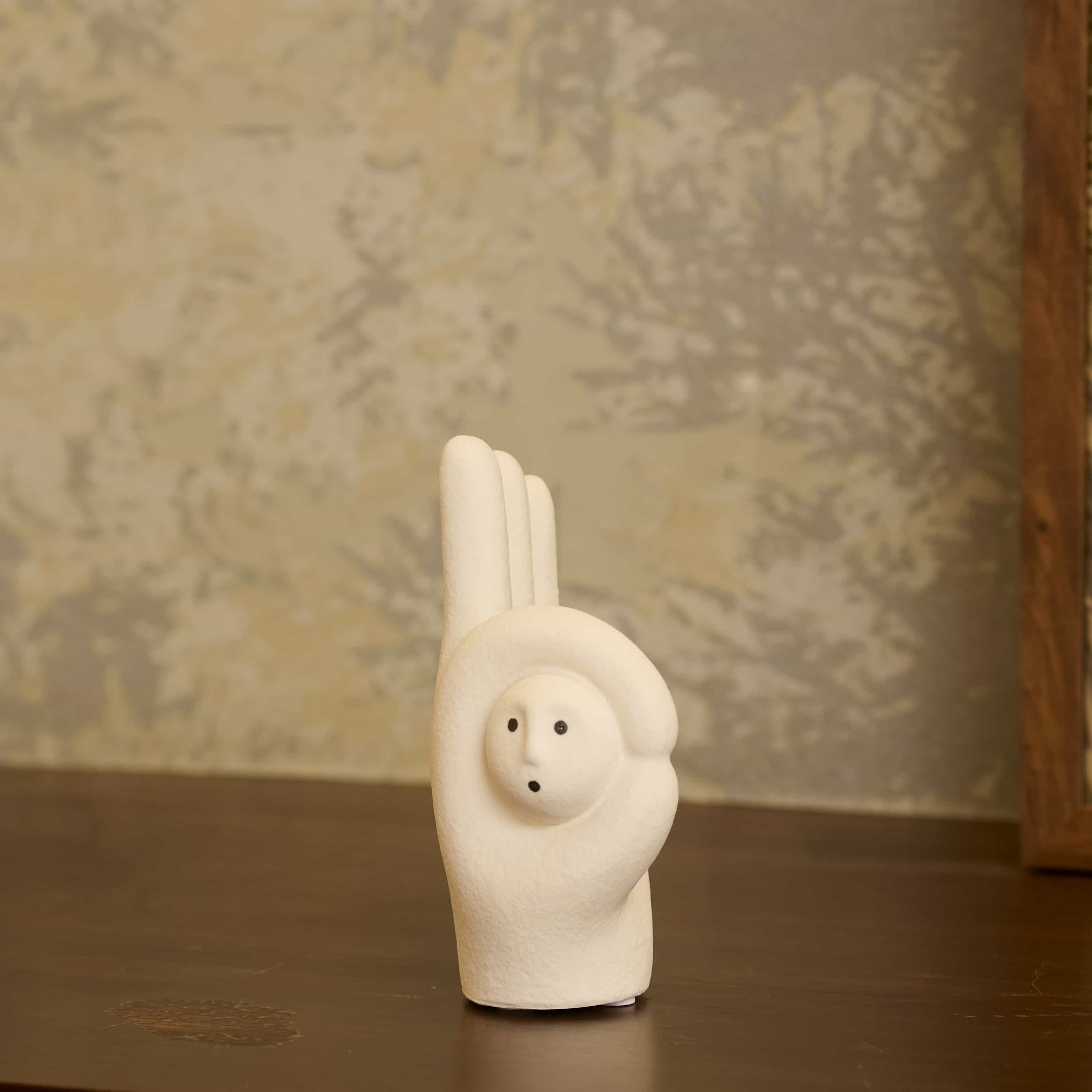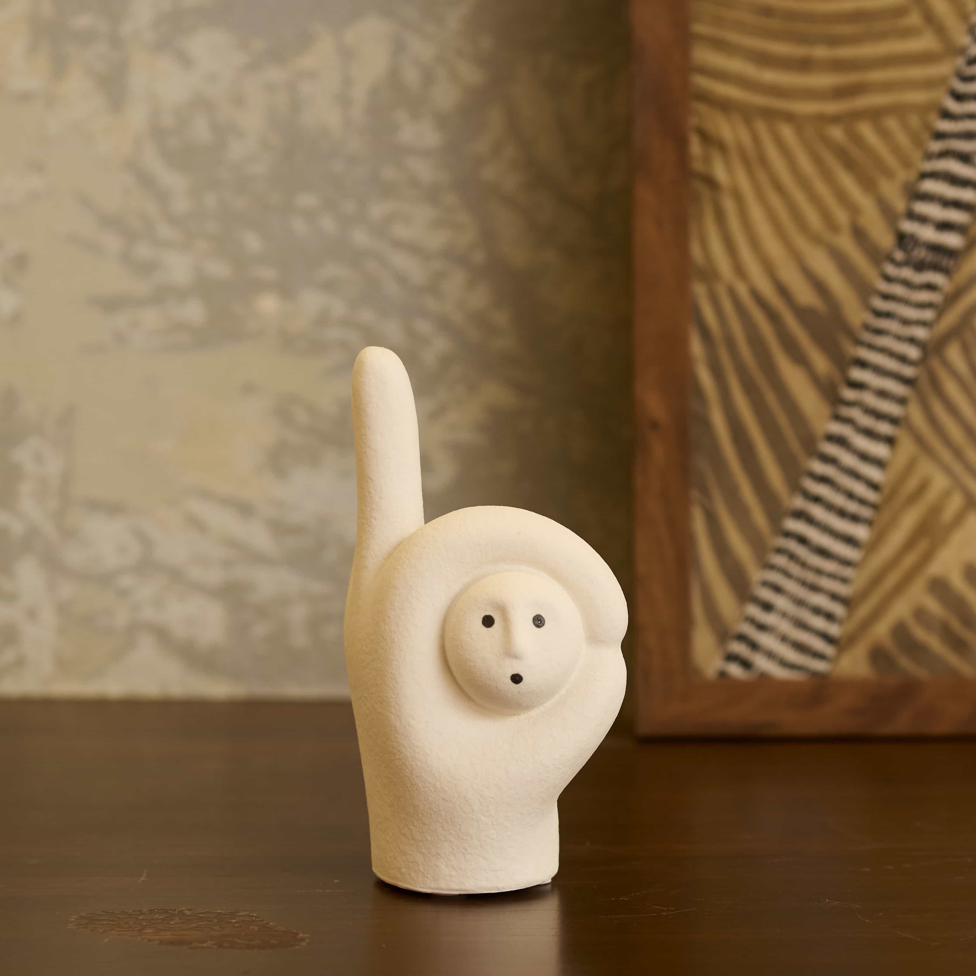 Pointer is a playful white curio with a tiny face nestled between thumb and index finger. The matte finish and curves bring quiet humor to desks or shelves, a friendly reminder to choose with care.