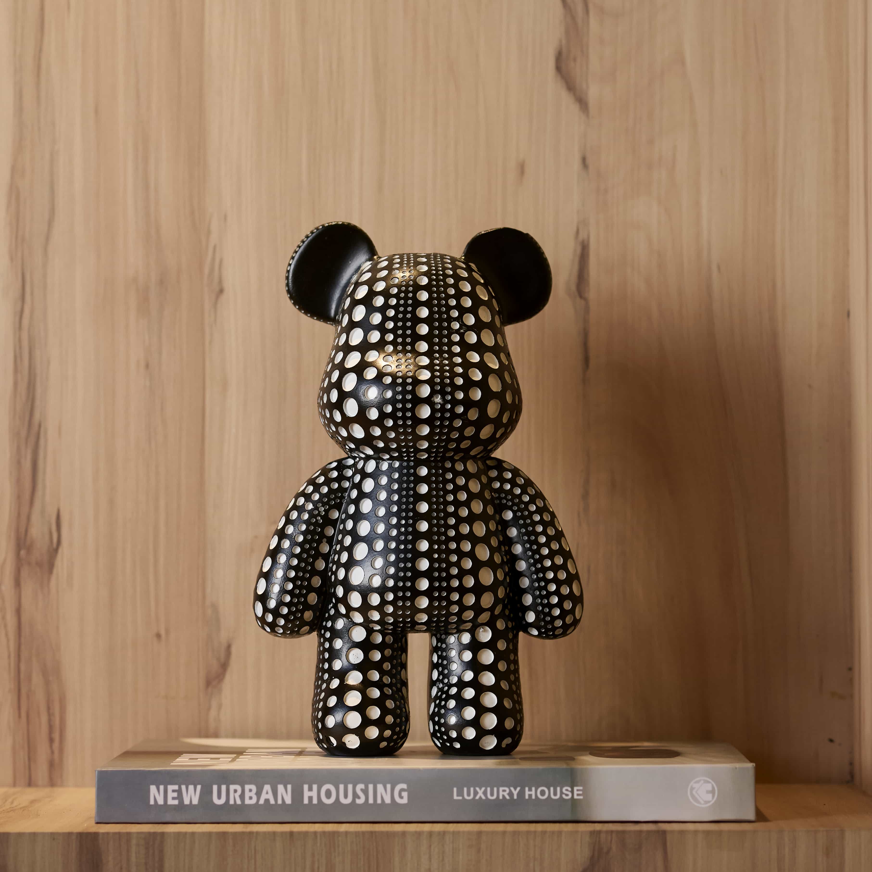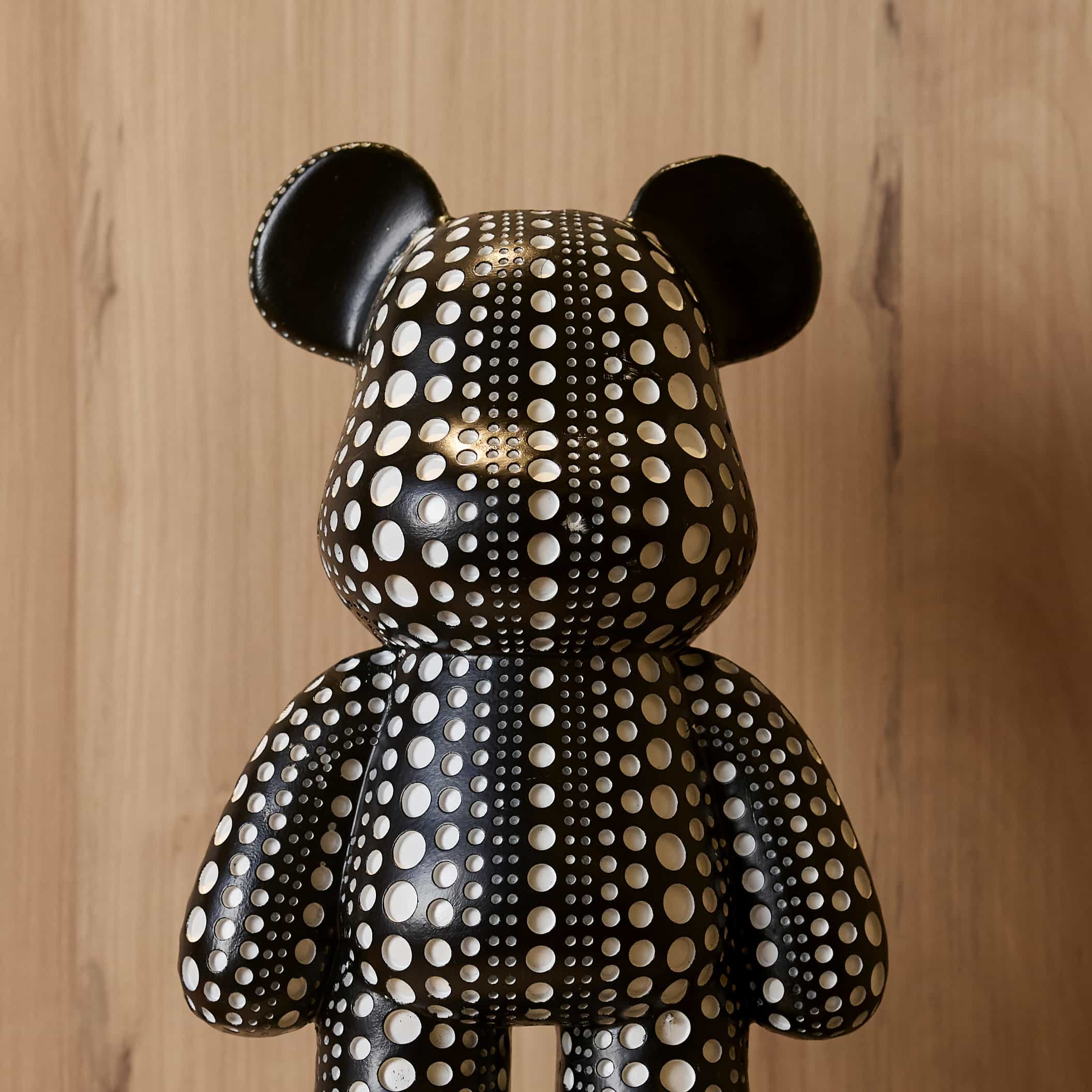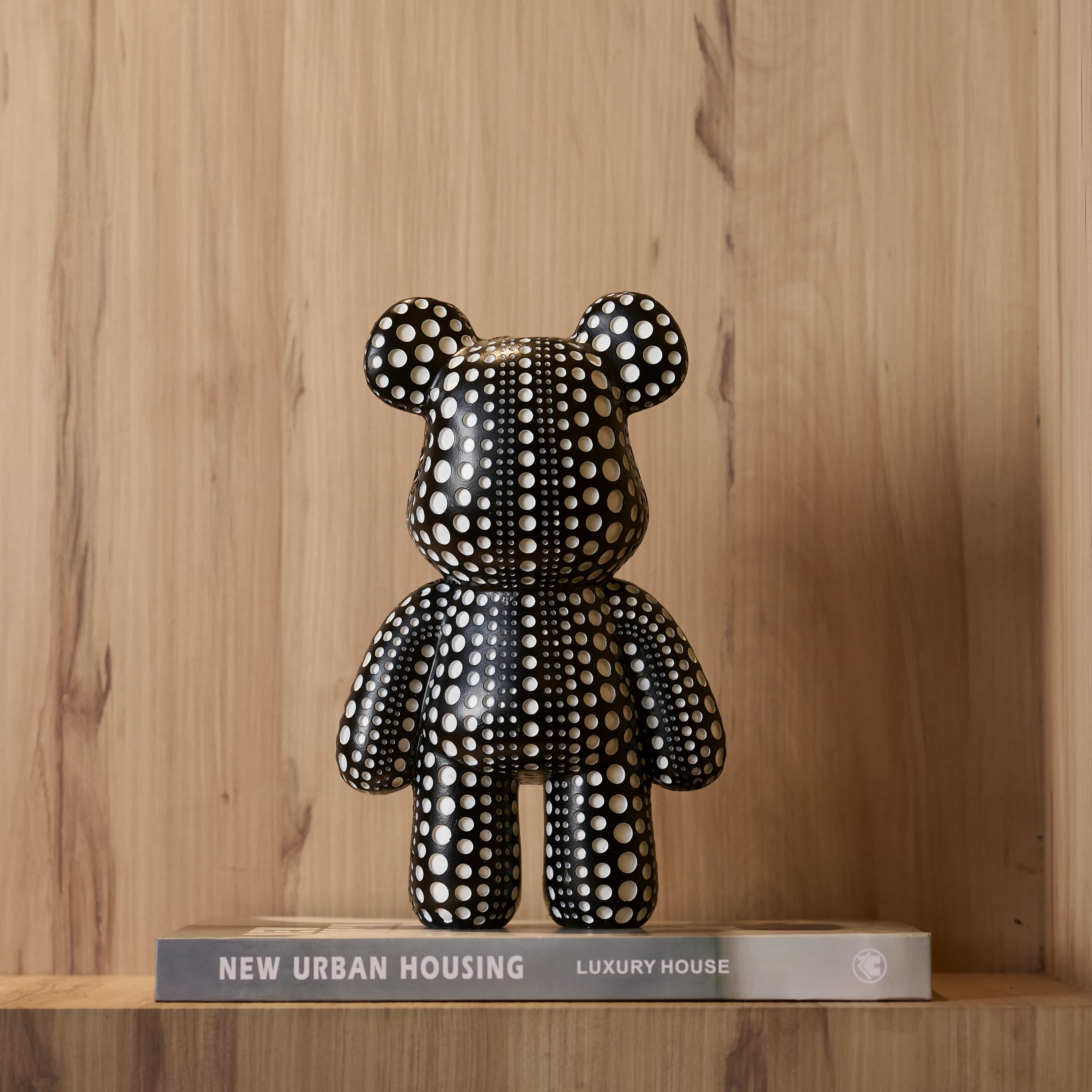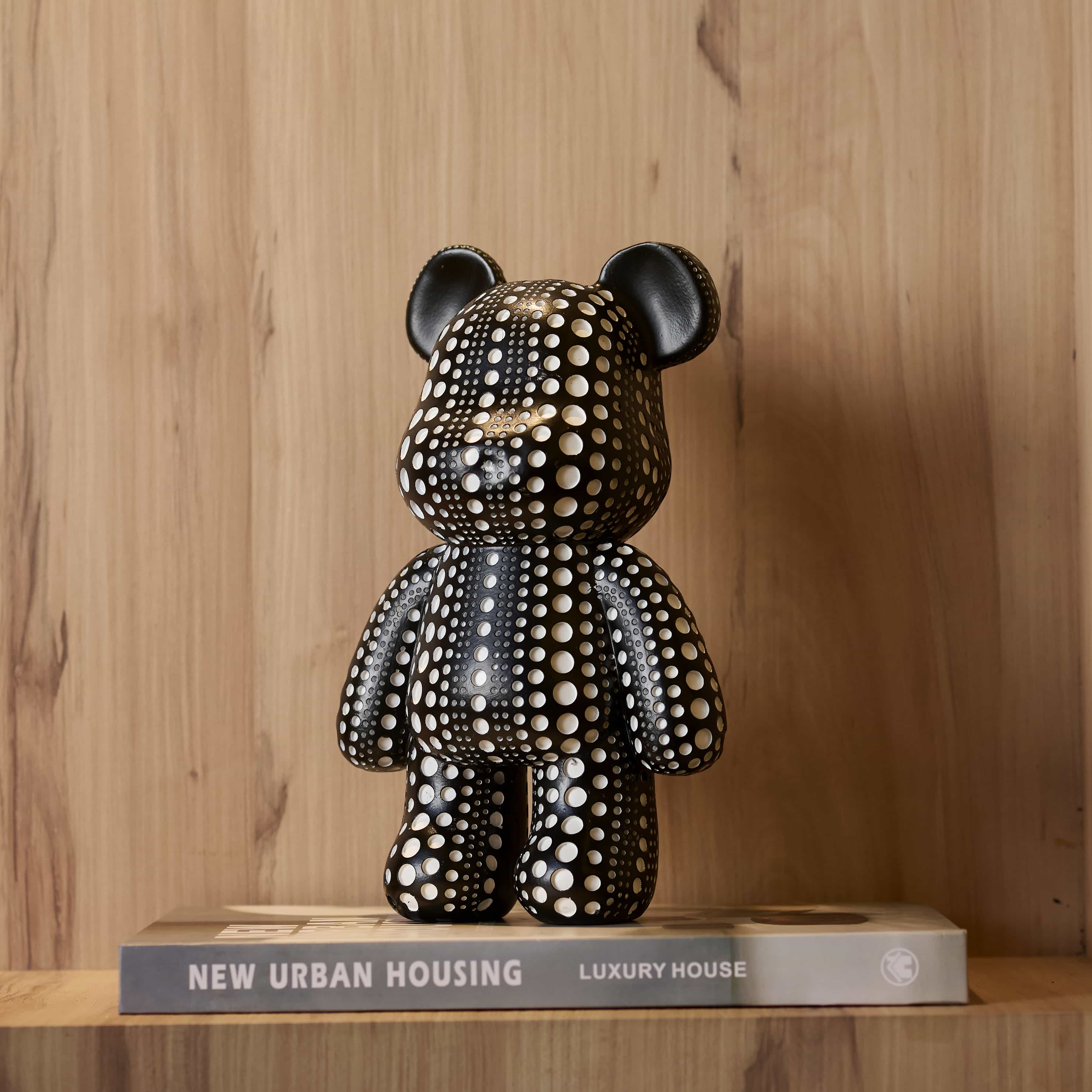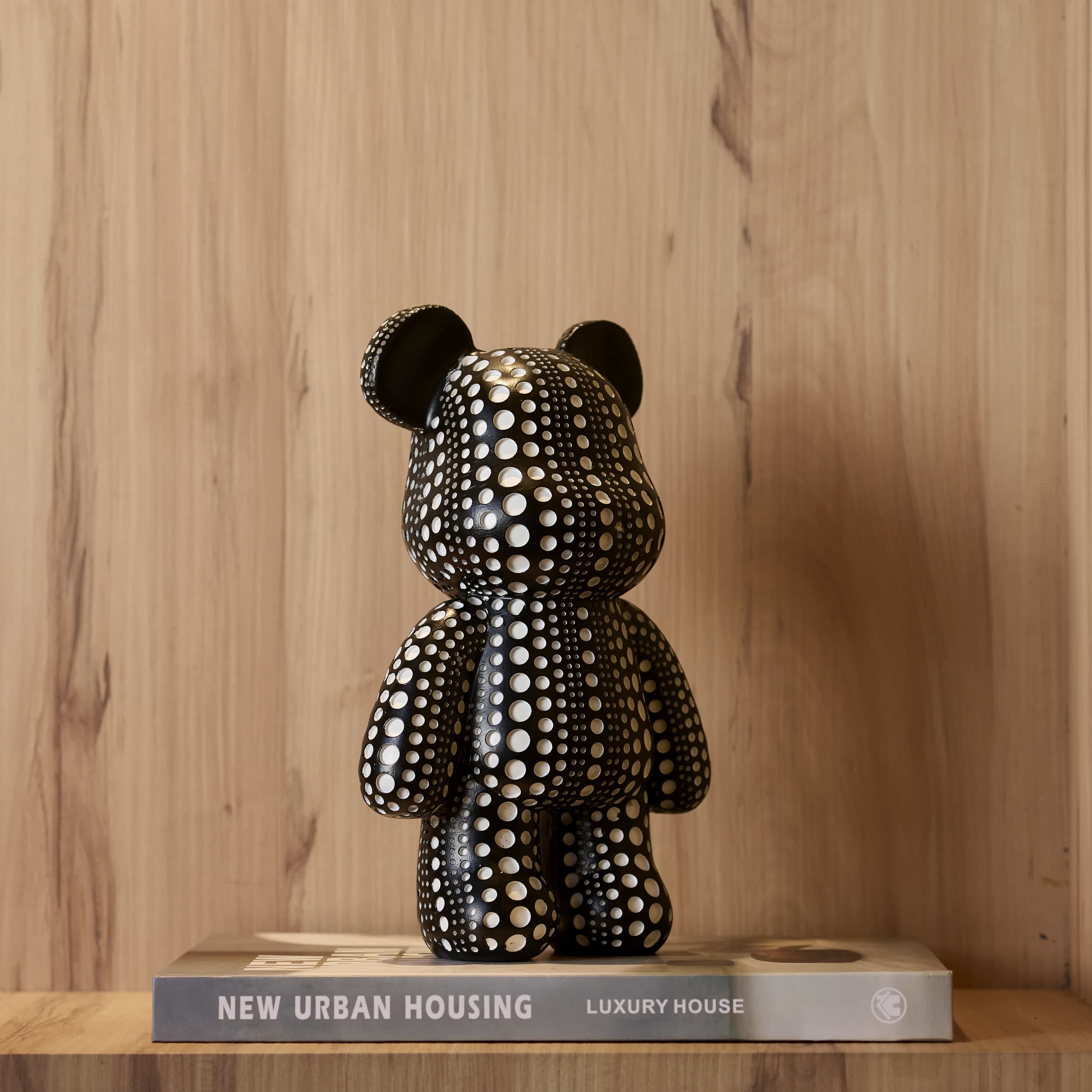Polka Bear is a table top curio of a bear. This piece with its monochromatic shades and chic design would be perfect in a decor space that is bright and screams colors.