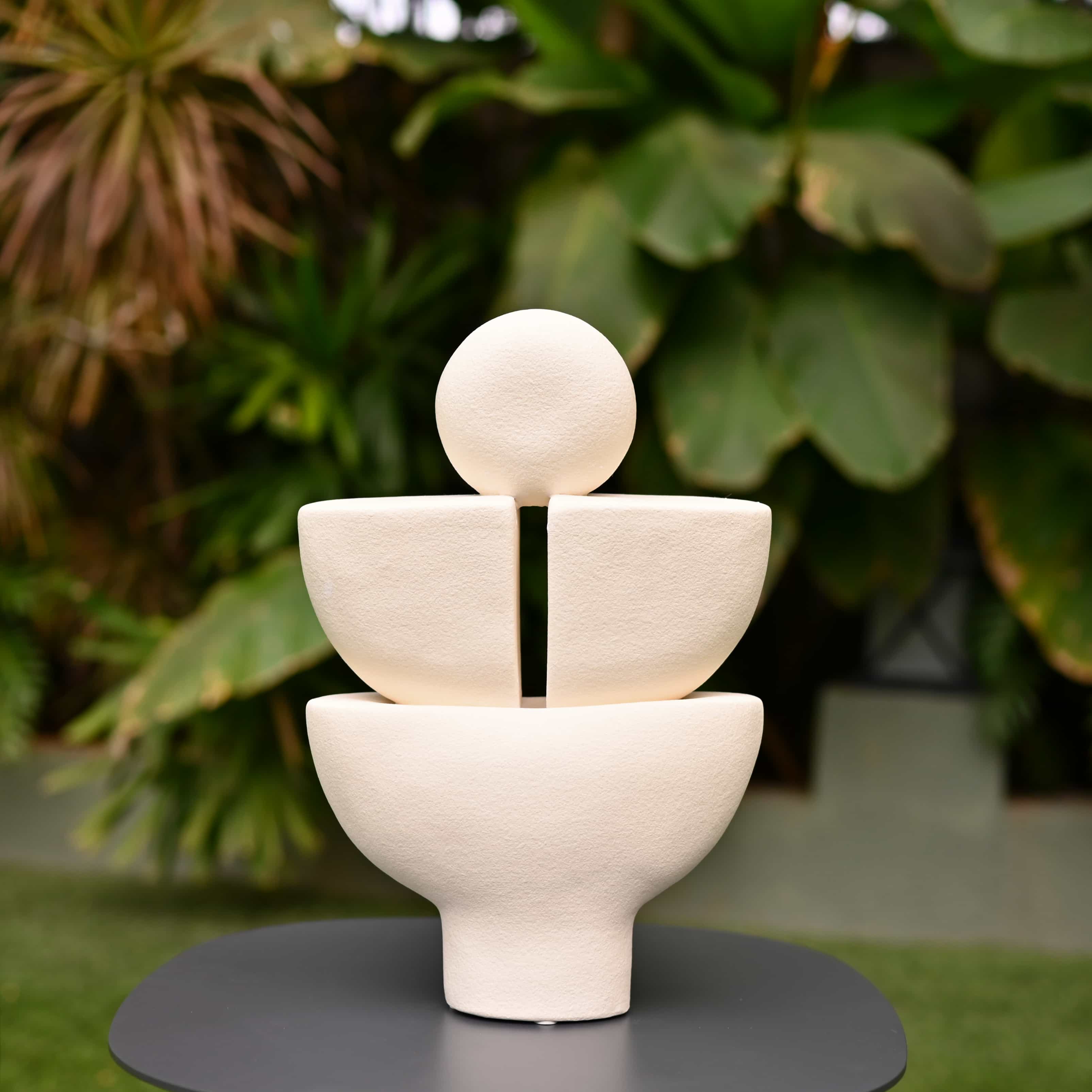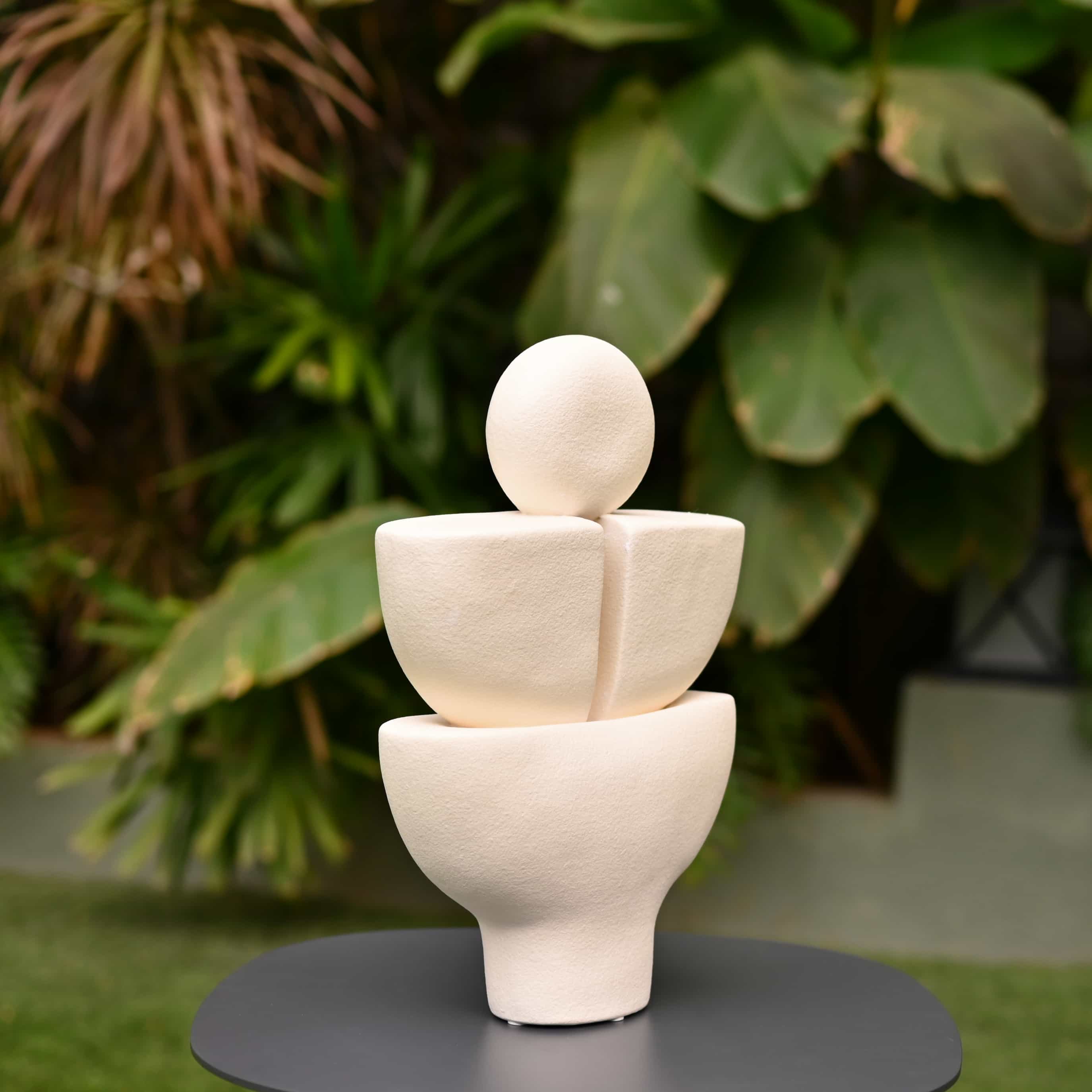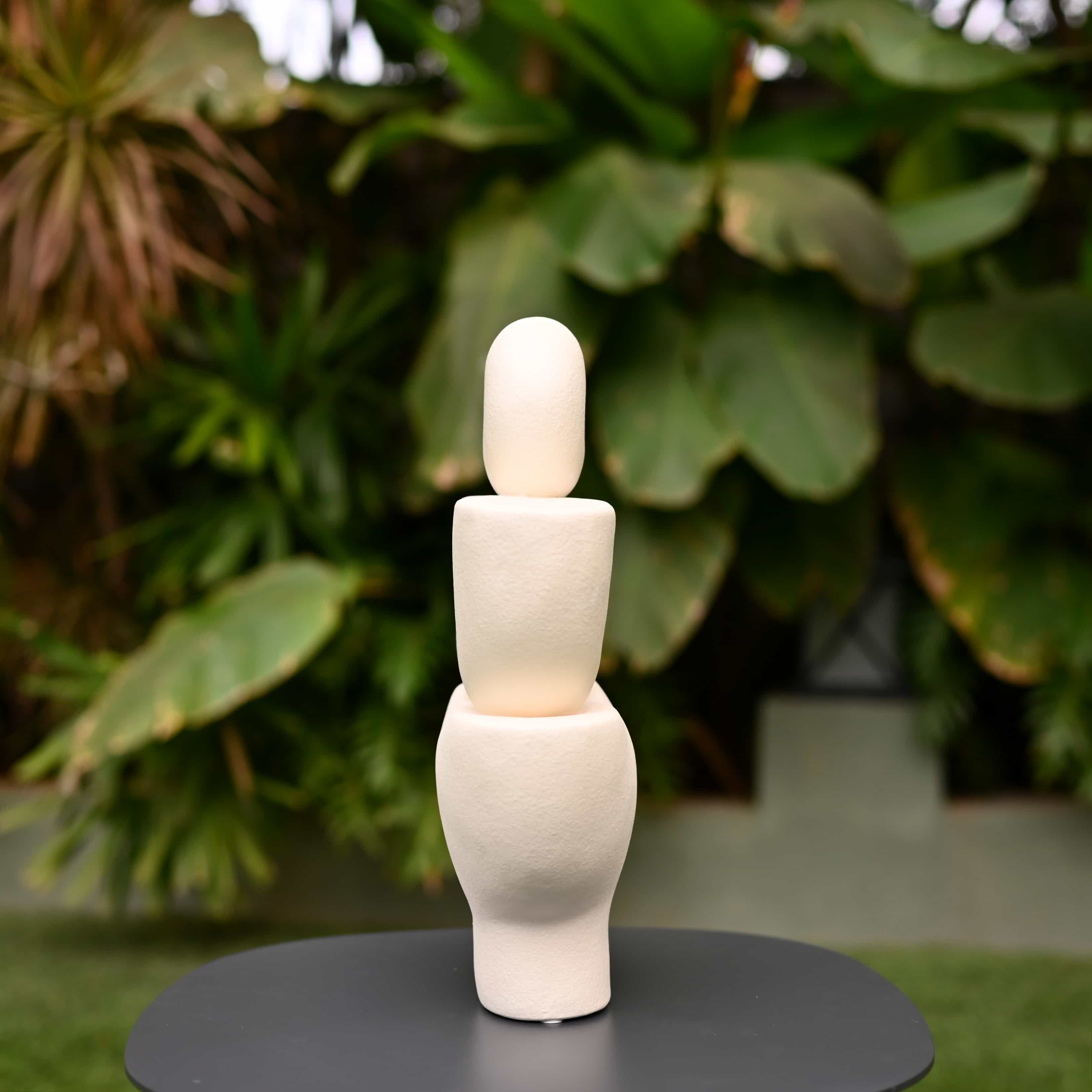 Solace layers three matte white forms into a calm totem with a small moon like sphere on top. Gentle curves invite touch and quiet focus. Place it on a windowsill, meditation corner, or beside leafy plants.