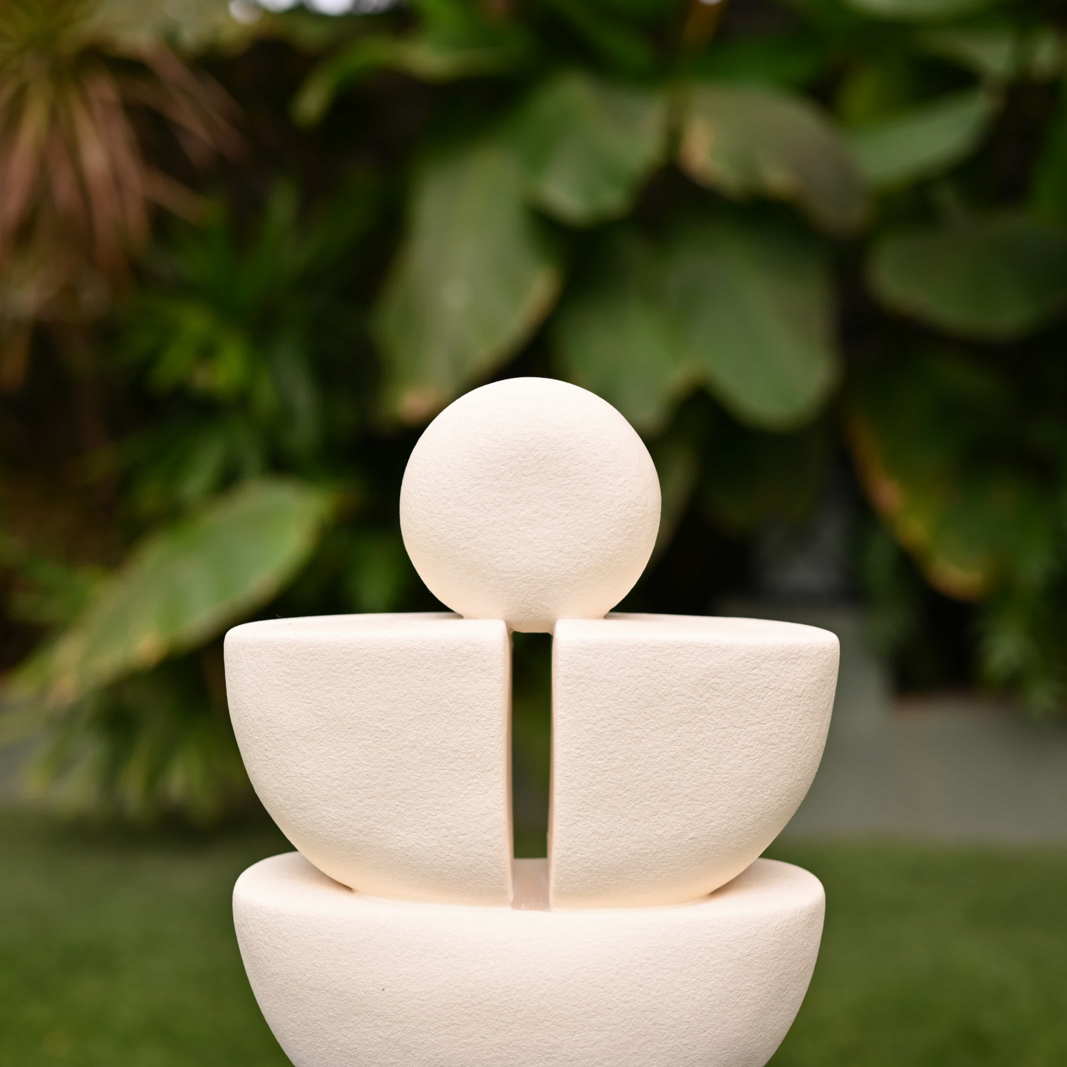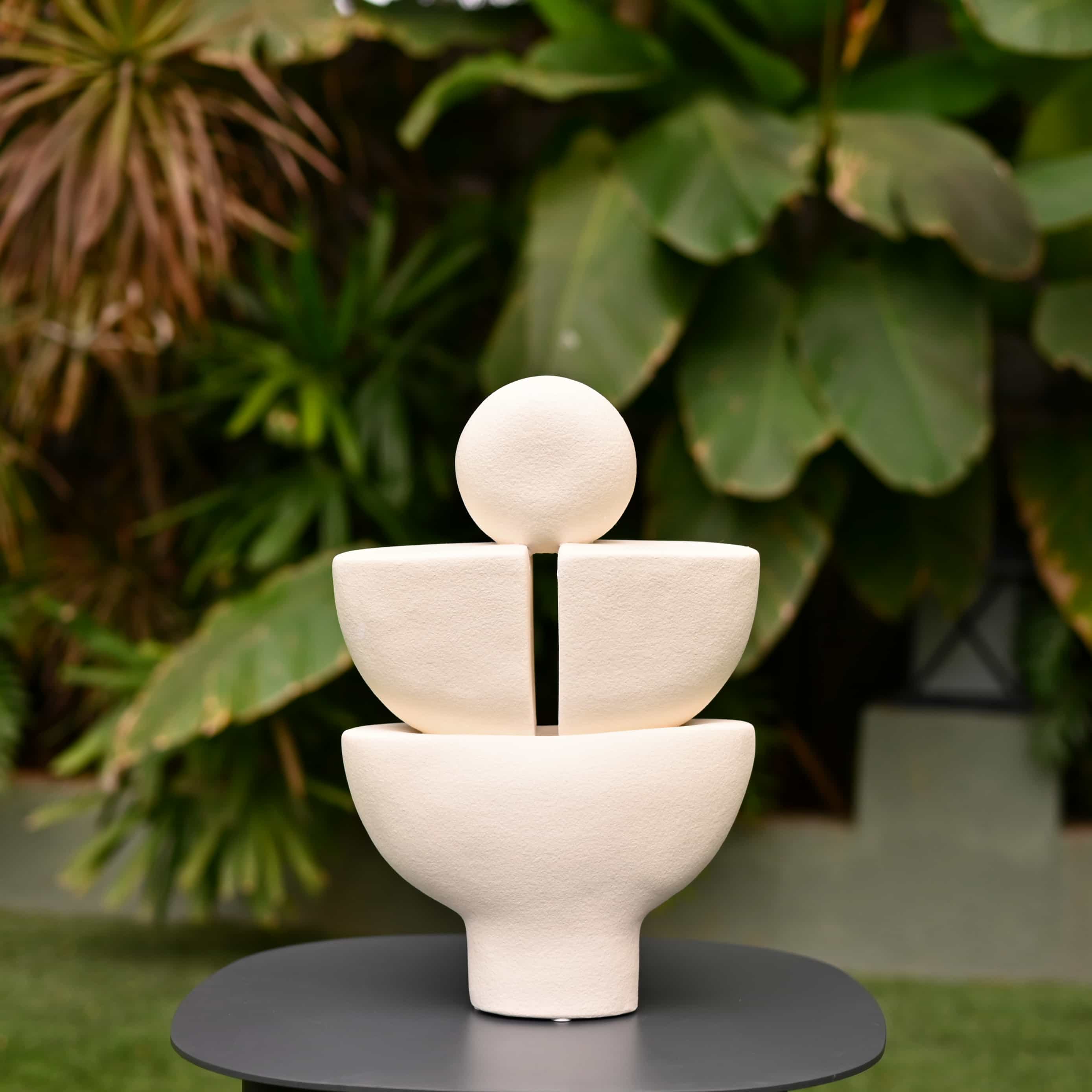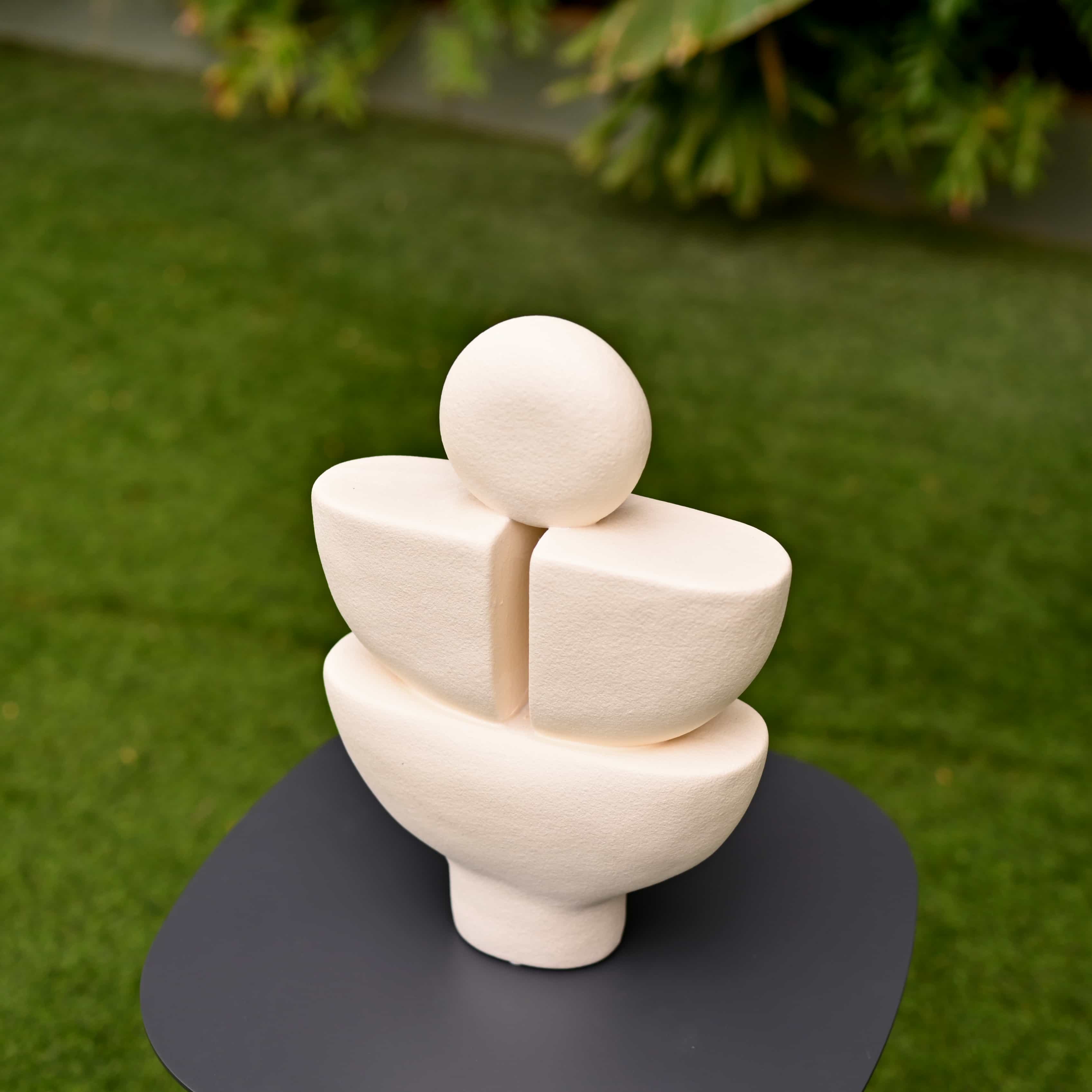 Solace layers three matte white forms into a calm totem with a small moon like sphere on top. Gentle curves invite touch and quiet focus. Place it on a windowsill, meditation corner, or beside leafy plants.