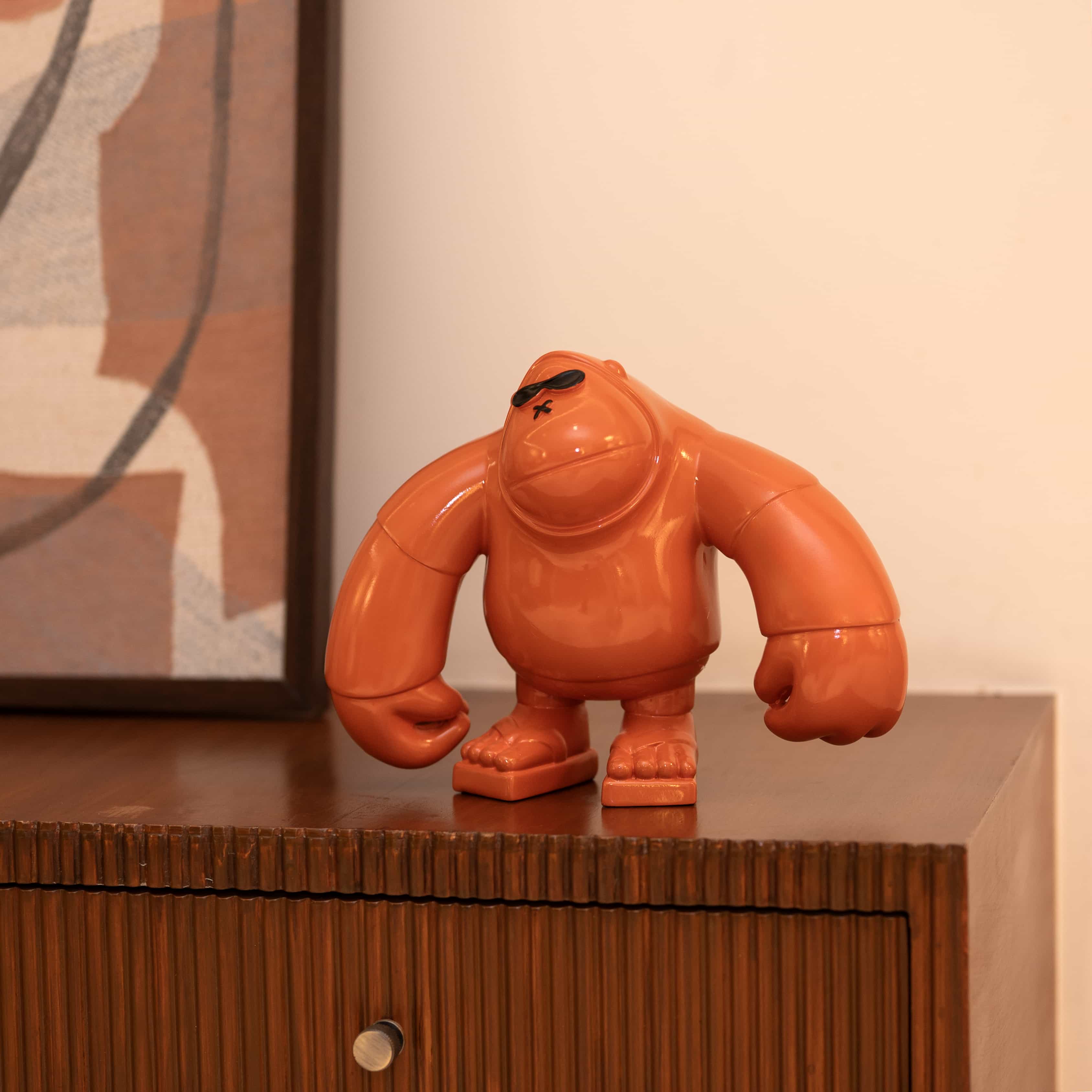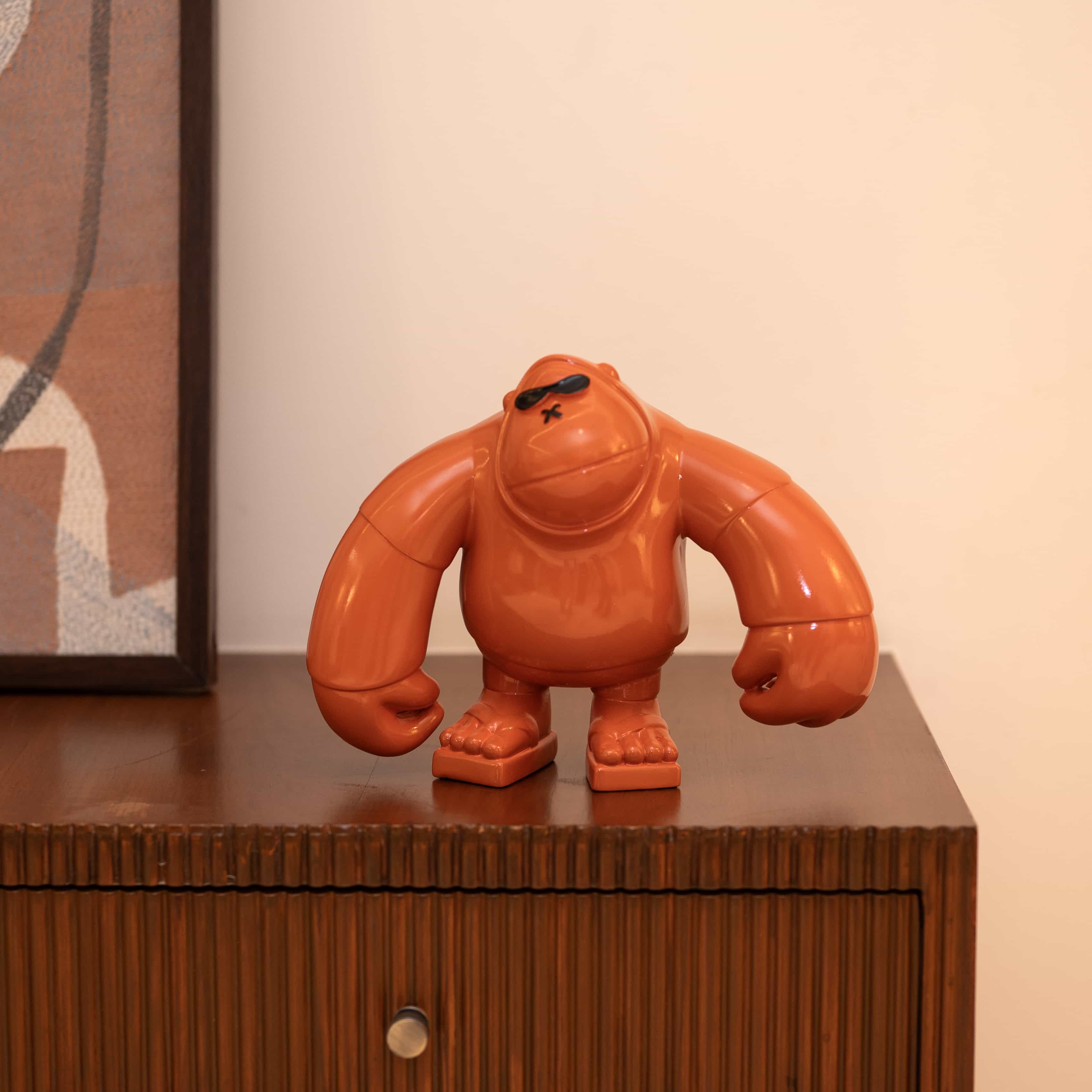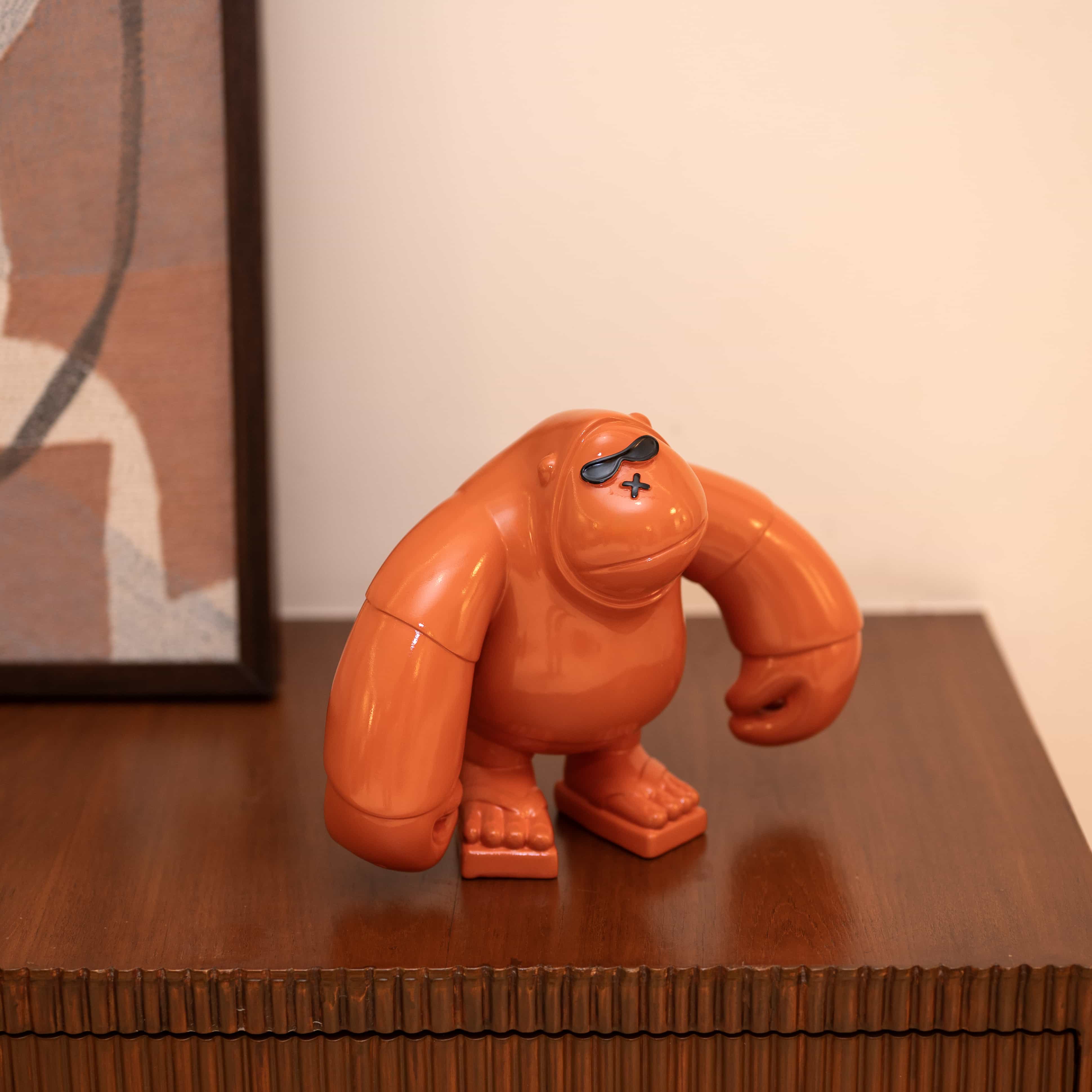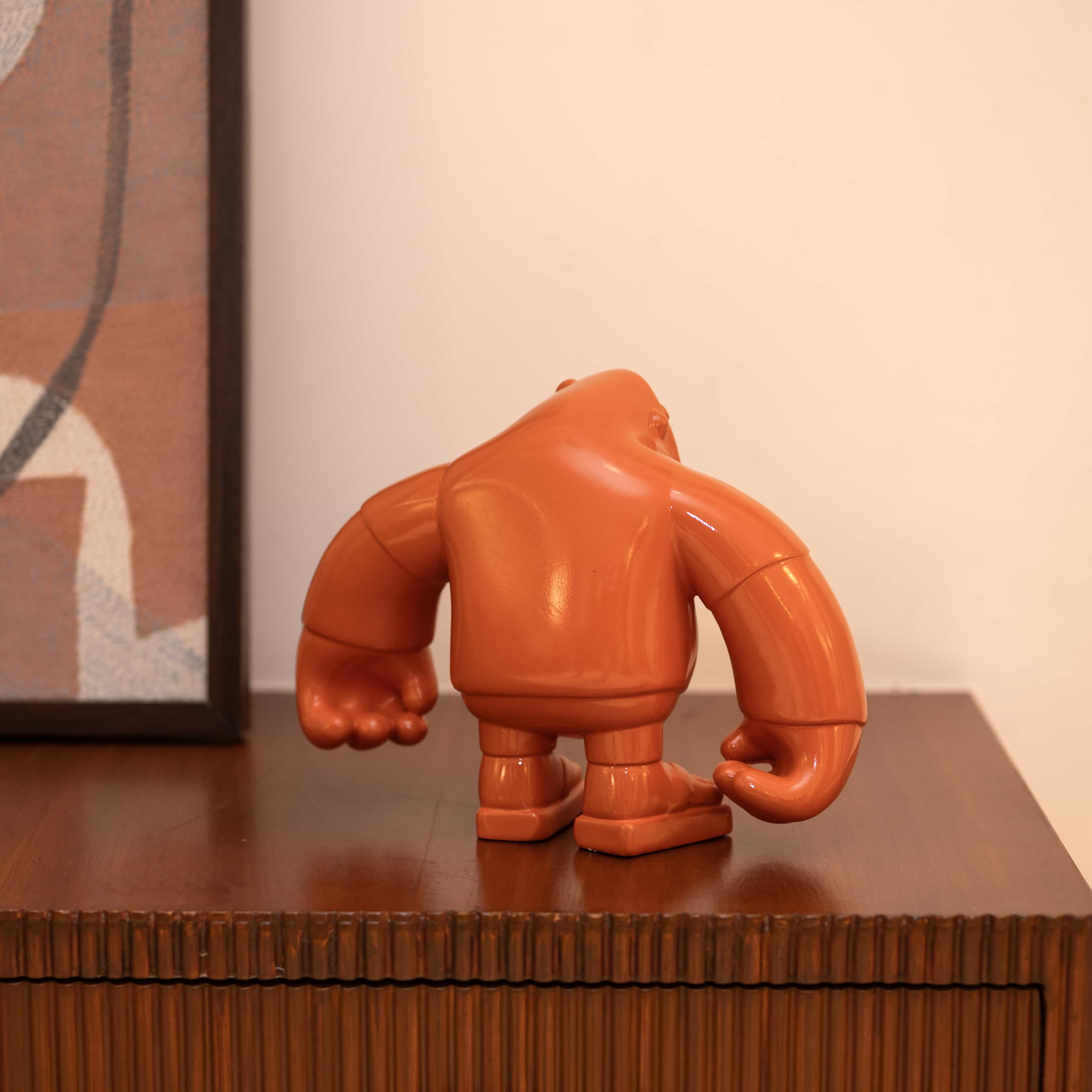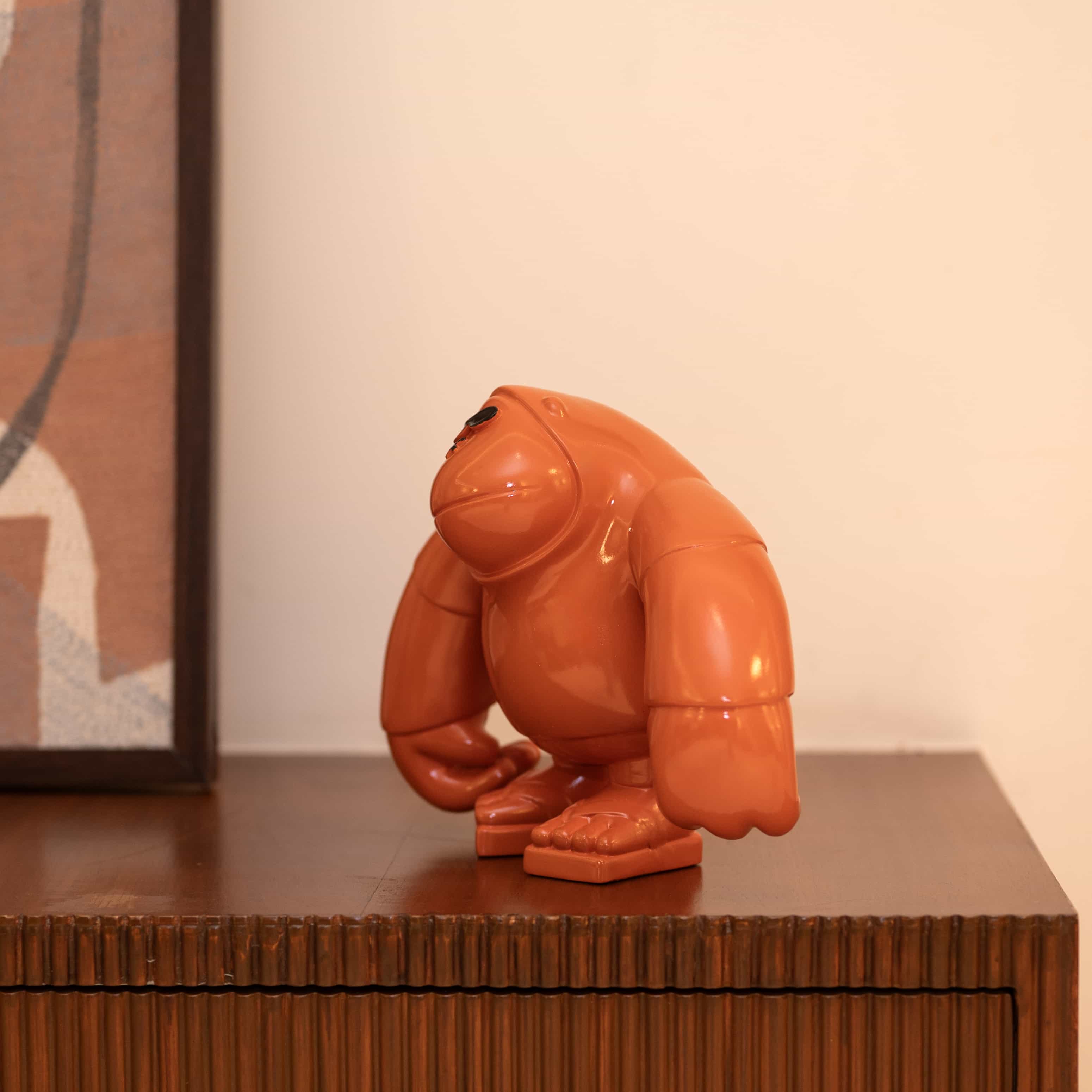 Brawny is a vibrant tangerine hued curio of a sassy gorilla. This piece looks strong, sturdy, and absolutely bonkers in a fun way. Add this piece to your space for that little wild pop of color!