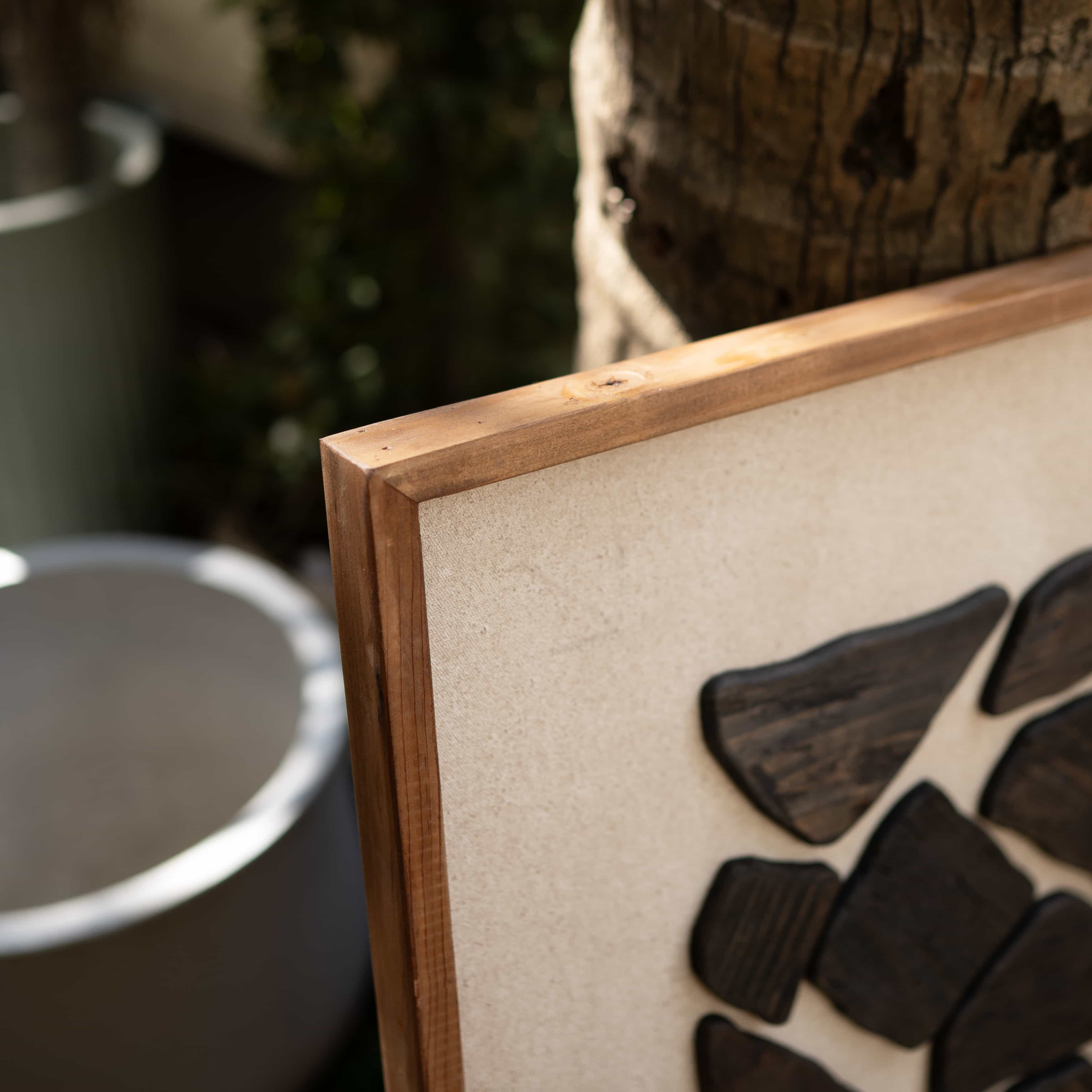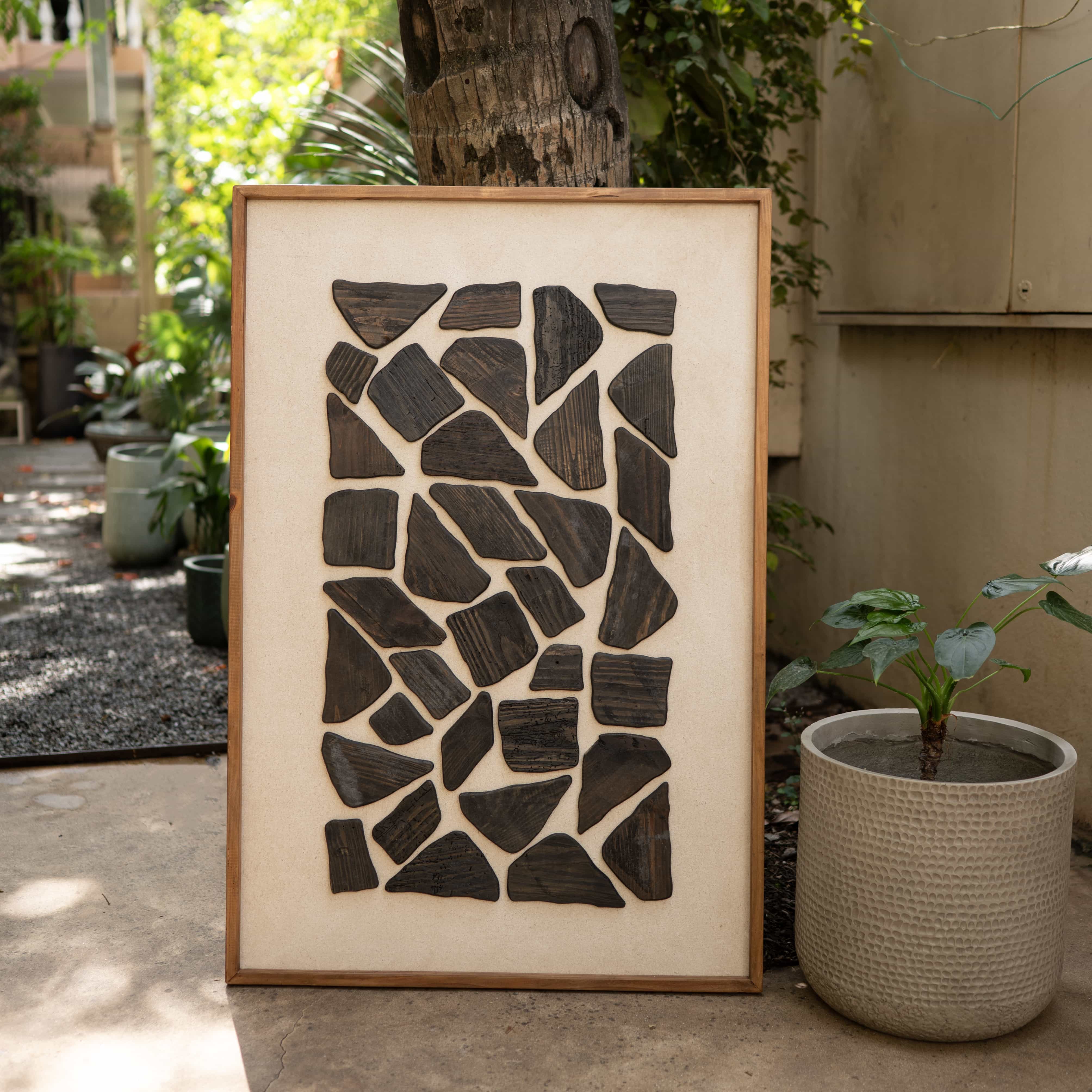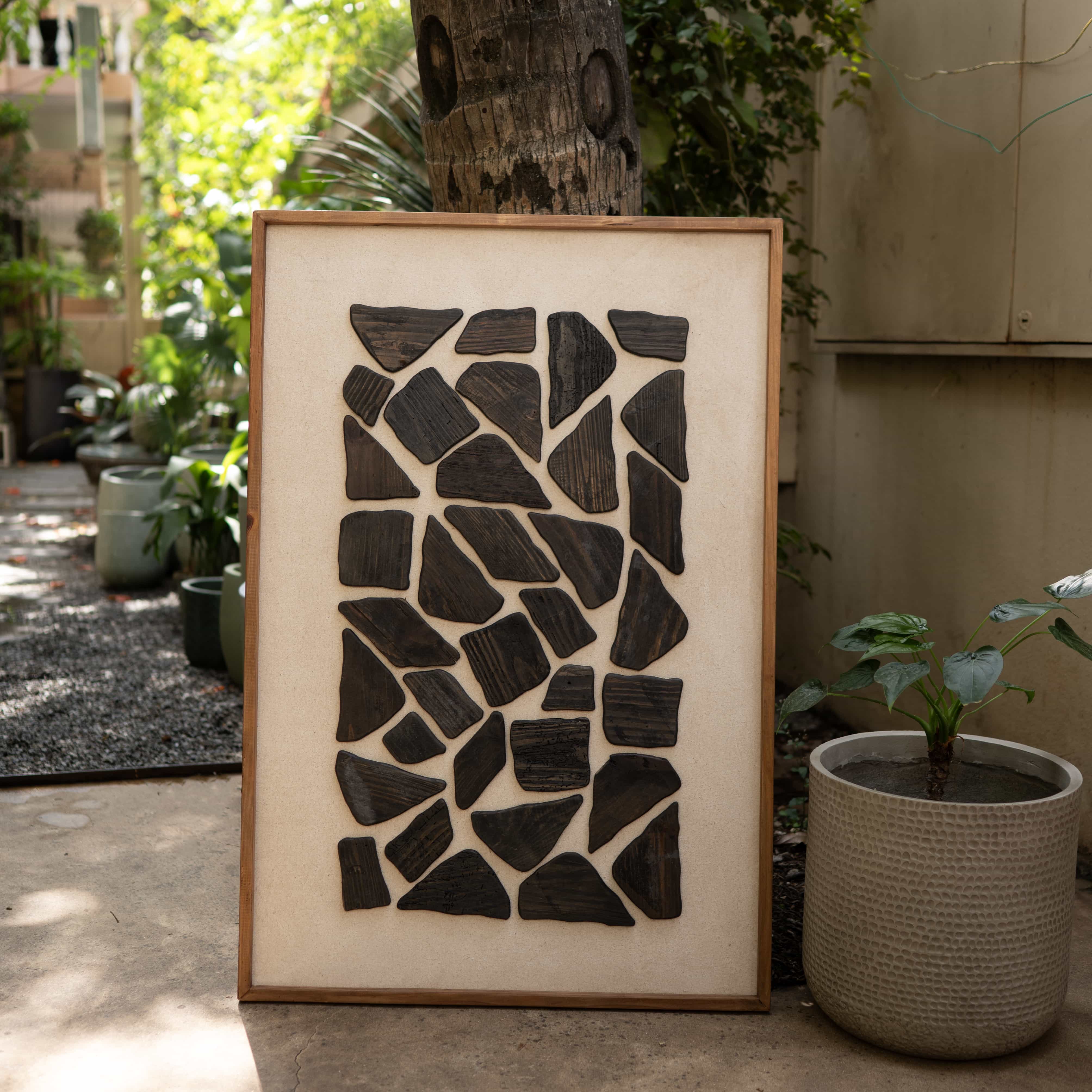 Fracta is made entirely from pine wood, bringing together an abstract arrangement of blackened wood pieces over a soft beige backdrop. Each shape feels like a piece of a story, broken and rearranged into something bold, expressive, and grounded.