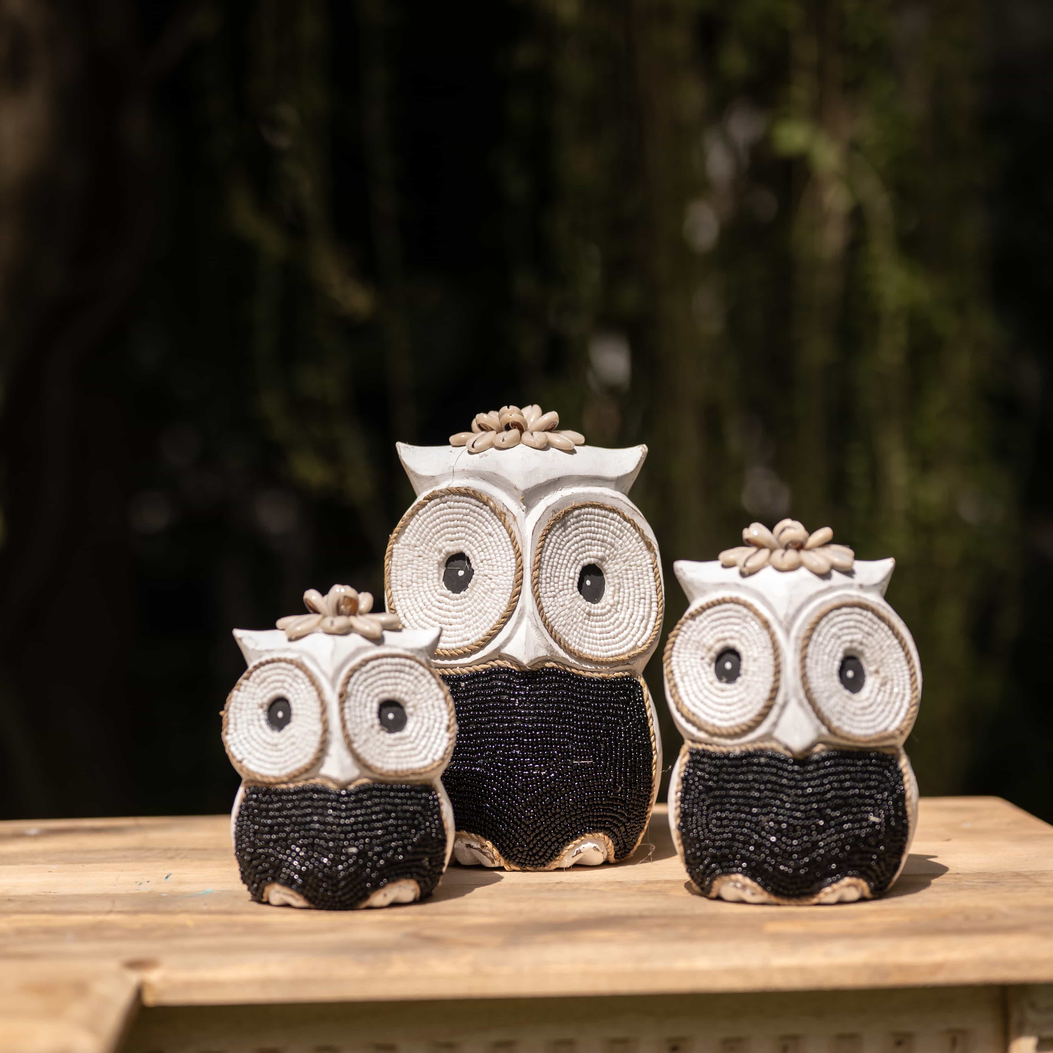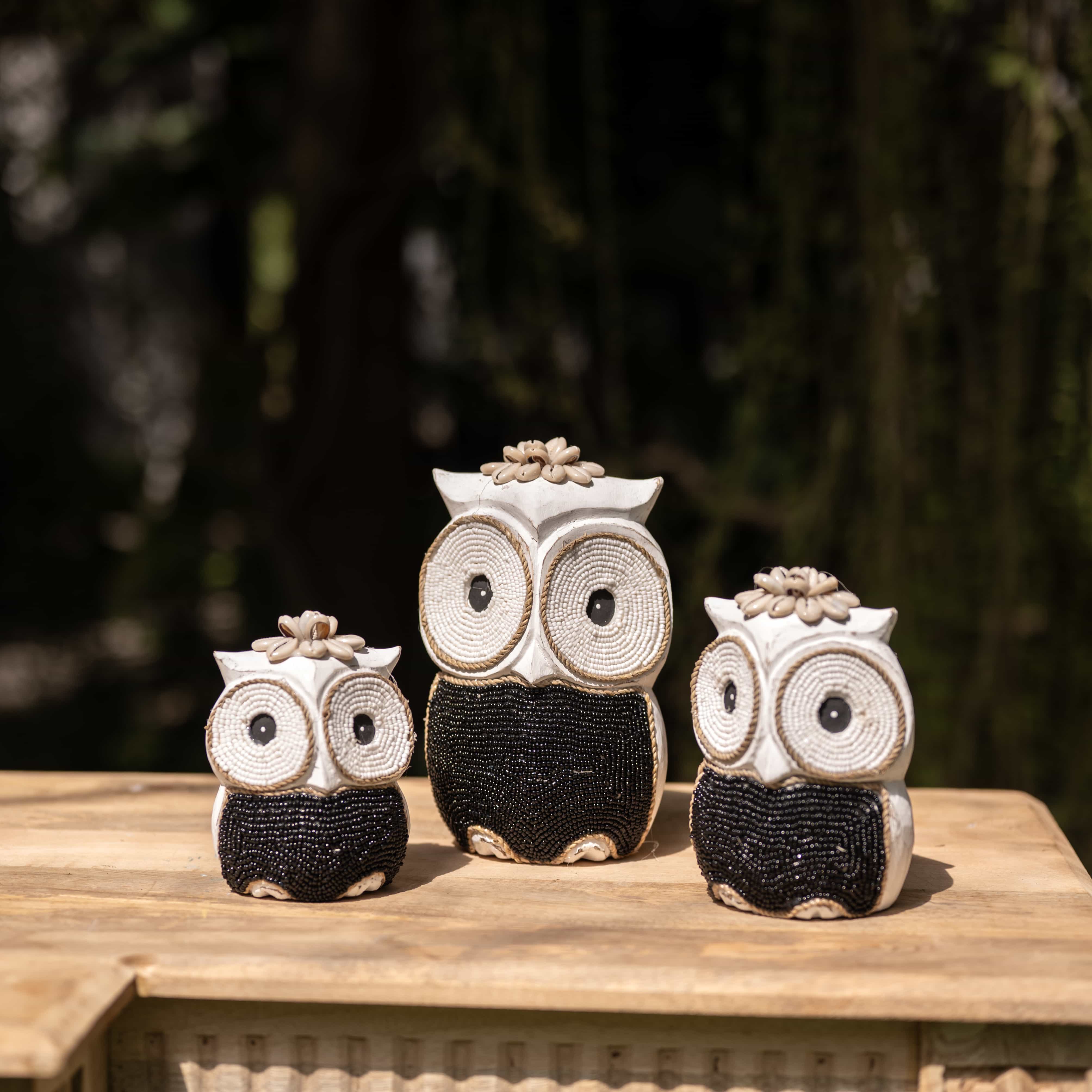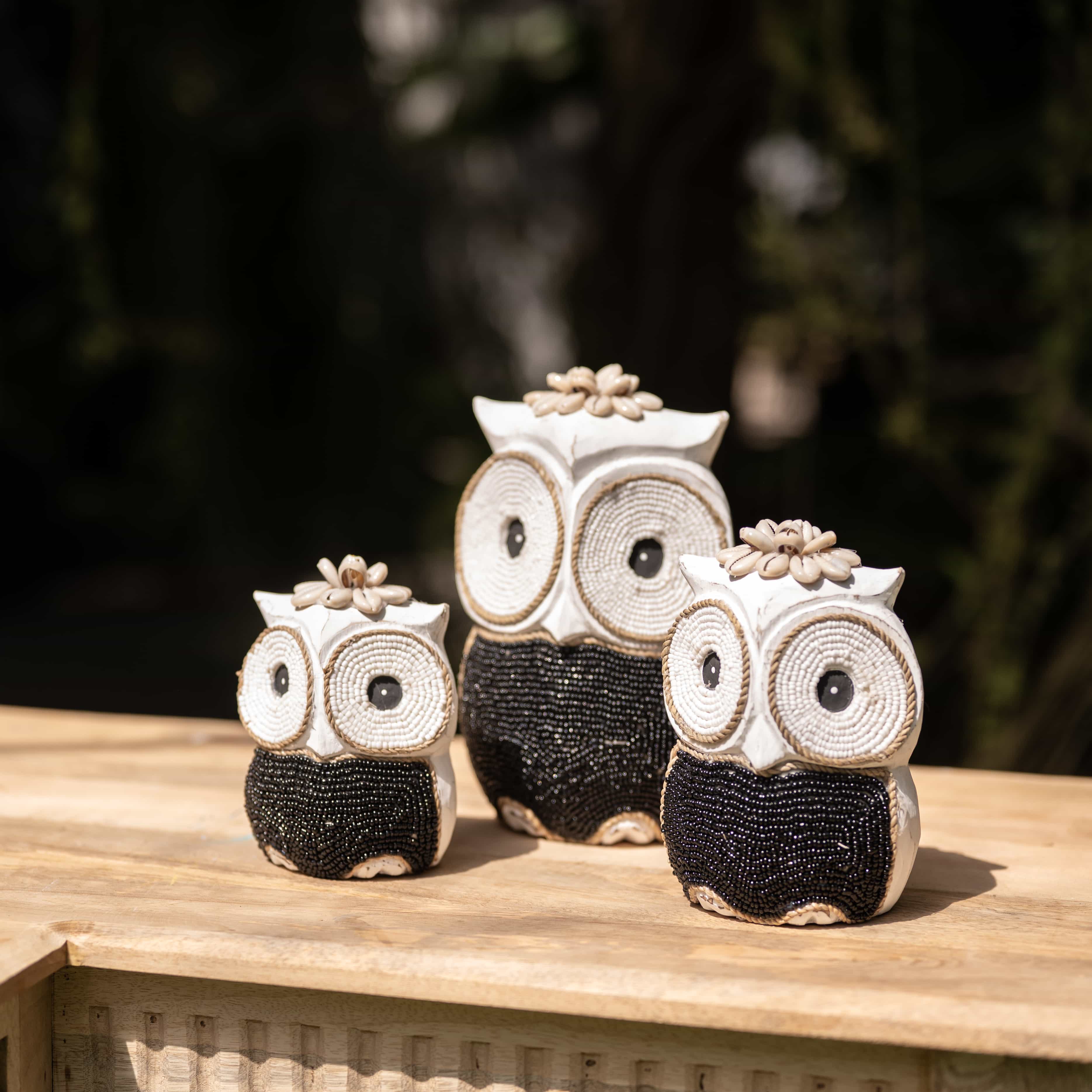 The maker winds stark white cord and obsidian beads to give these nocturnal watchers their wide-eyed stare. Designed to stand together as a silent, stylish guard for your space.