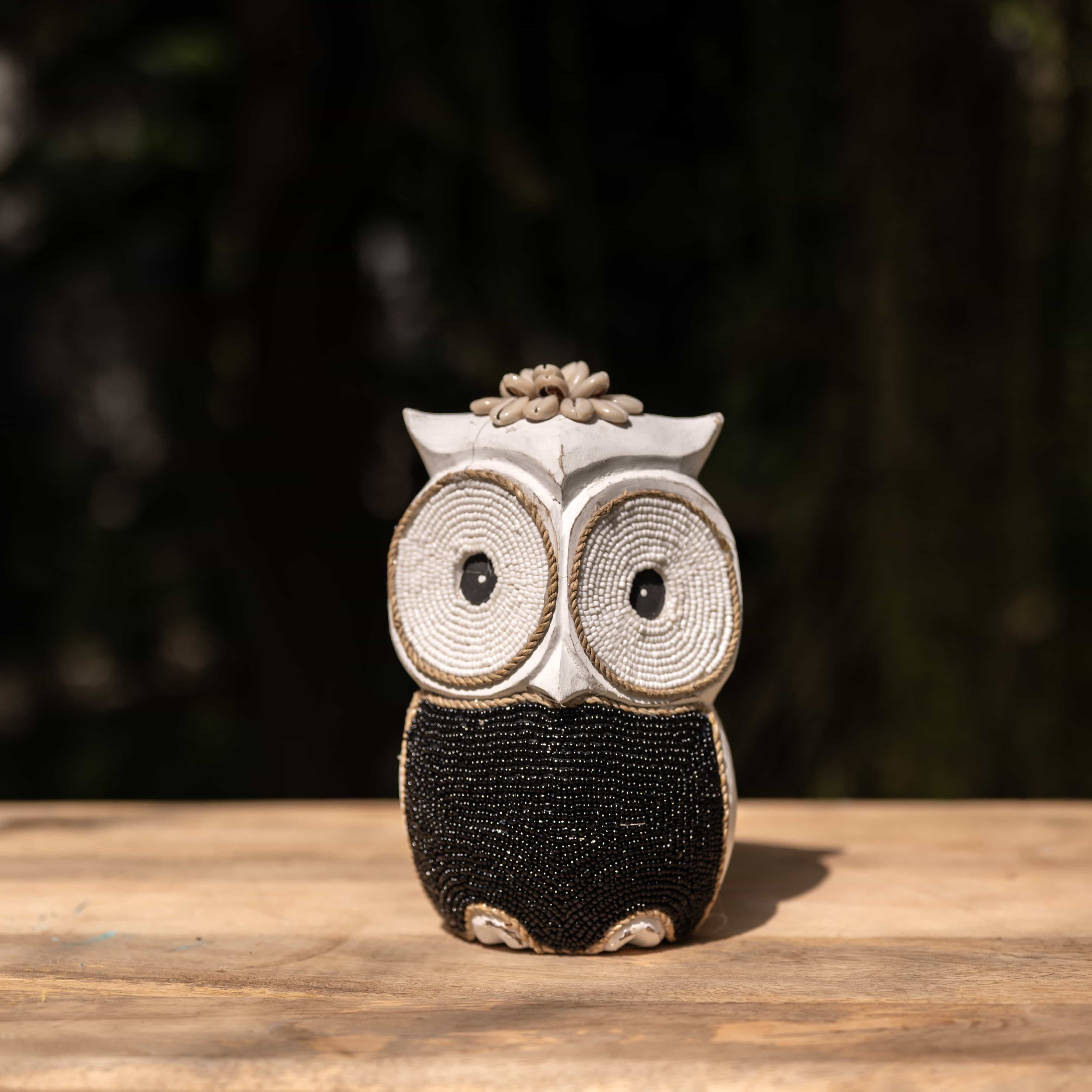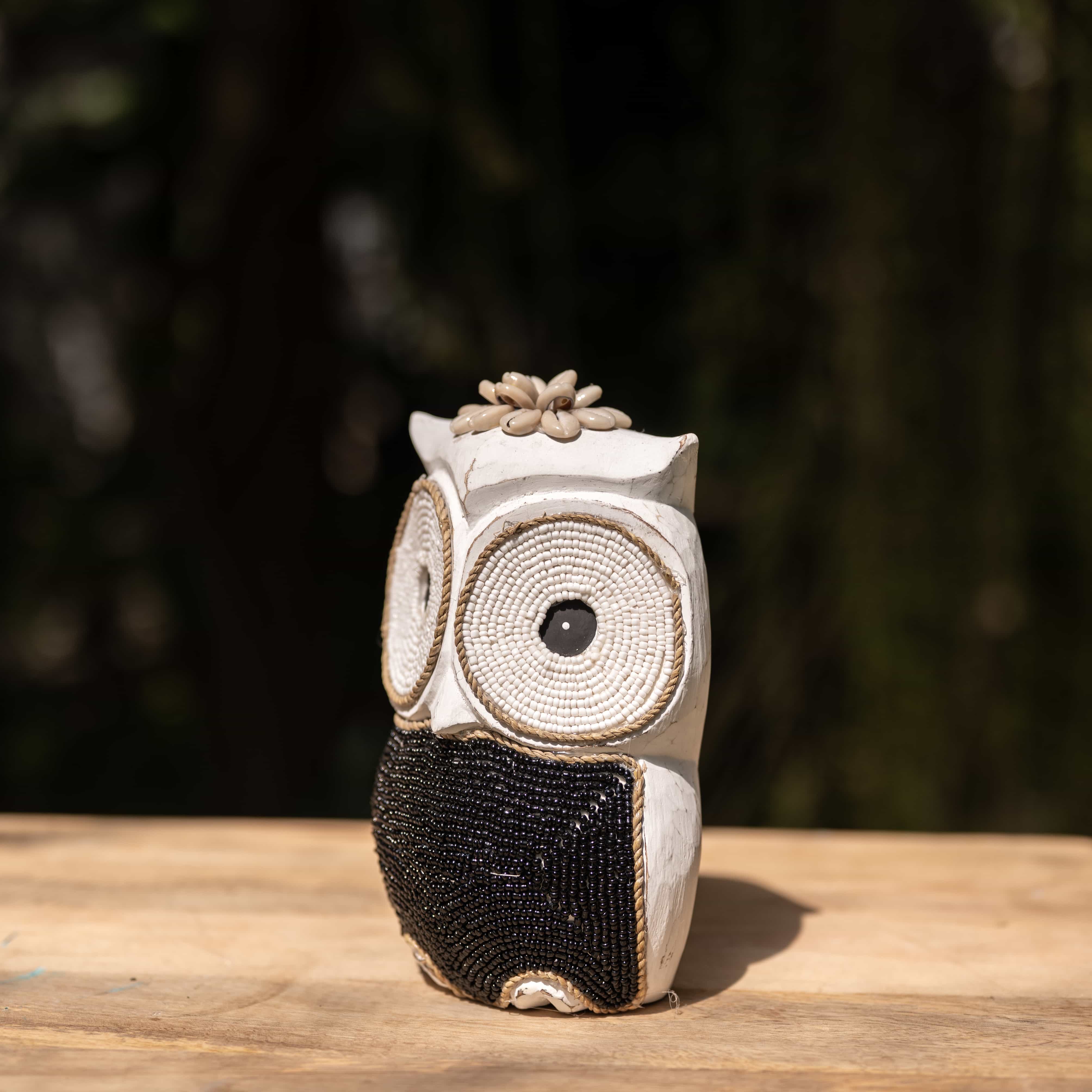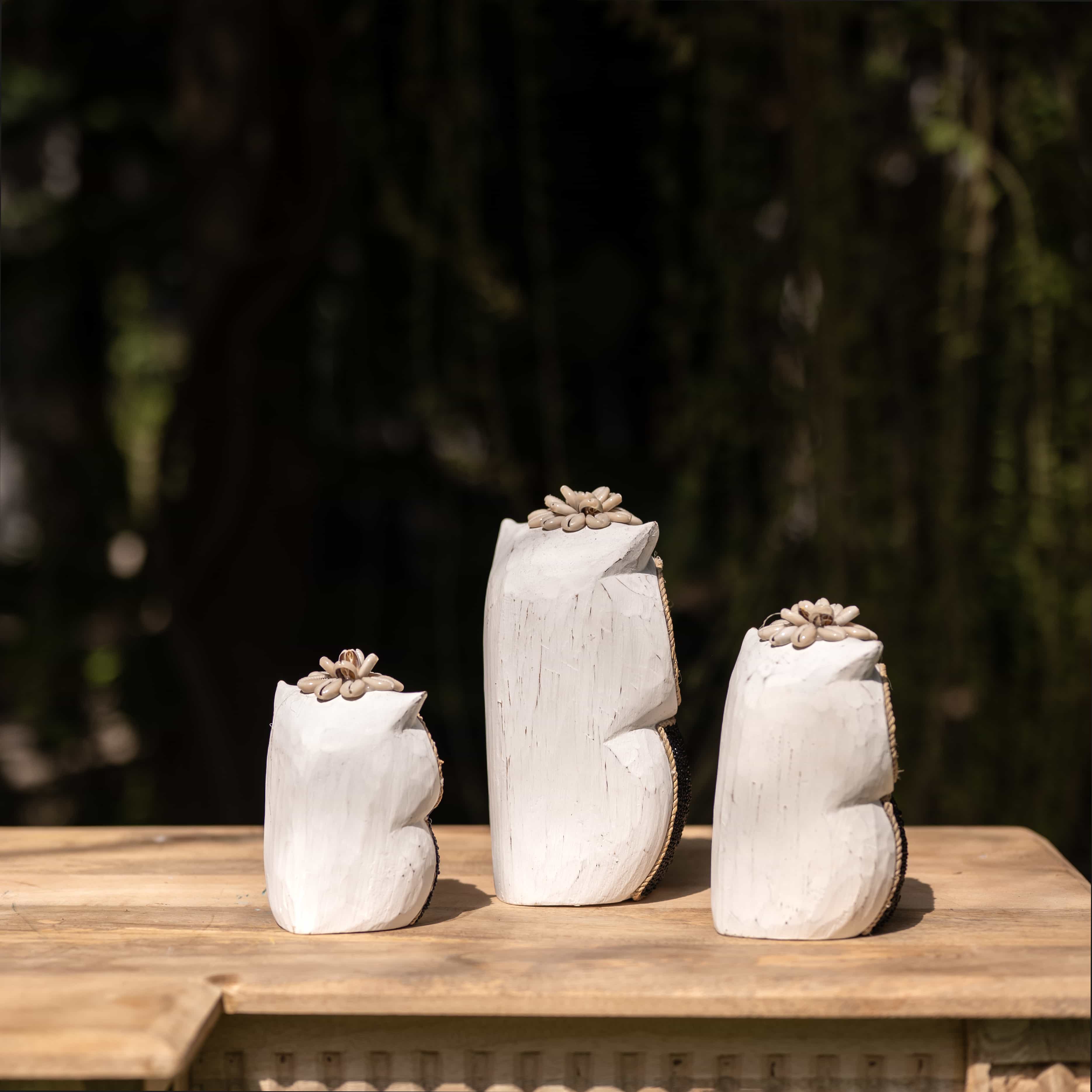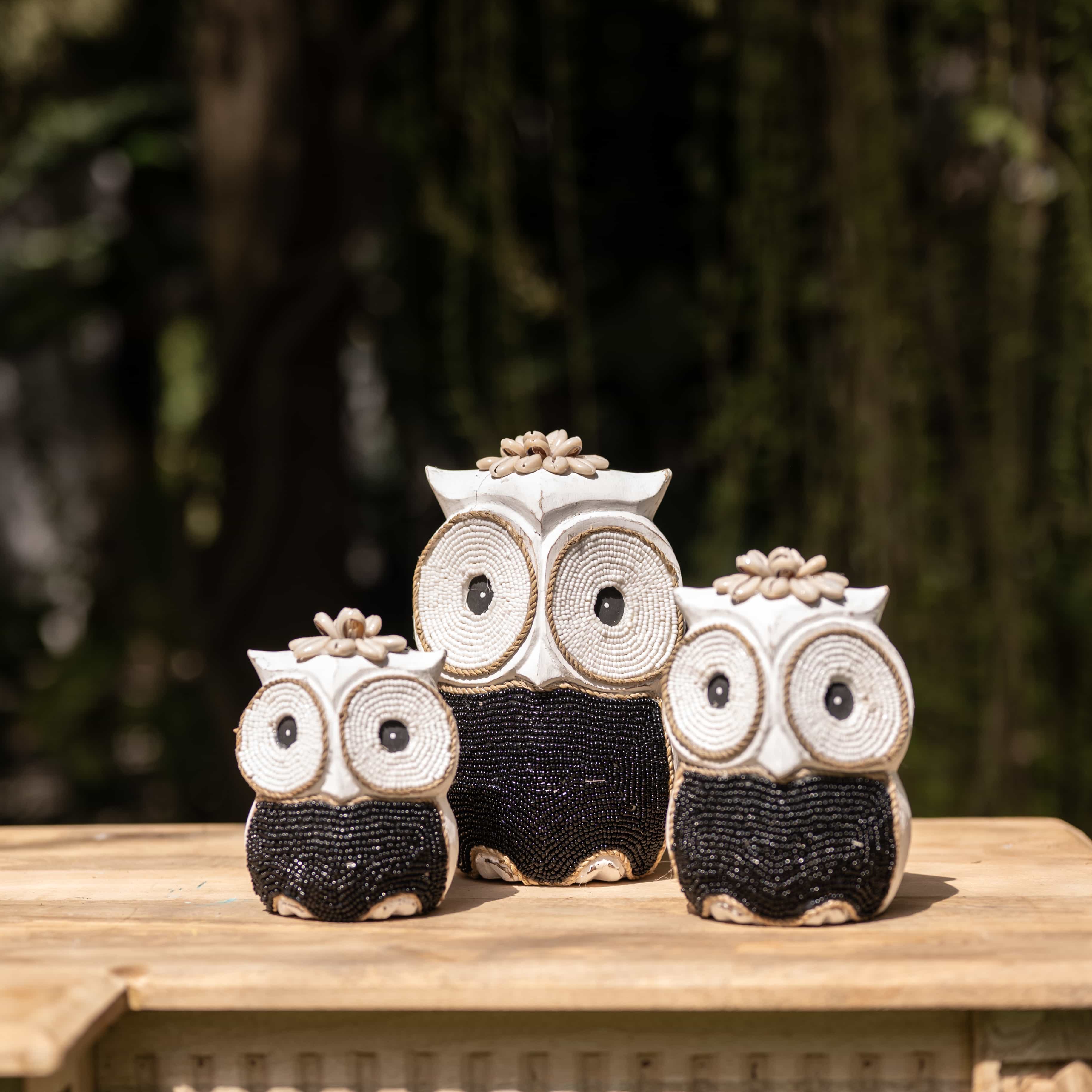 The maker winds stark white cord and obsidian beads to give these nocturnal watchers their wide-eyed stare. Designed to stand together as a silent, stylish guard for your space.