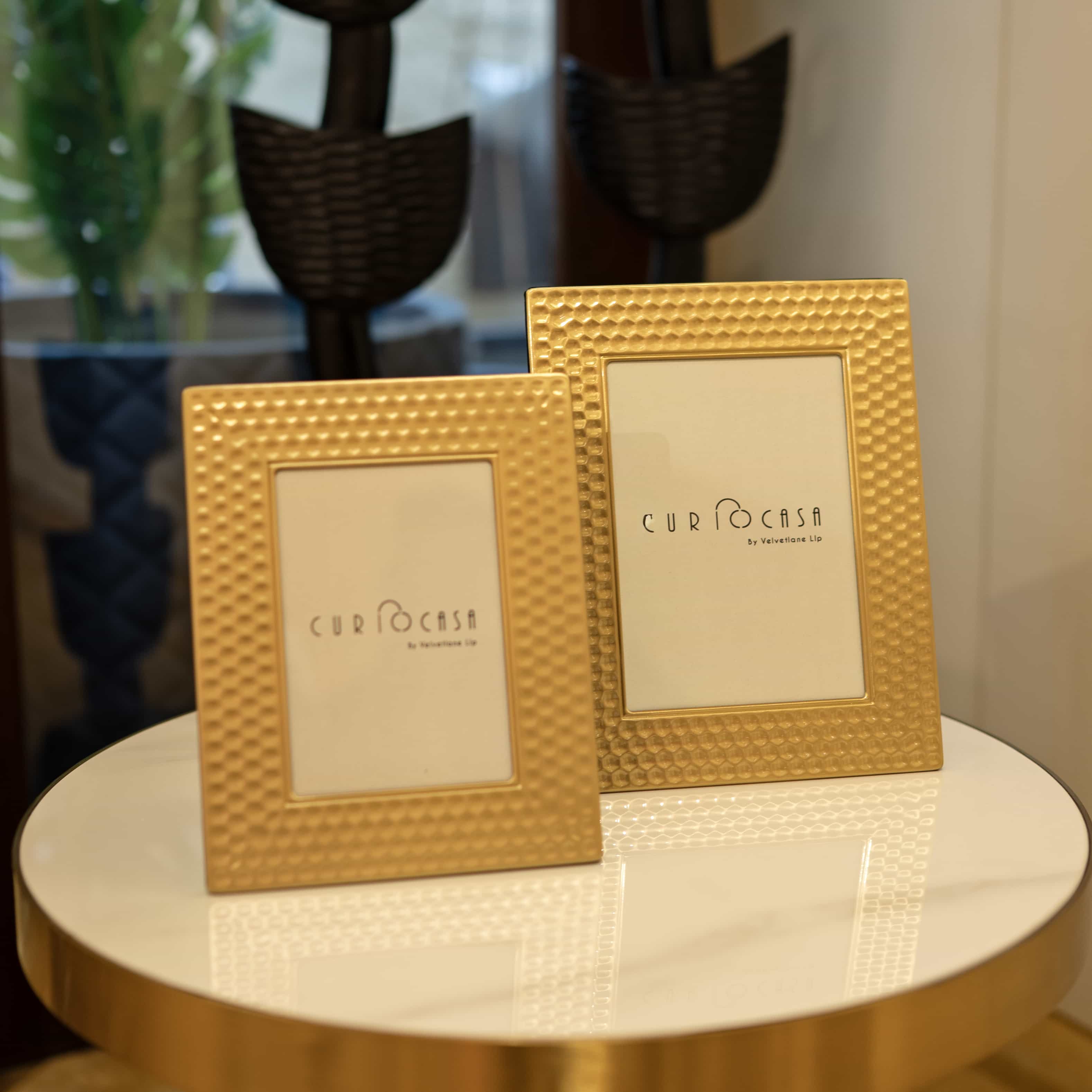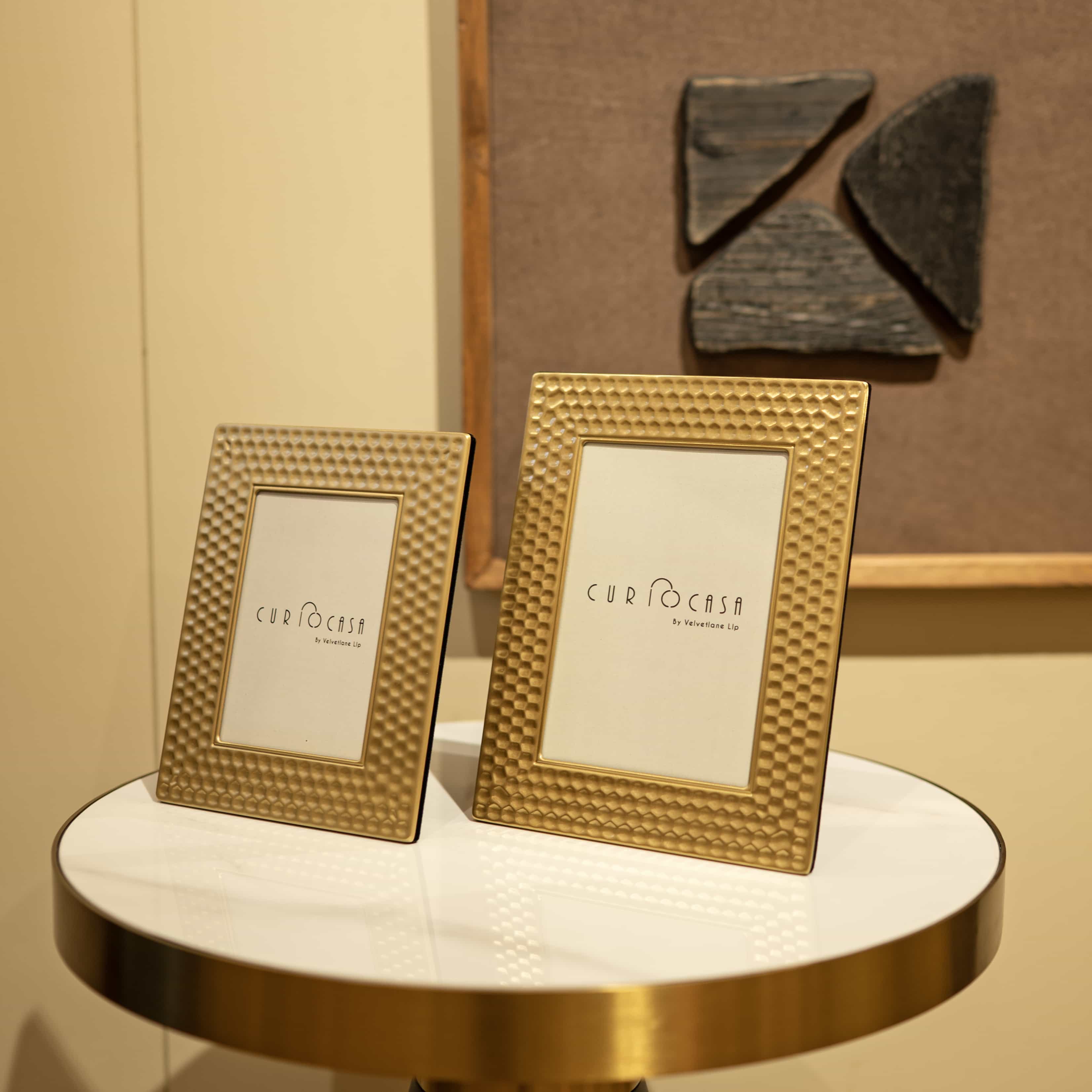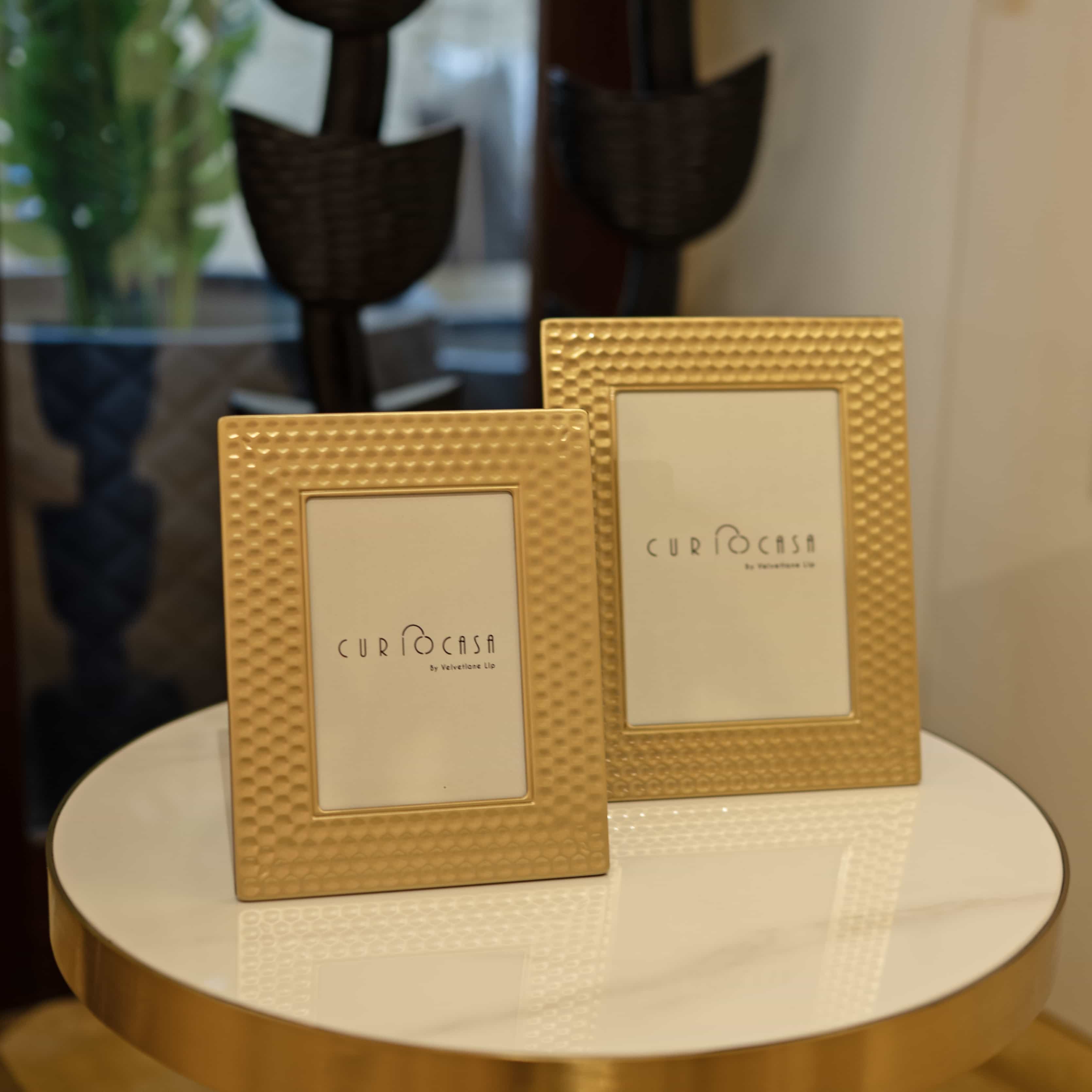 Lustra is a set of two gold frames with textured detailing. Use this set to add a touch of gold and shine into your space, bringing in a vintage, royal feel to it.