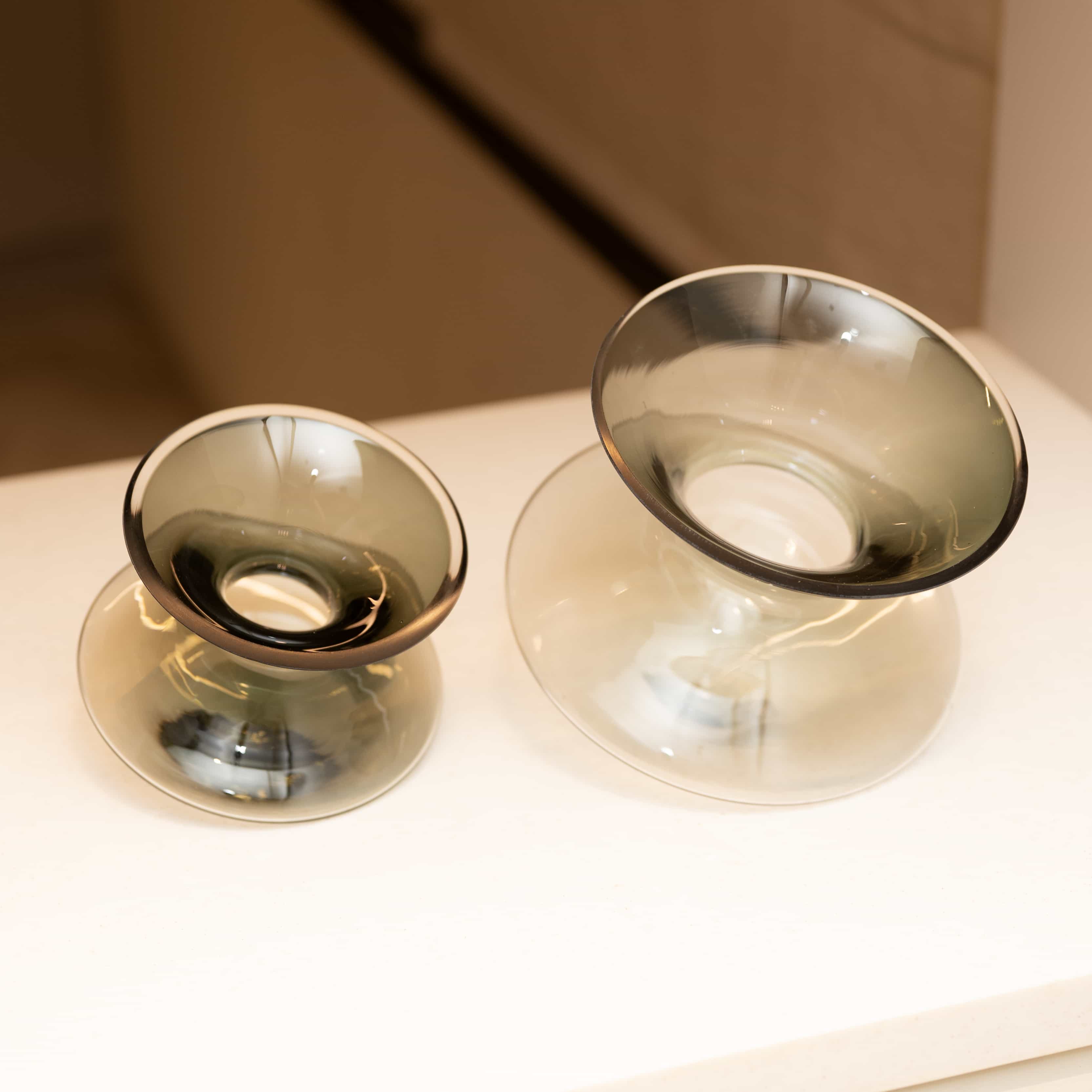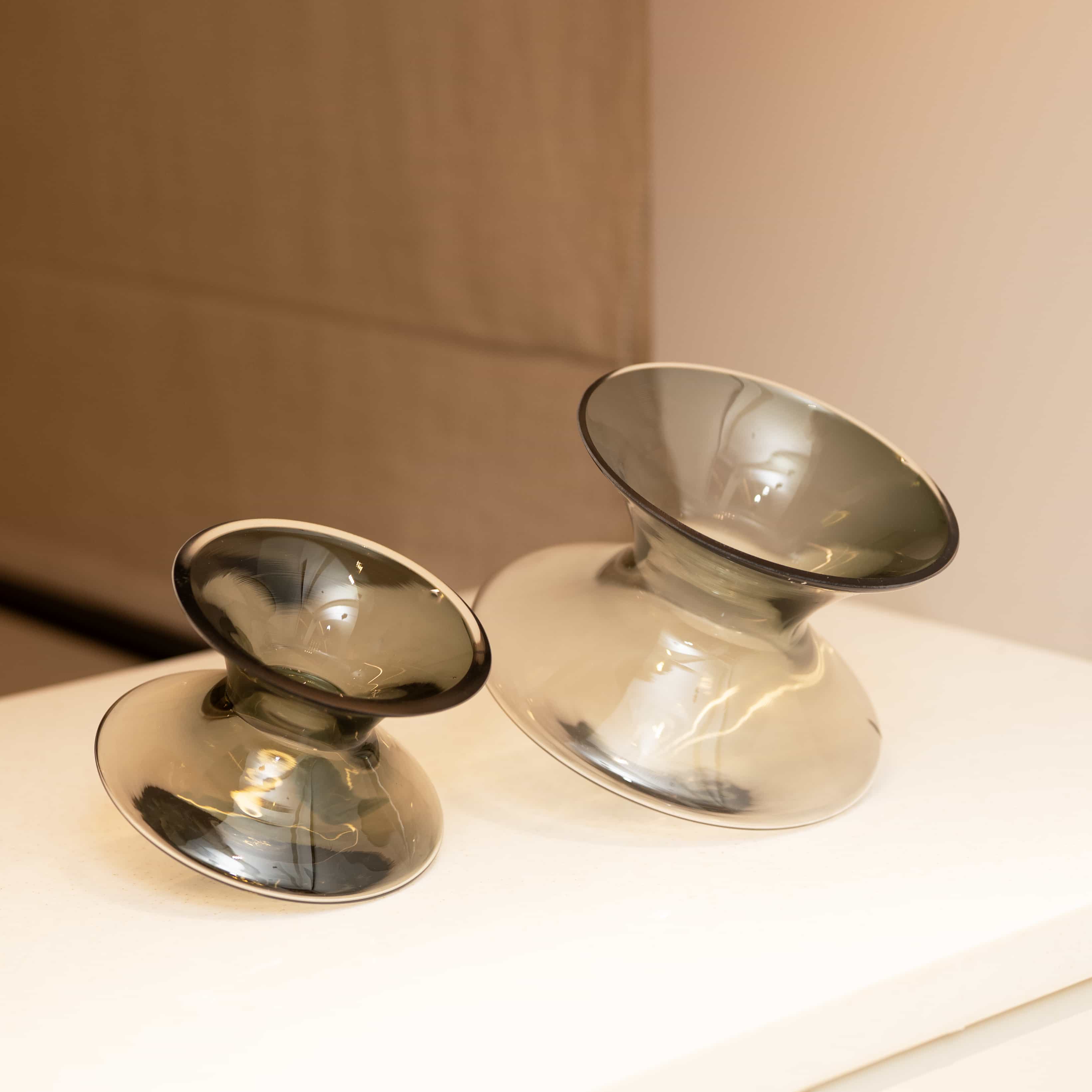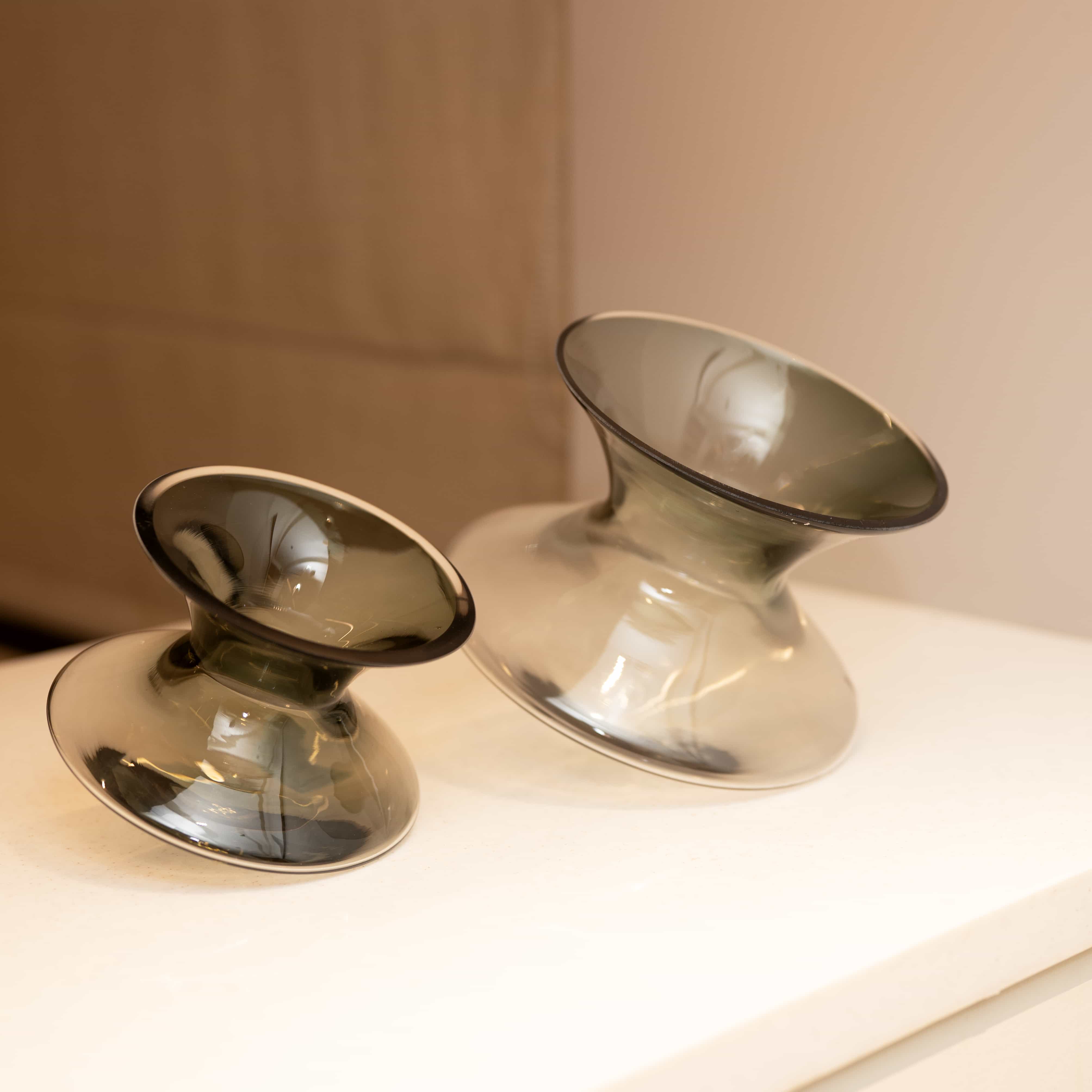 Mercury Bloom is a set of two glass vases with a smoke-grey sheen. Trumpet flares and low, rounded bases catch light like liquid metal, creating soft reflections. Style as sculptural accents or cradle in with some stems, perfect for modern, minimal, or glam rooms.