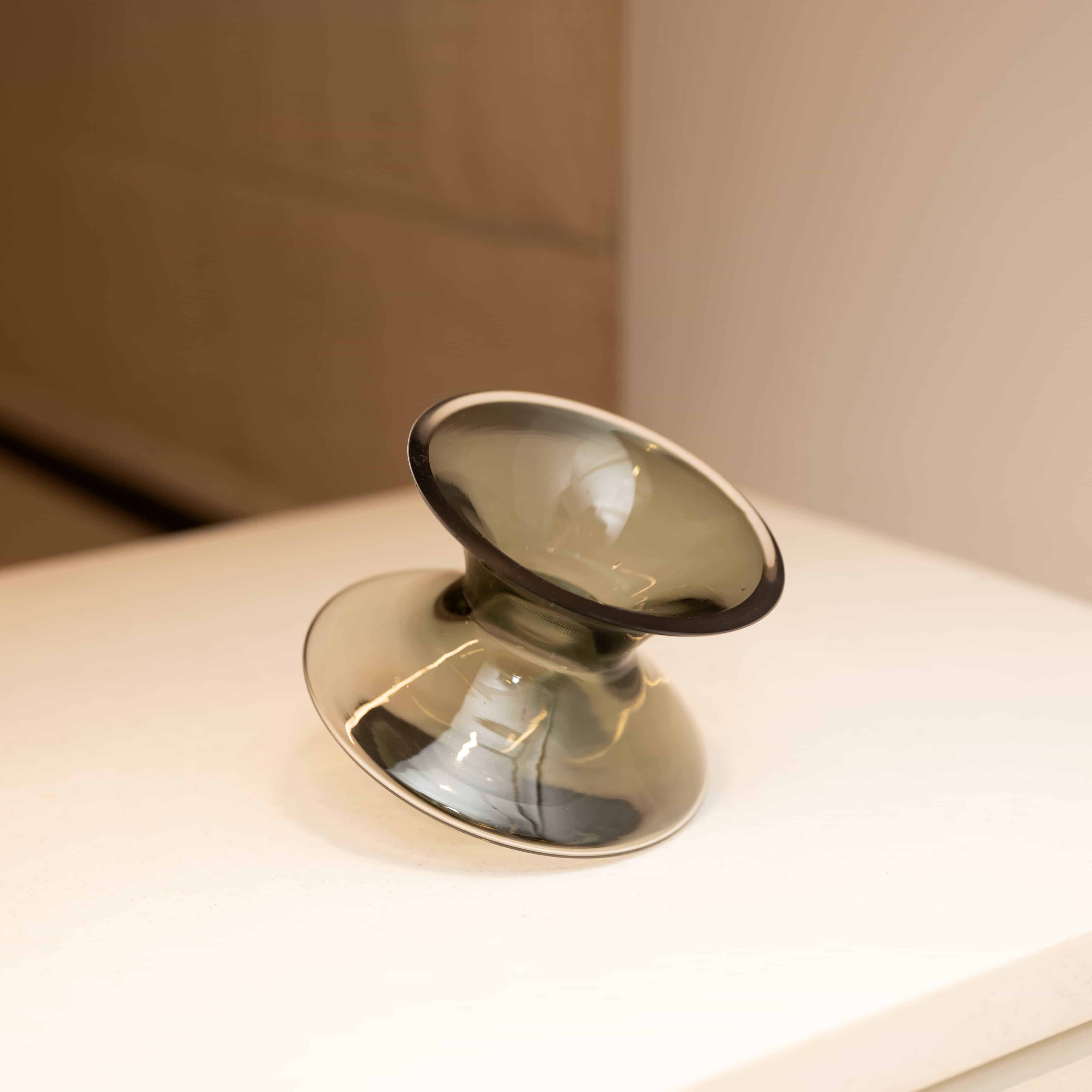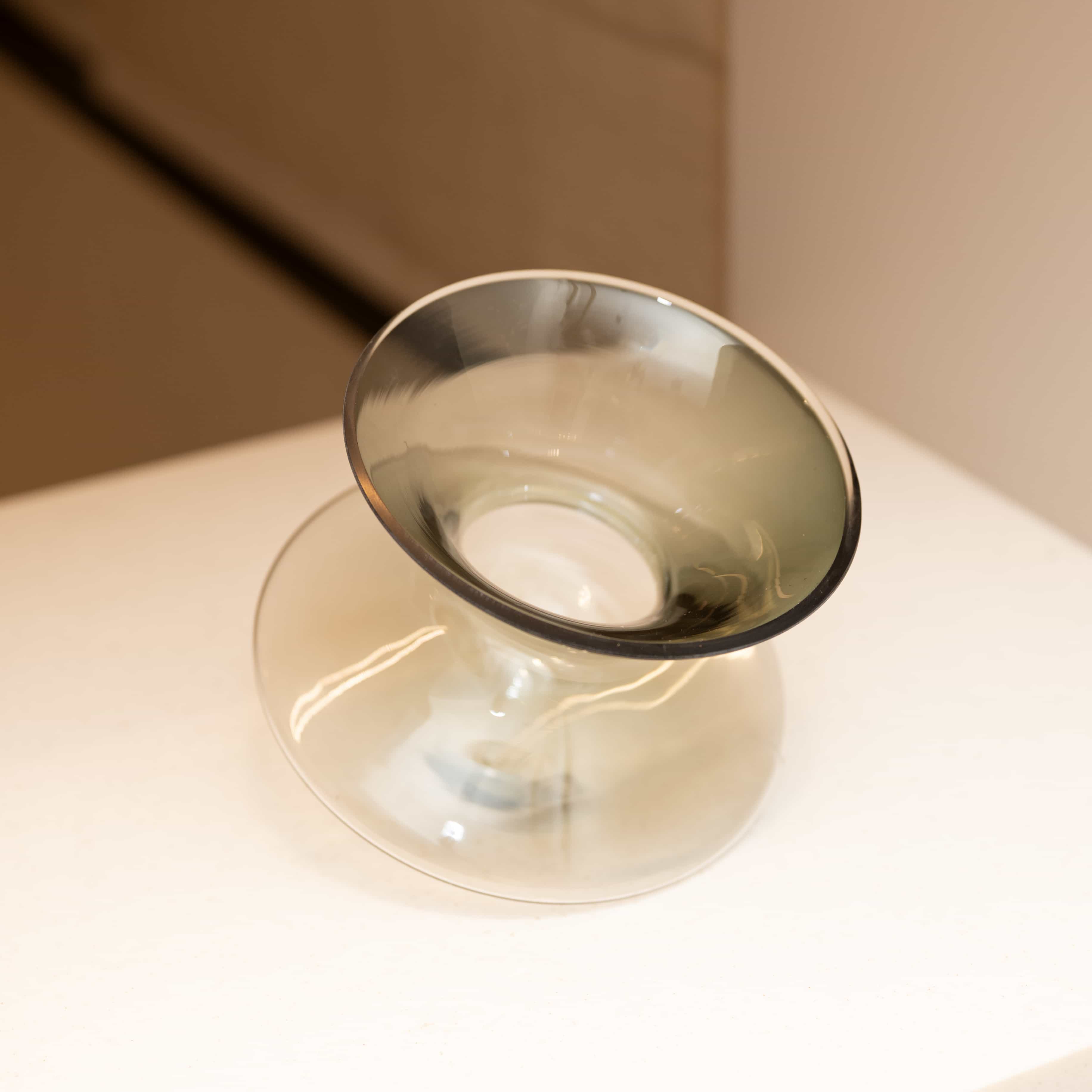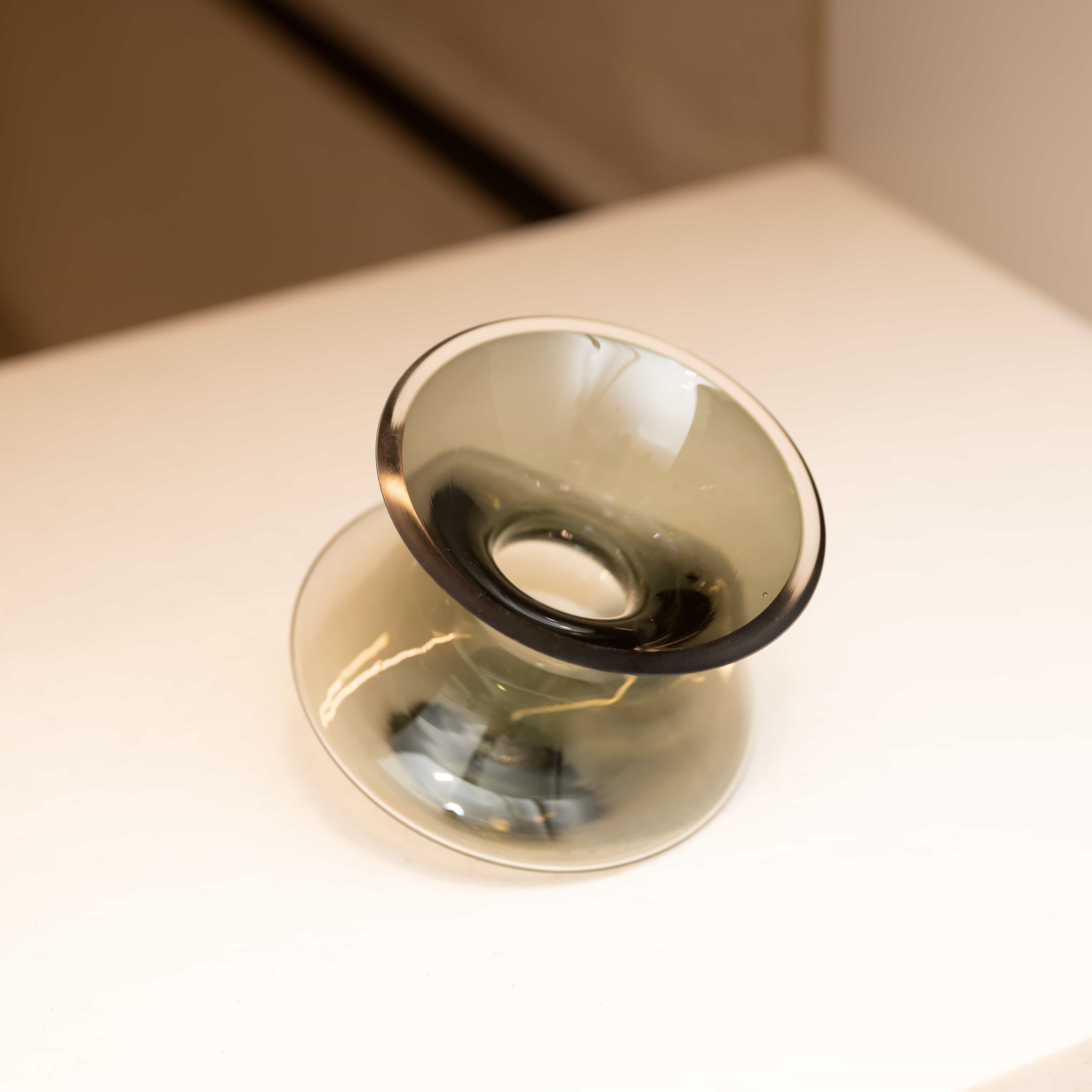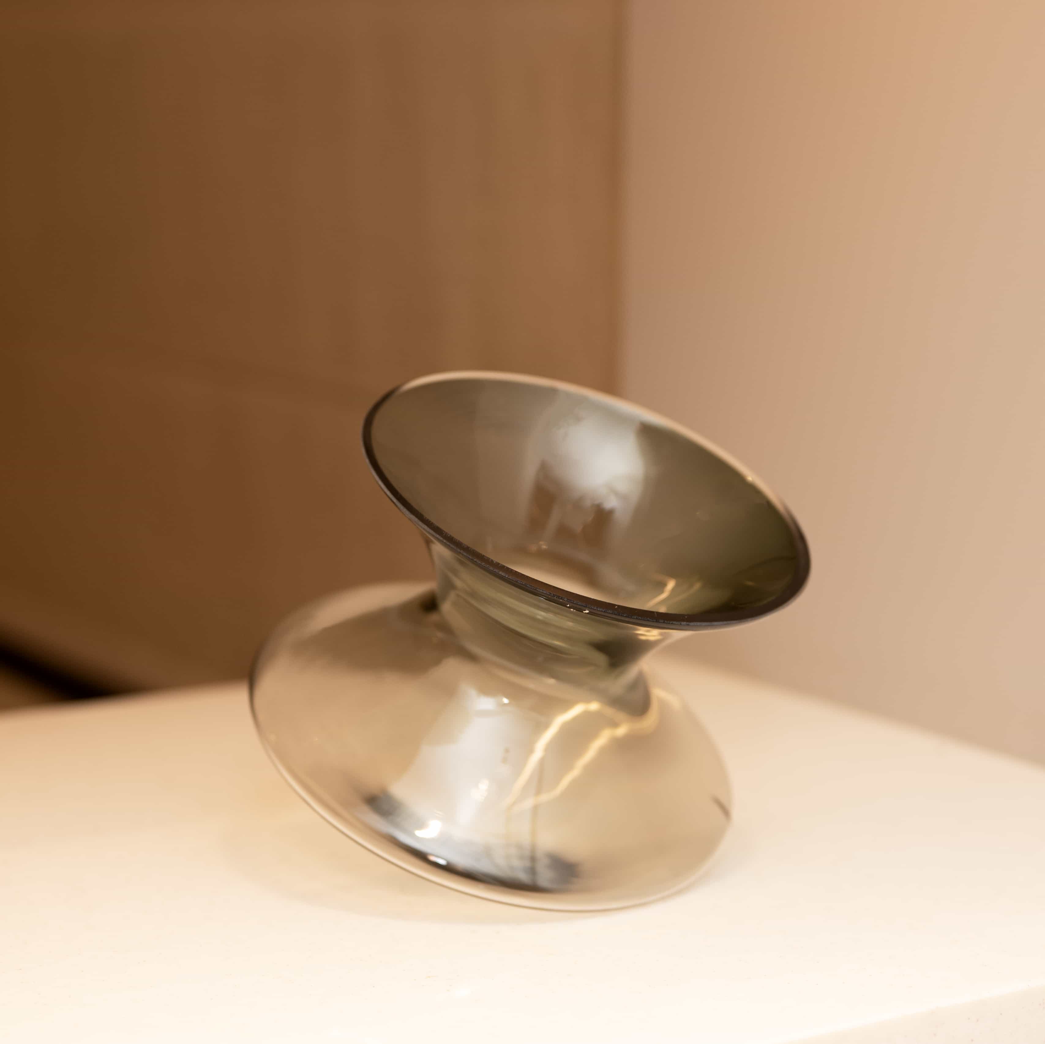 Mercury Bloom is a set of two glass vases with a smoke-grey sheen. Trumpet flares and low, rounded bases catch light like liquid metal, creating soft reflections. Style as sculptural accents or cradle in with some stems, perfect for modern, minimal, or glam rooms.
