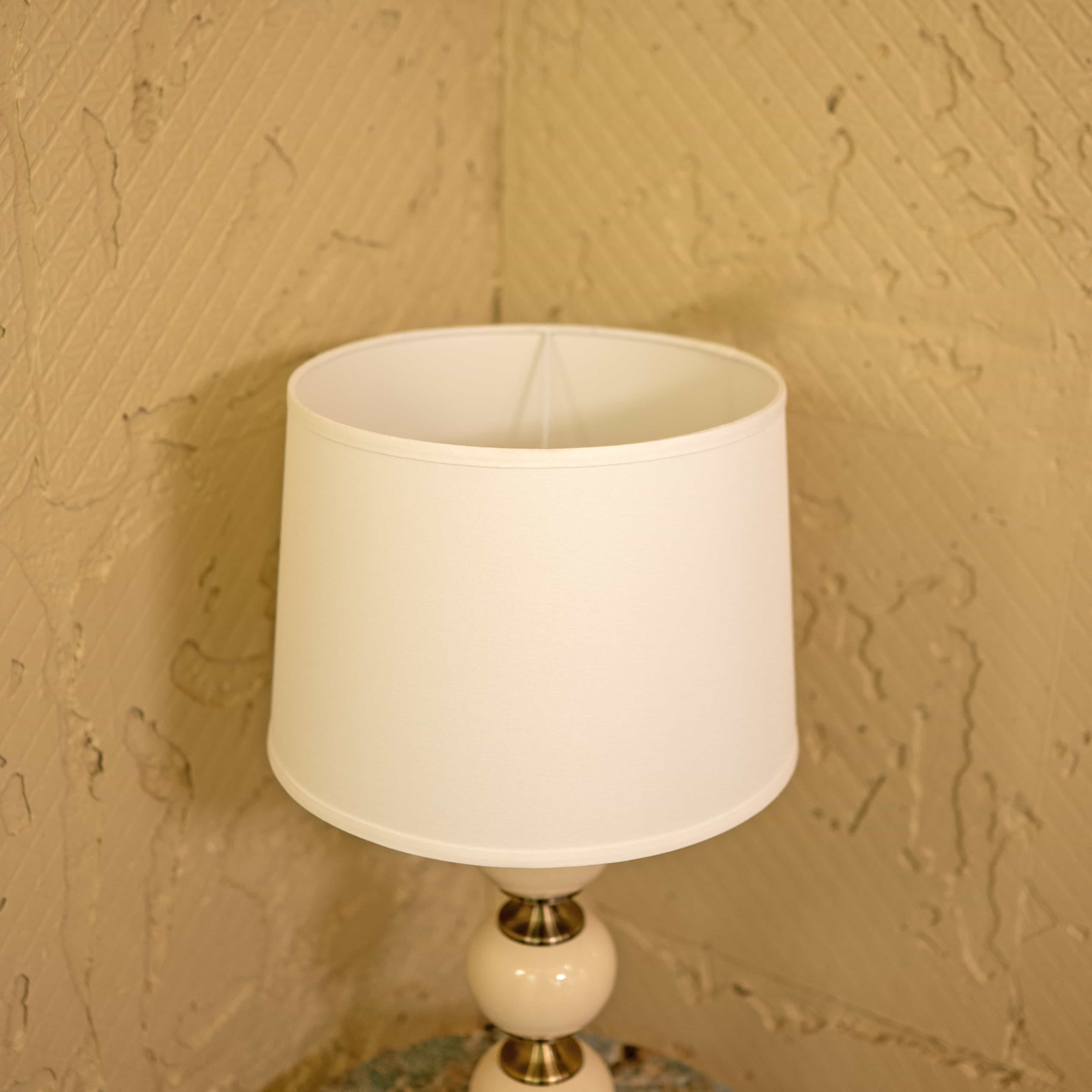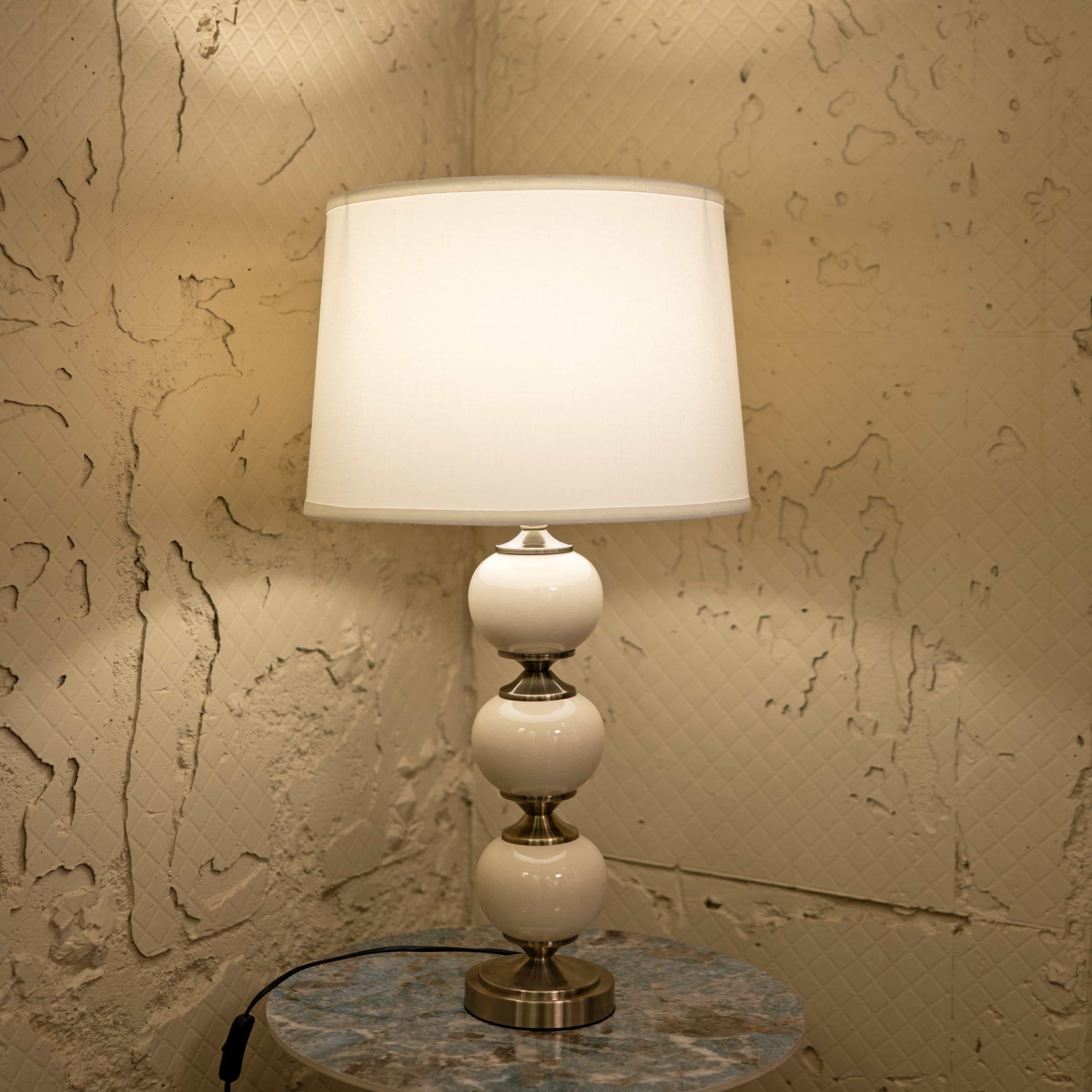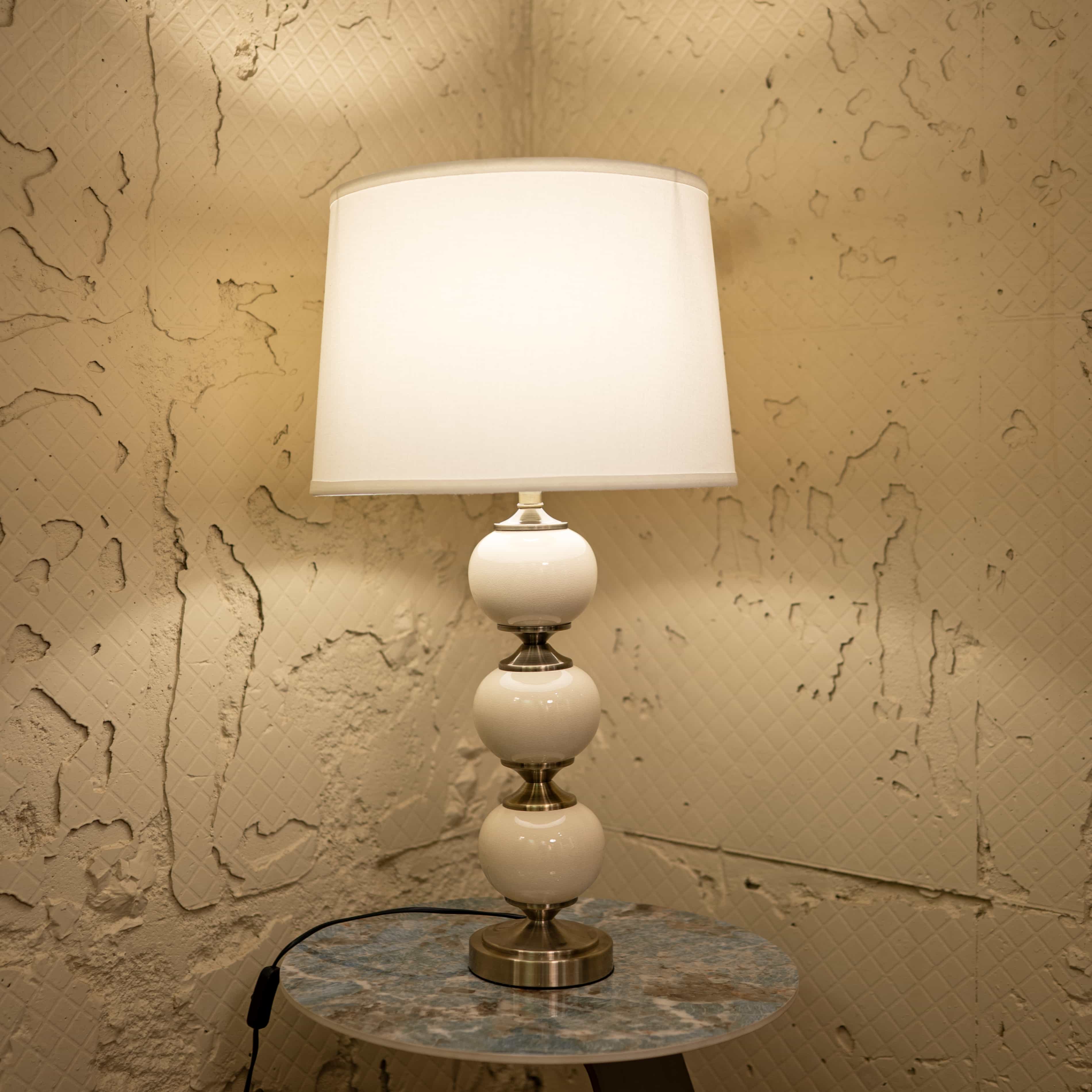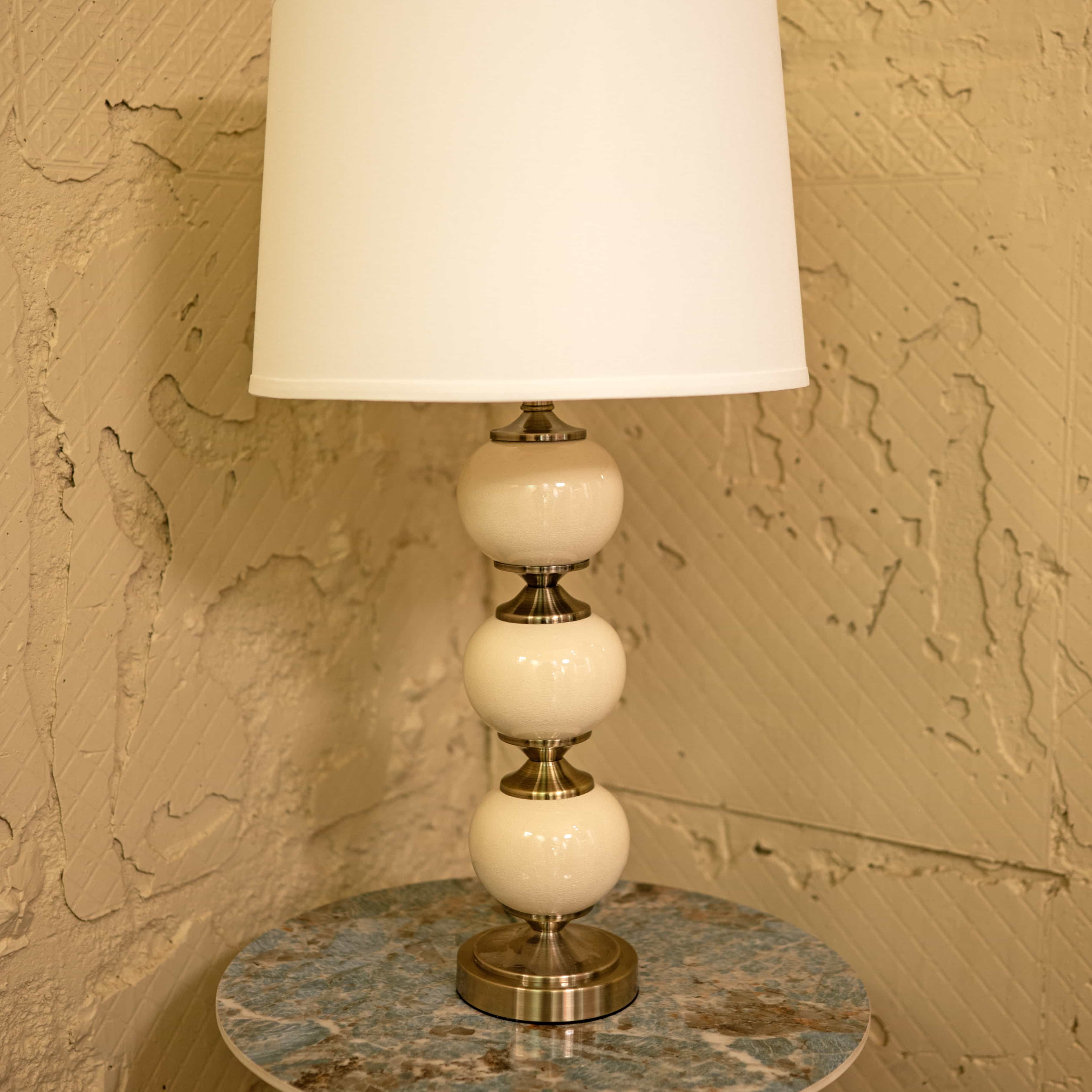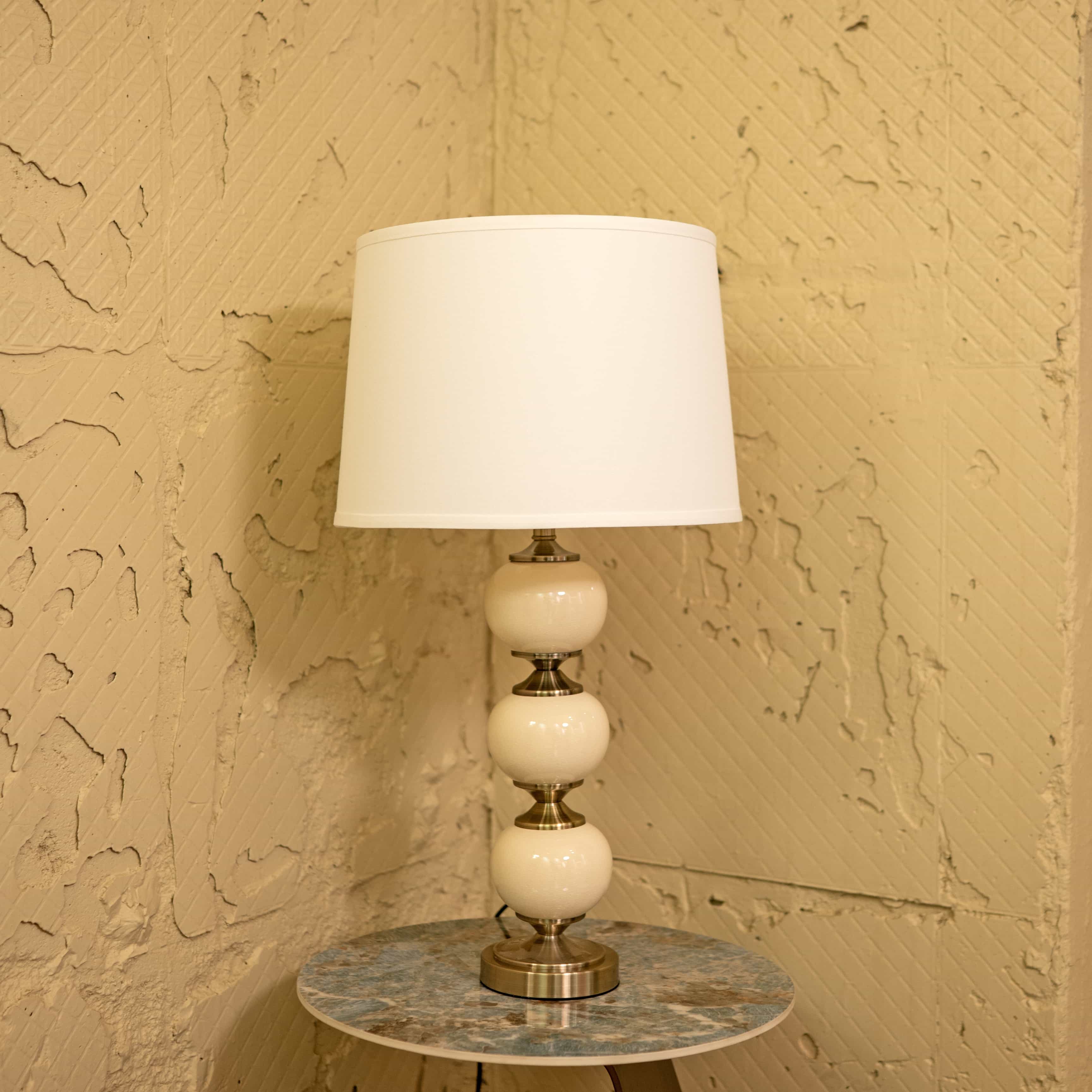 Moonlit is a contemporary table lamp with a tiered spherical base in smooth neutral tones, accented by polished metal details. Its dome shaped fabric shade casts a soft, inviting light, perfect for creating a serene atmosphere.