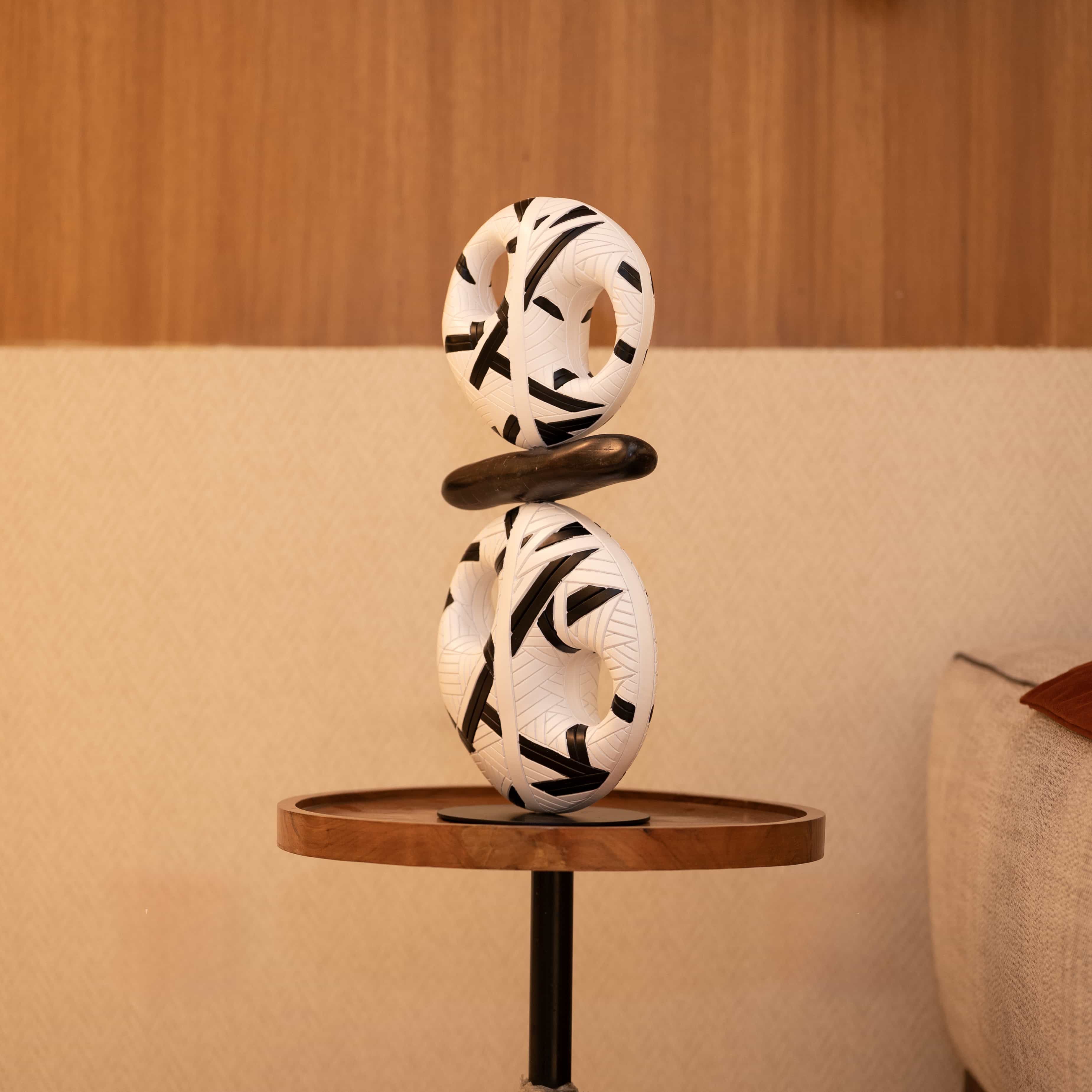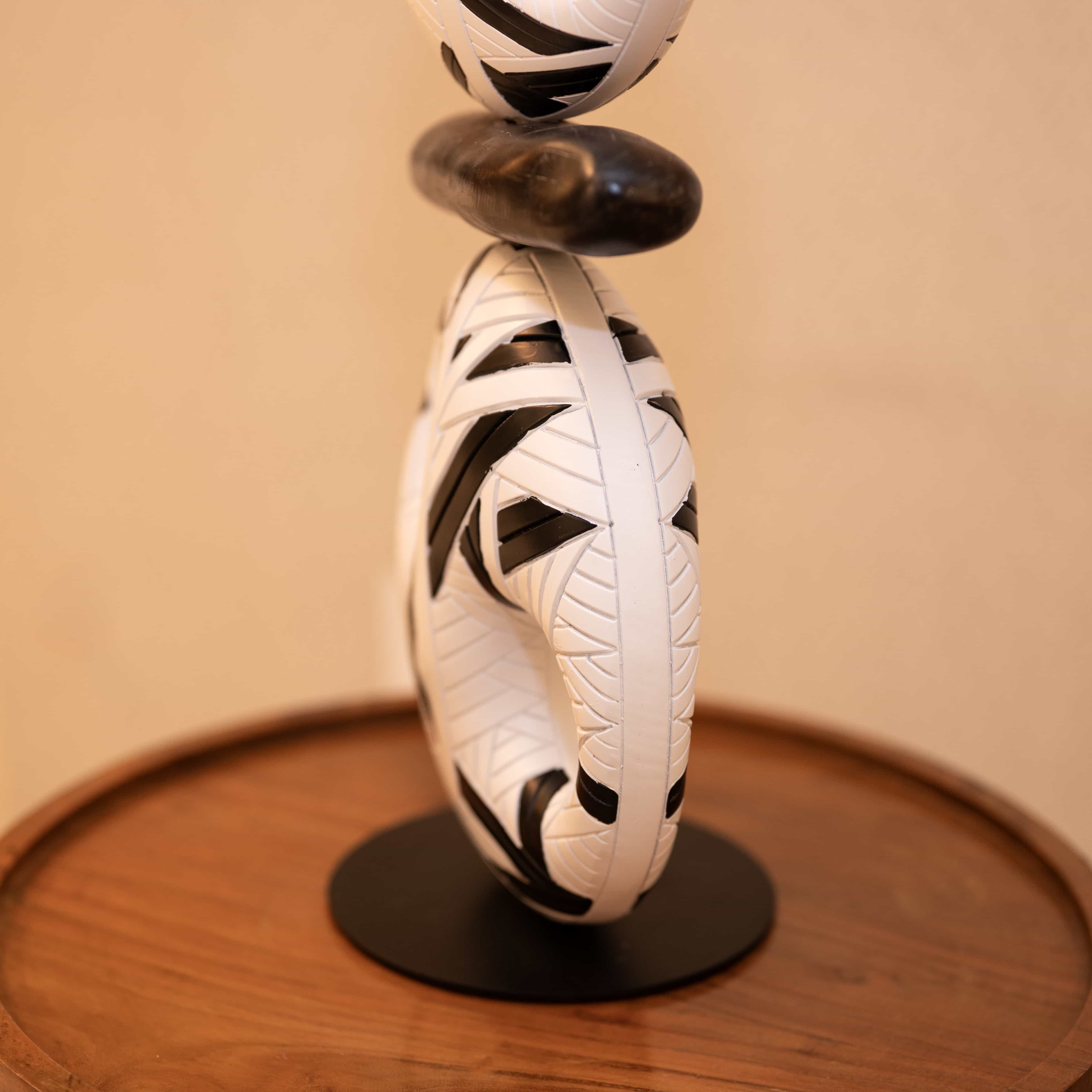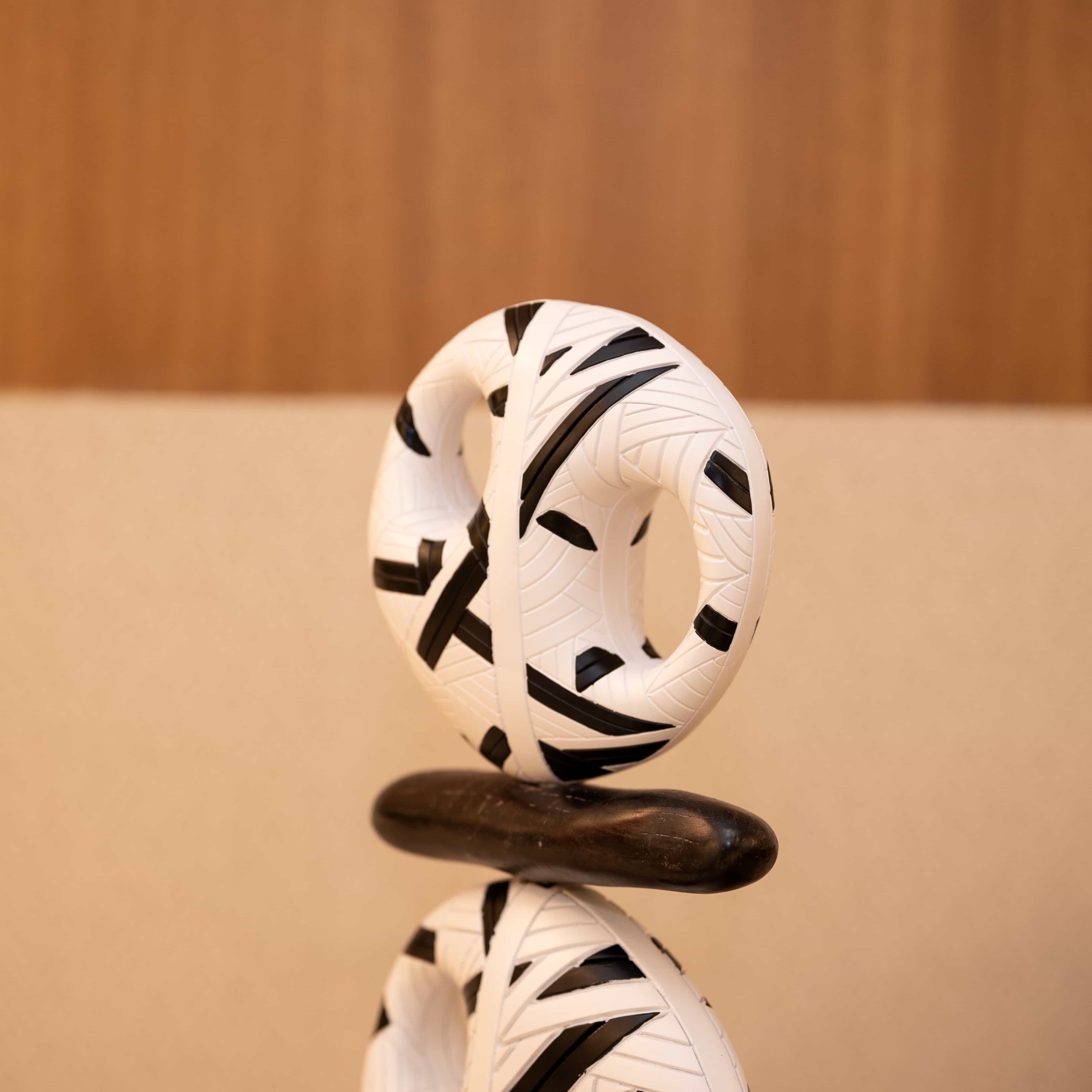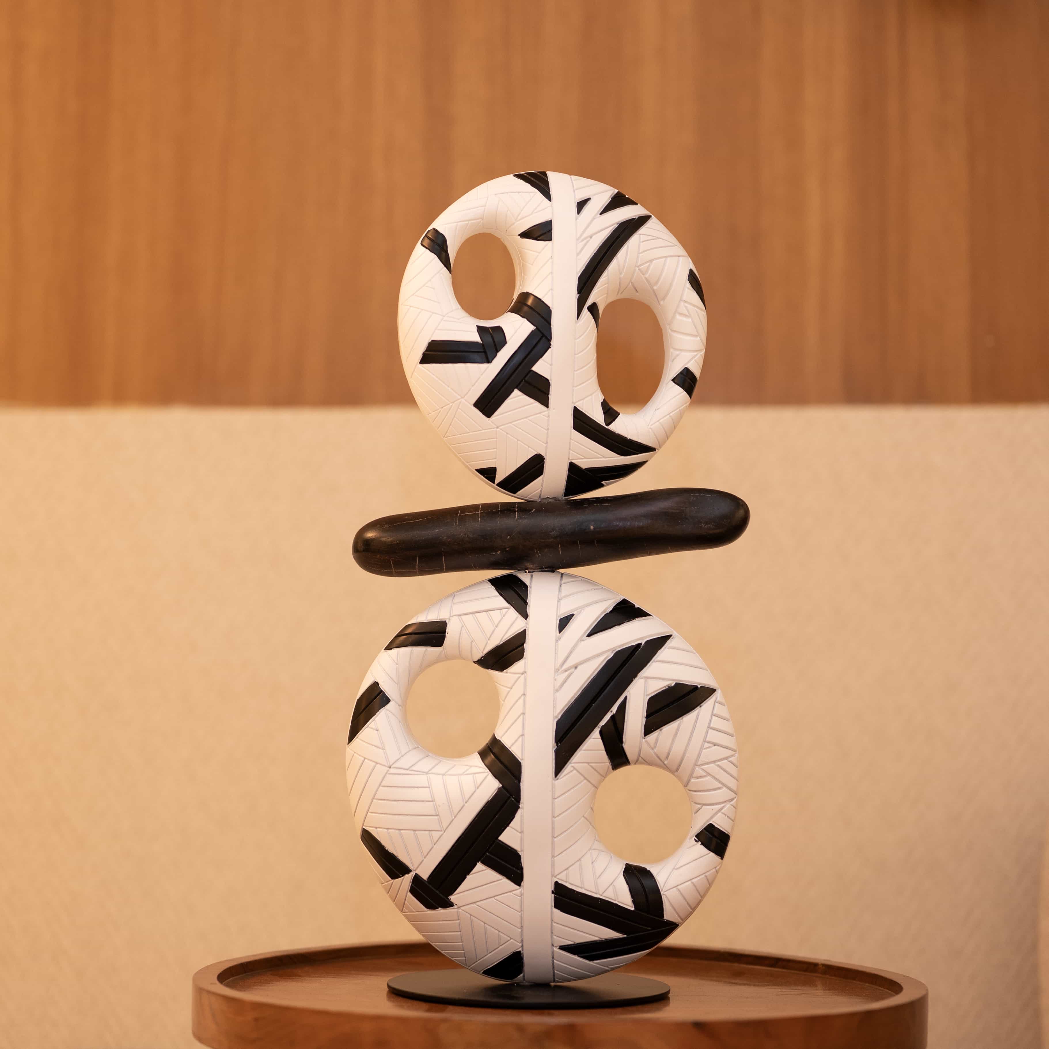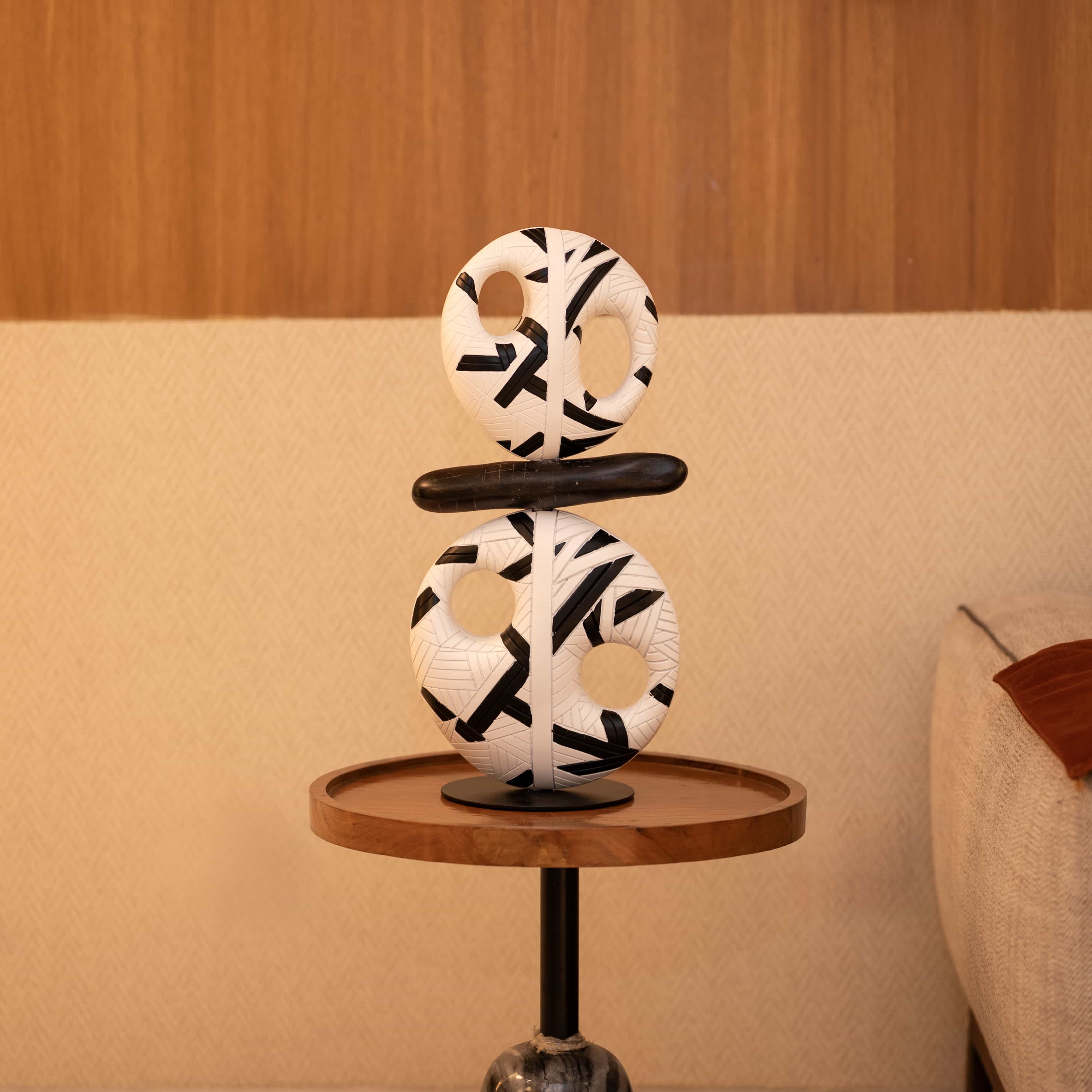 Orbit showcases two round sculptural forms with striking black abstract brush patterns on a white surface, separated by a sleek dark disc. This bold, contemporary piece adds artistic dimension and visual interest to modern interiors or curated display spaces.