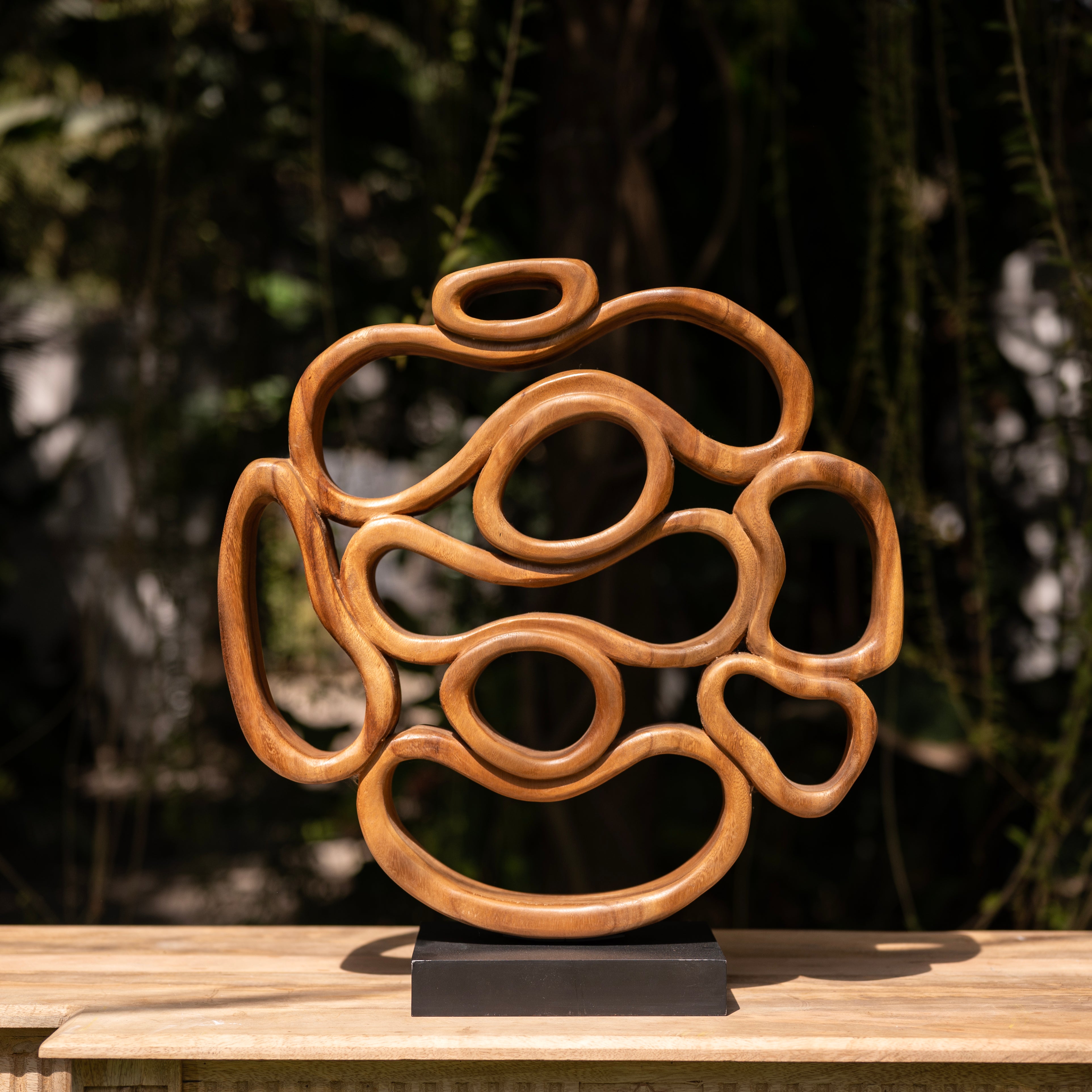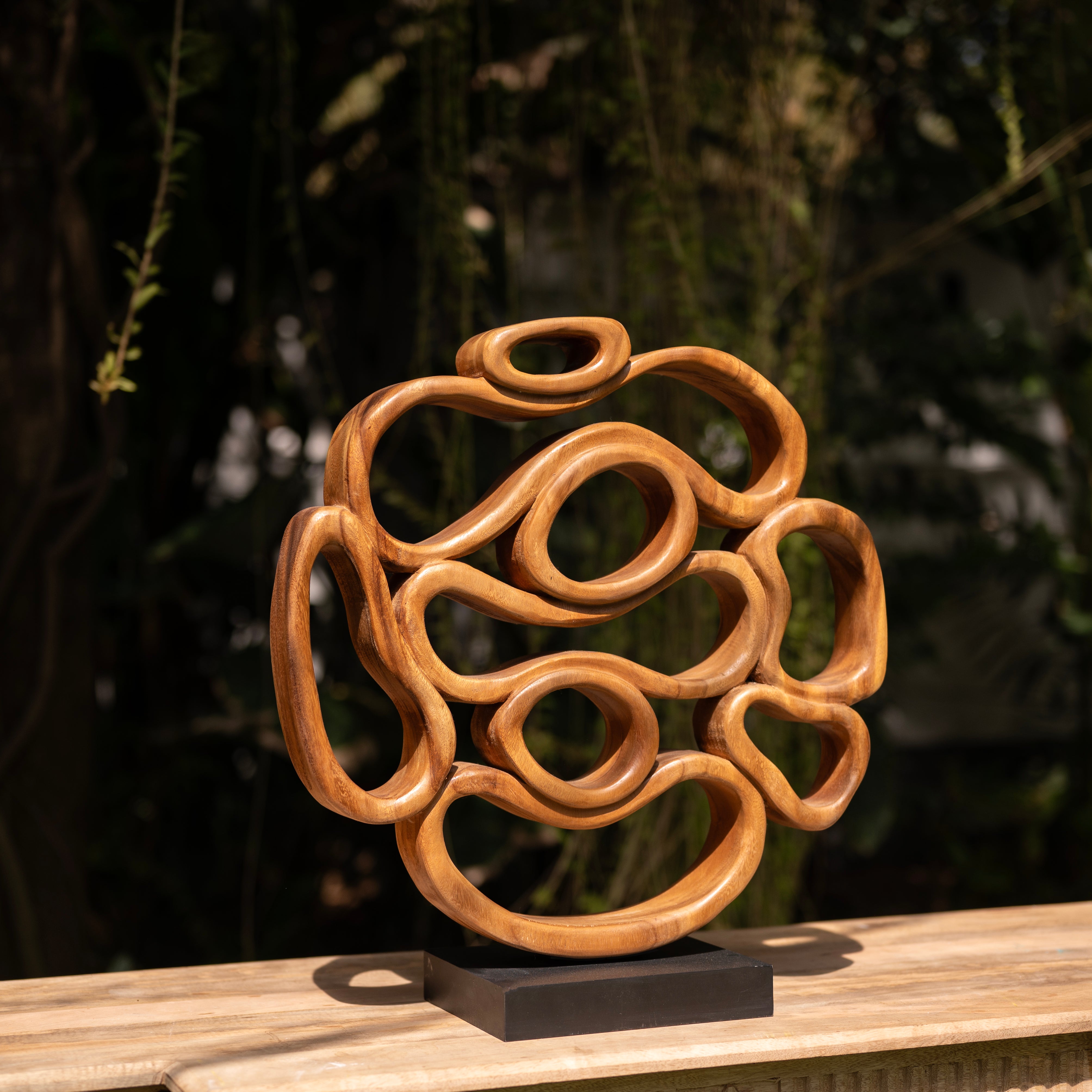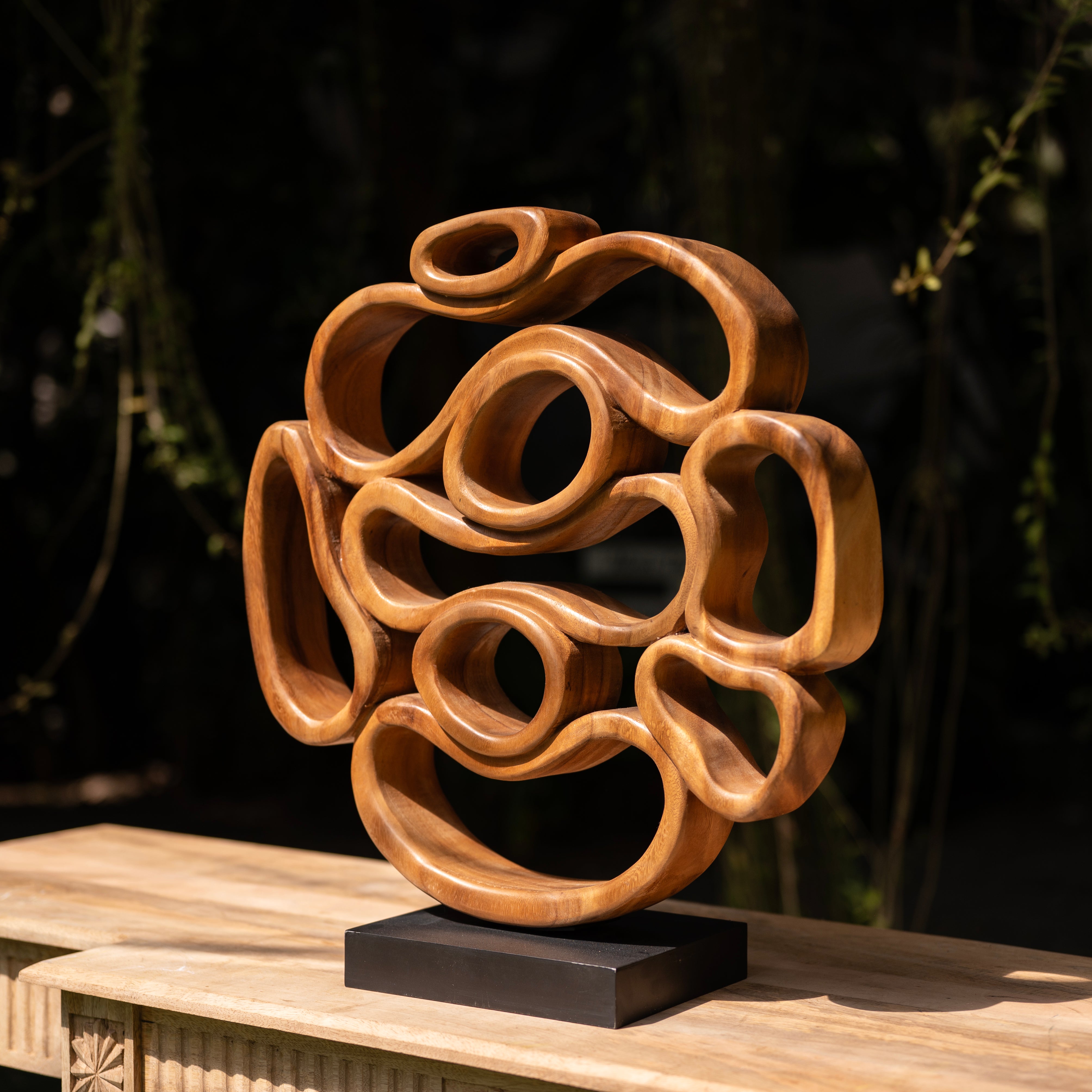 Guided by the natural rhythm of the wood, the artisan has meticulously carved these interlocking fluidities to represent the infinite cycles found within the forest. This centerpiece uses heavy timber to transform into a weightless, soaring dance of light and shadow.