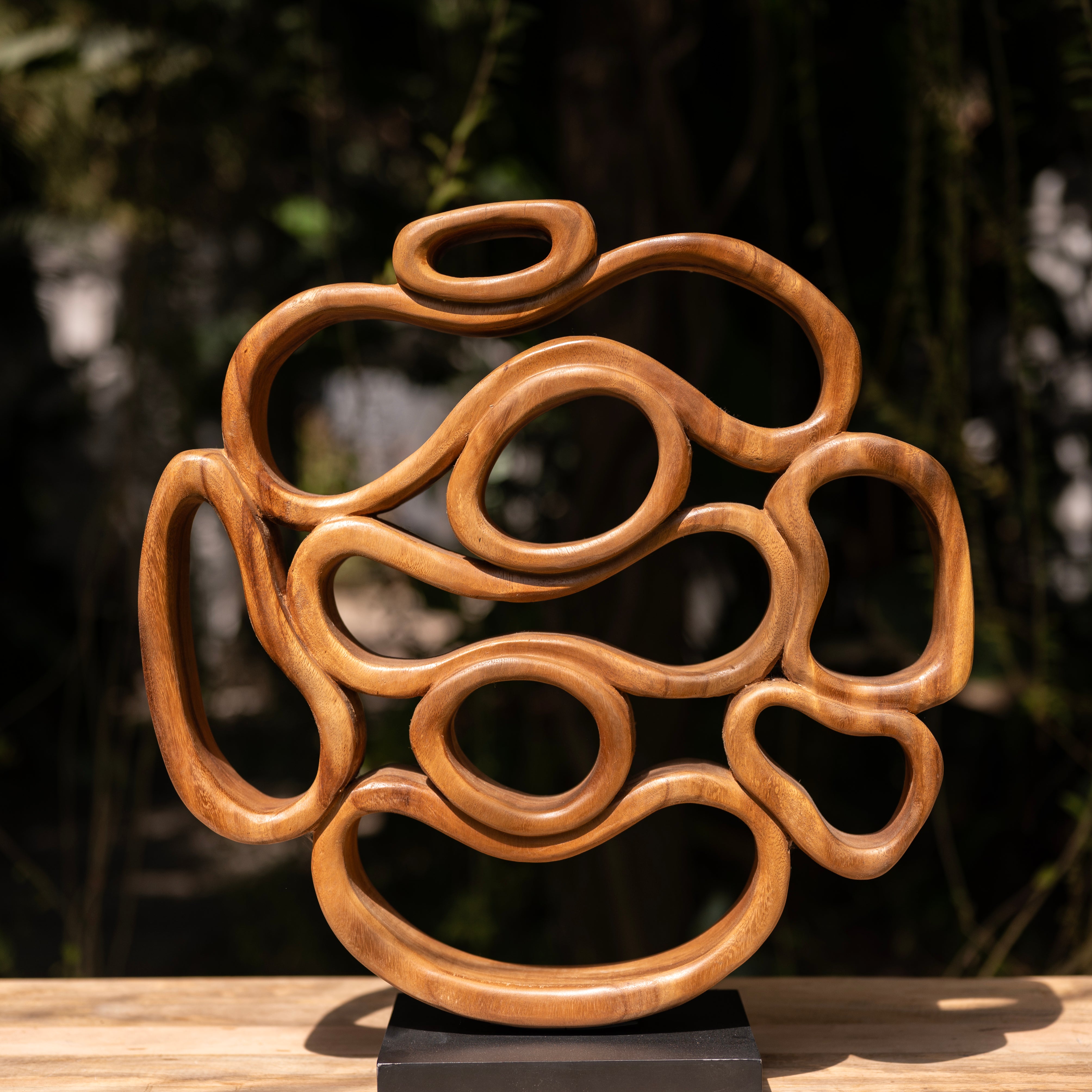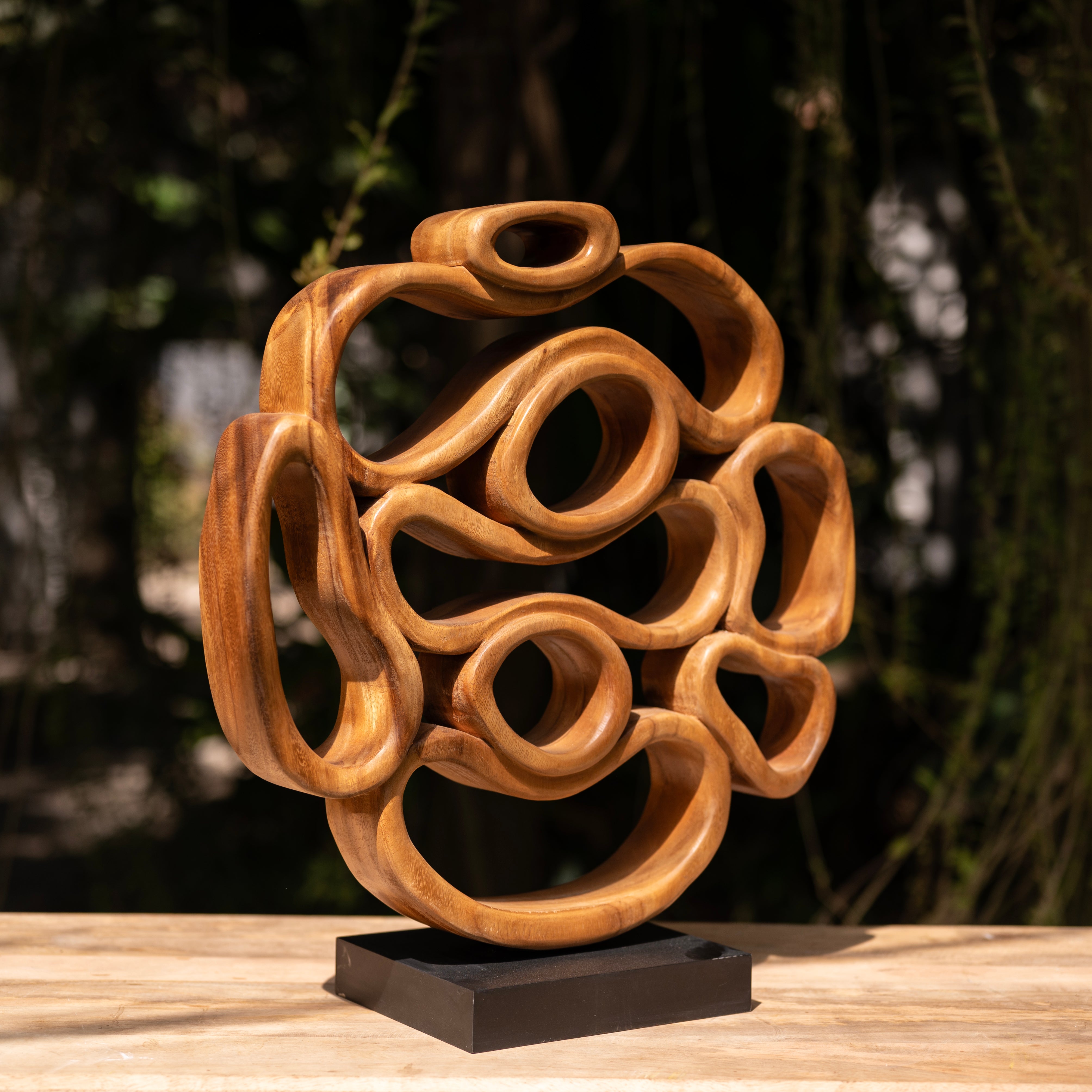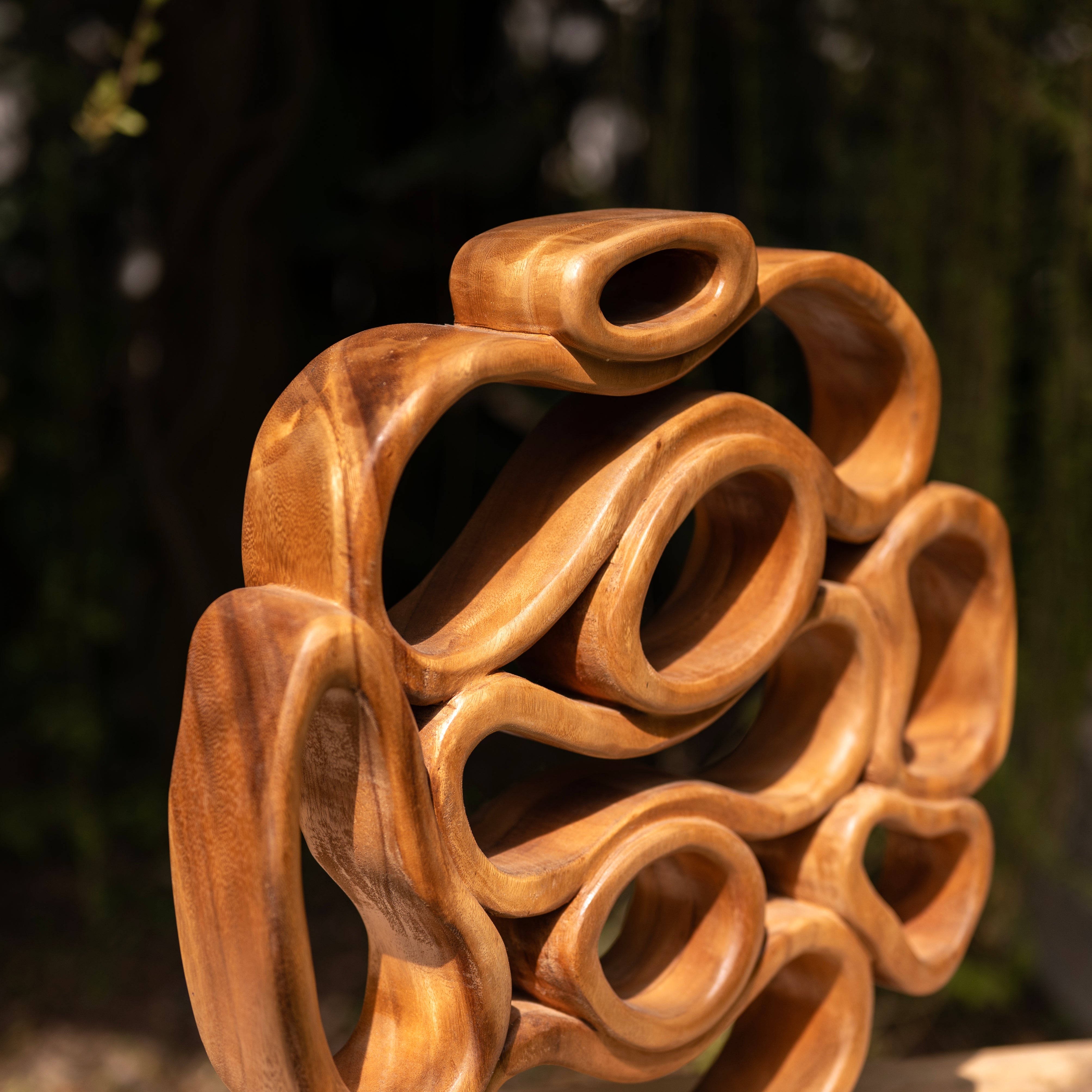 Guided by the natural rhythm of the wood, the artisan has meticulously carved these interlocking fluidities to represent the infinite cycles found within the forest. This centerpiece uses heavy timber to transform into a weightless, soaring dance of light and shadow.