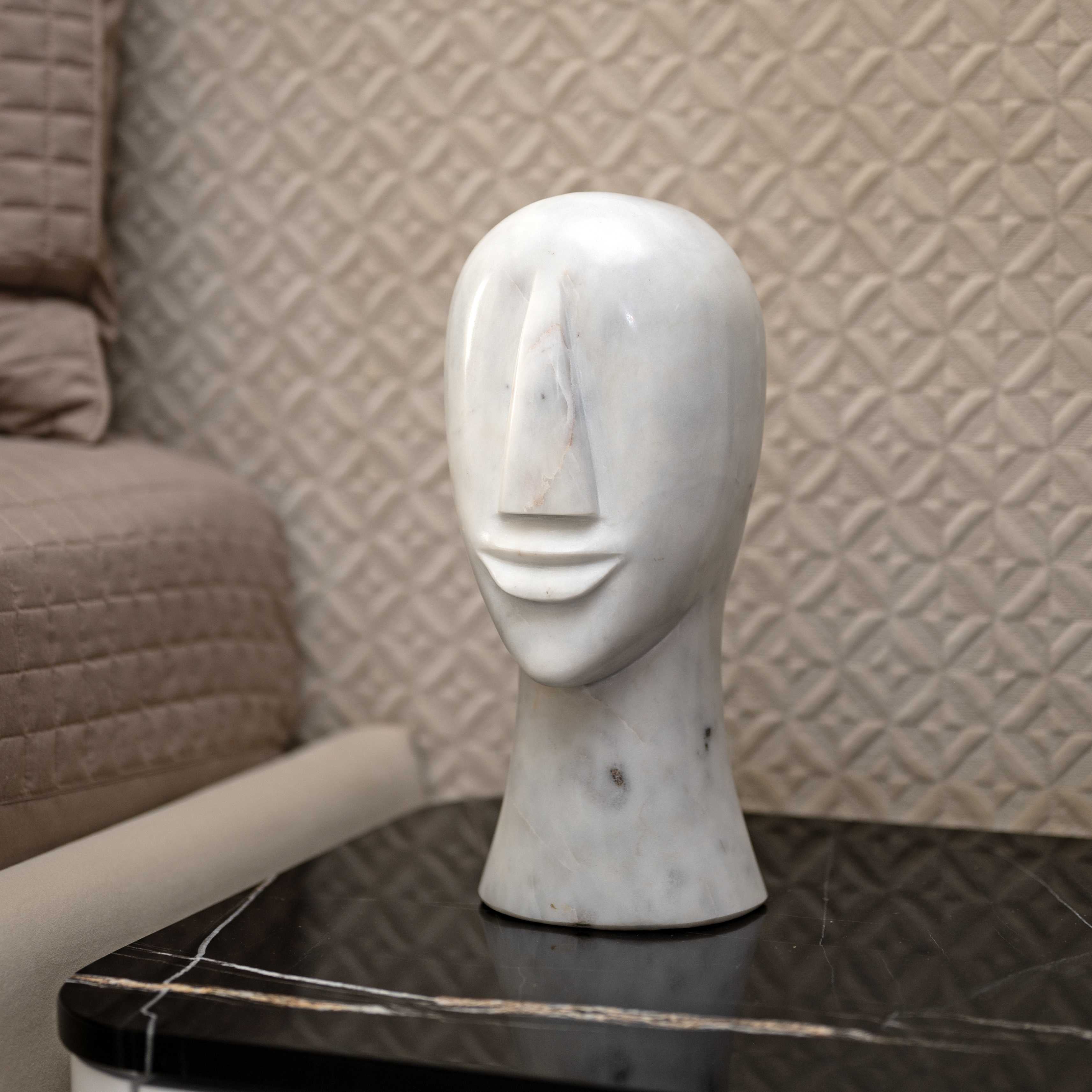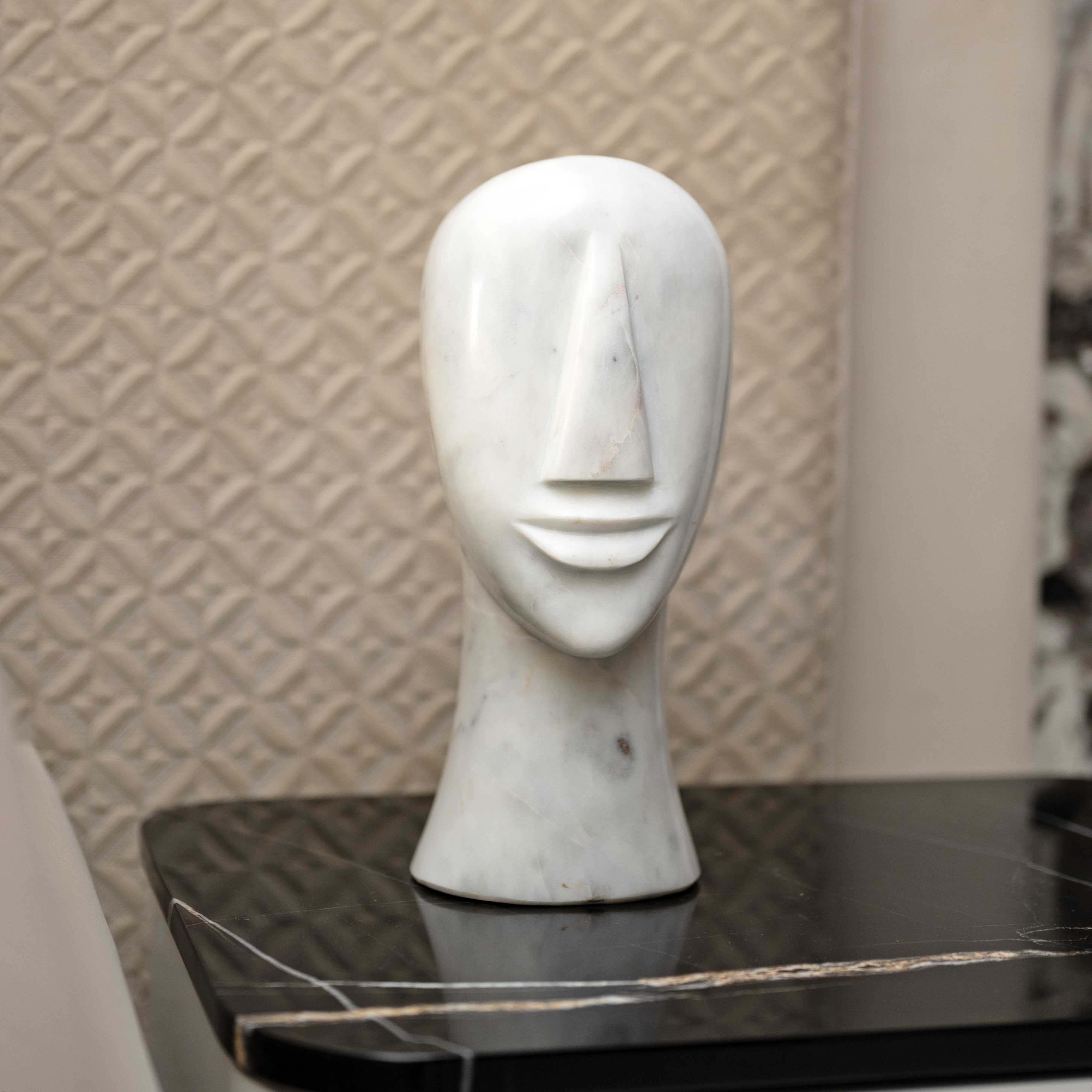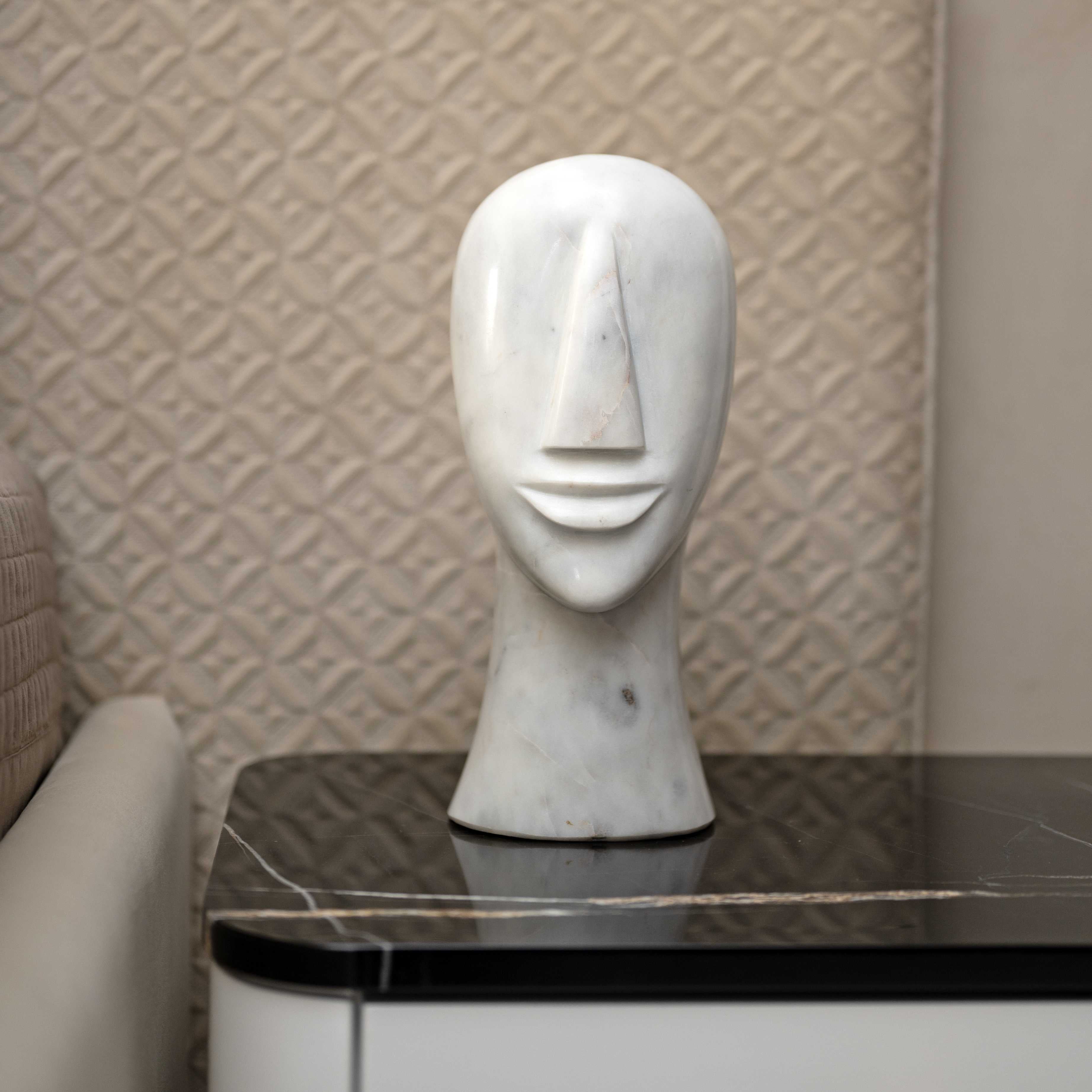 Serene is an all white face sculpture in marble. This piece is edgy, artistic and very modern elegant owing to its minimal nature. This would be a great addition to a home with modern decor theme.