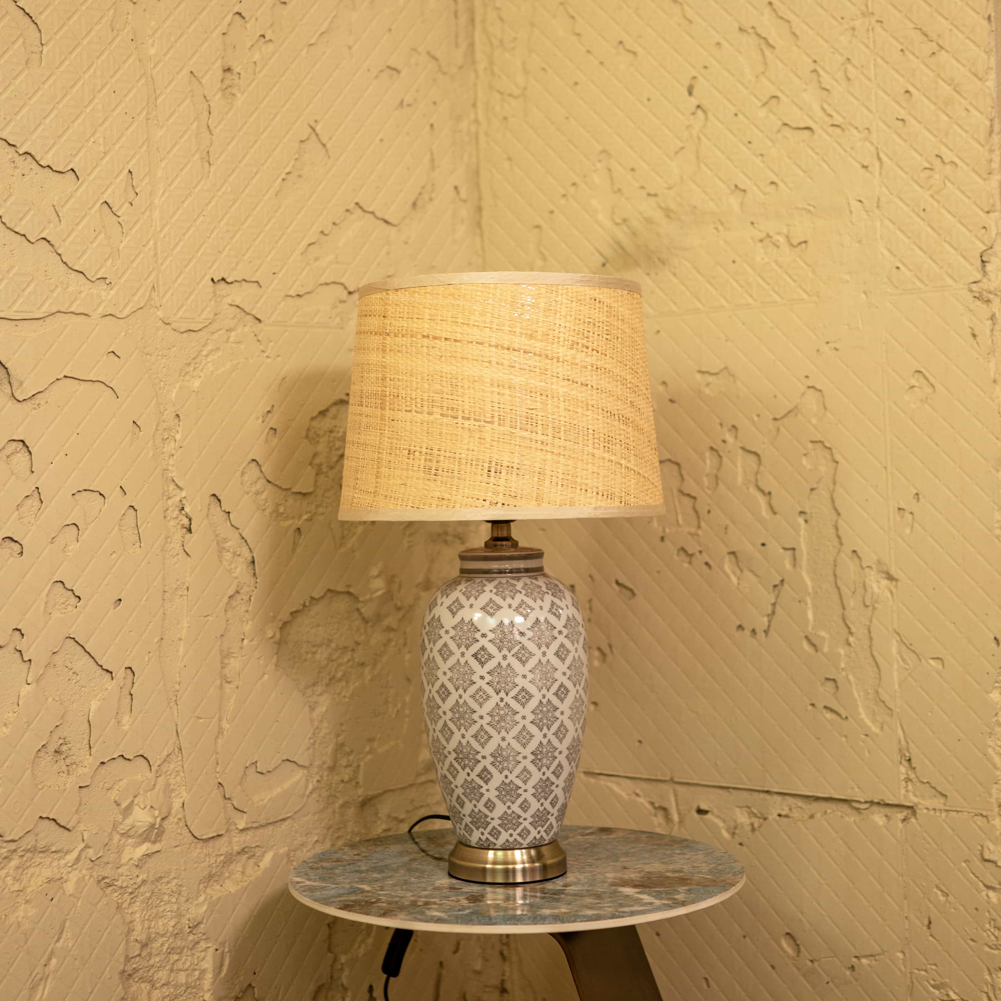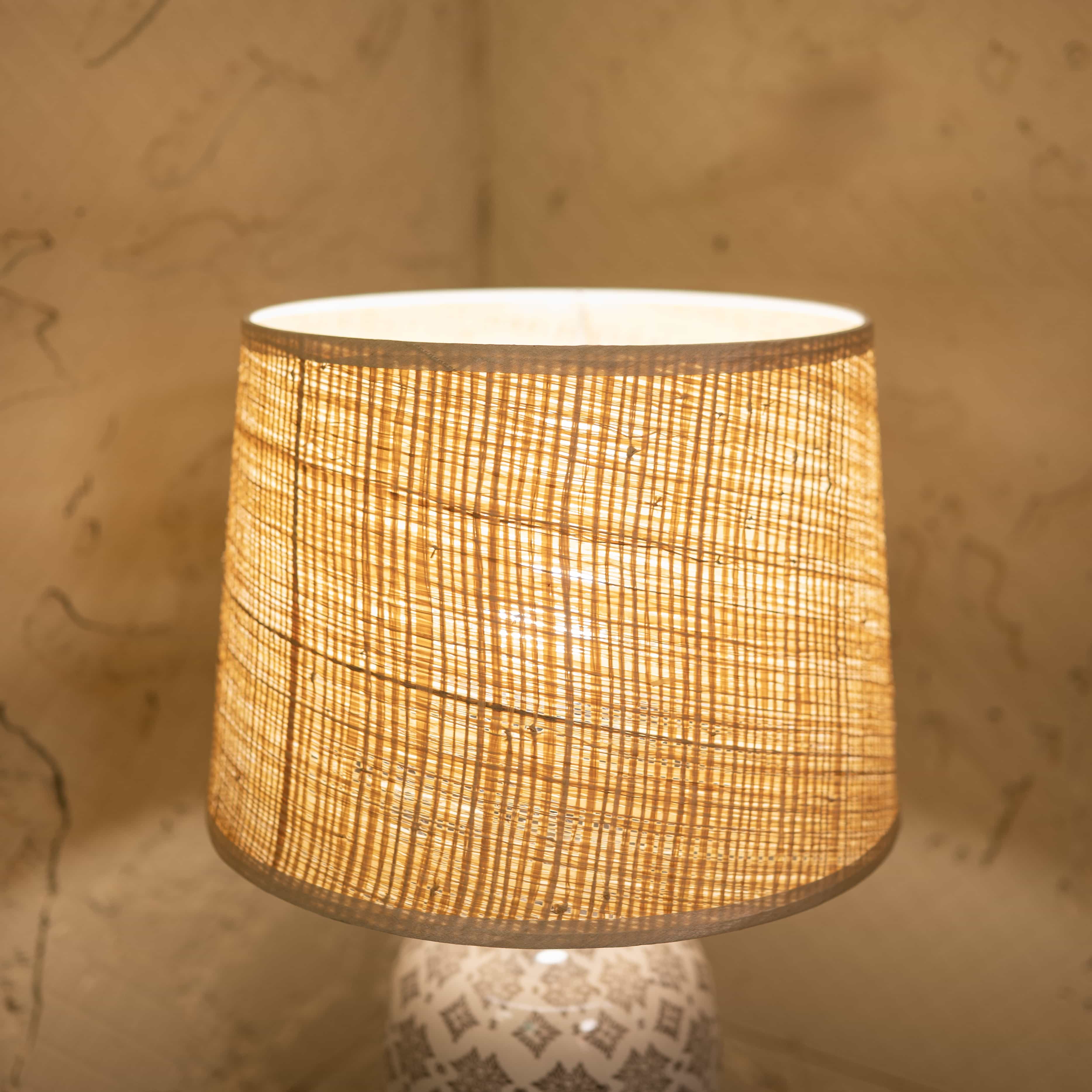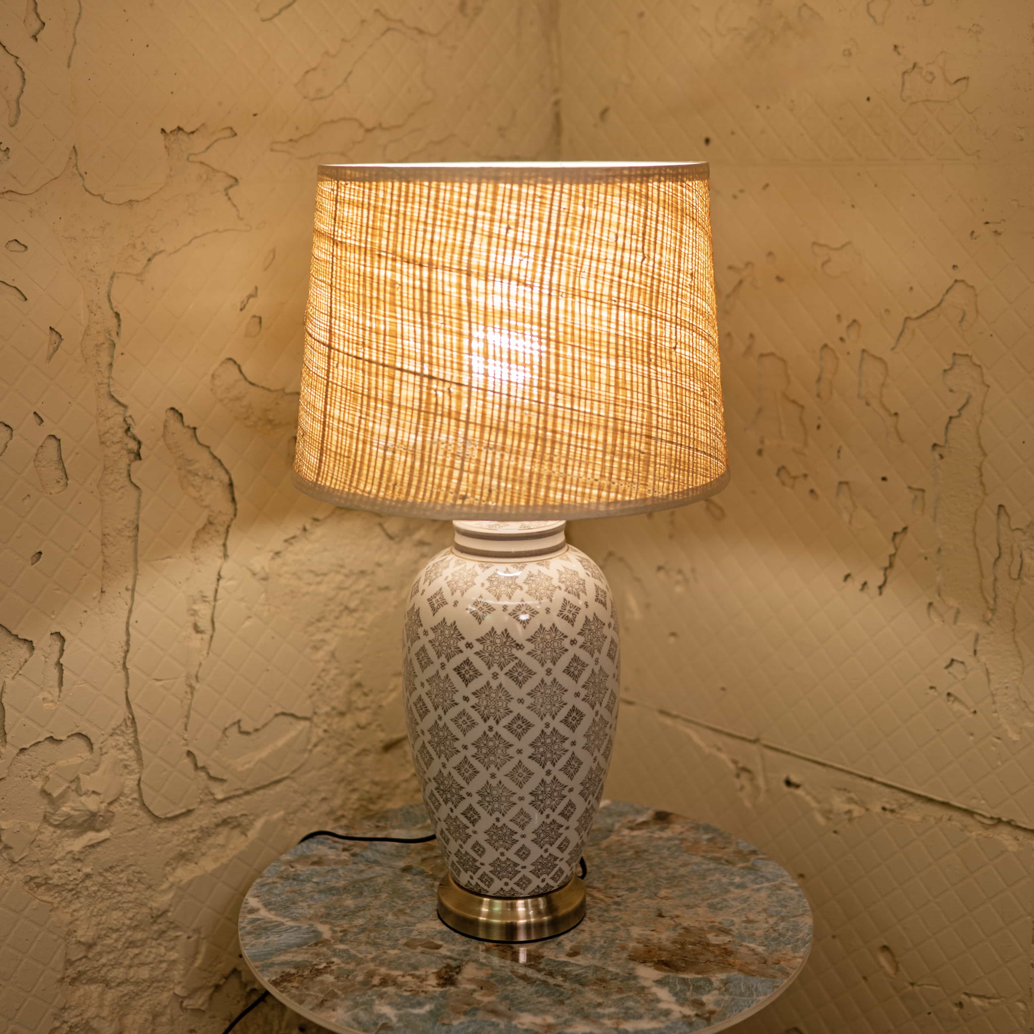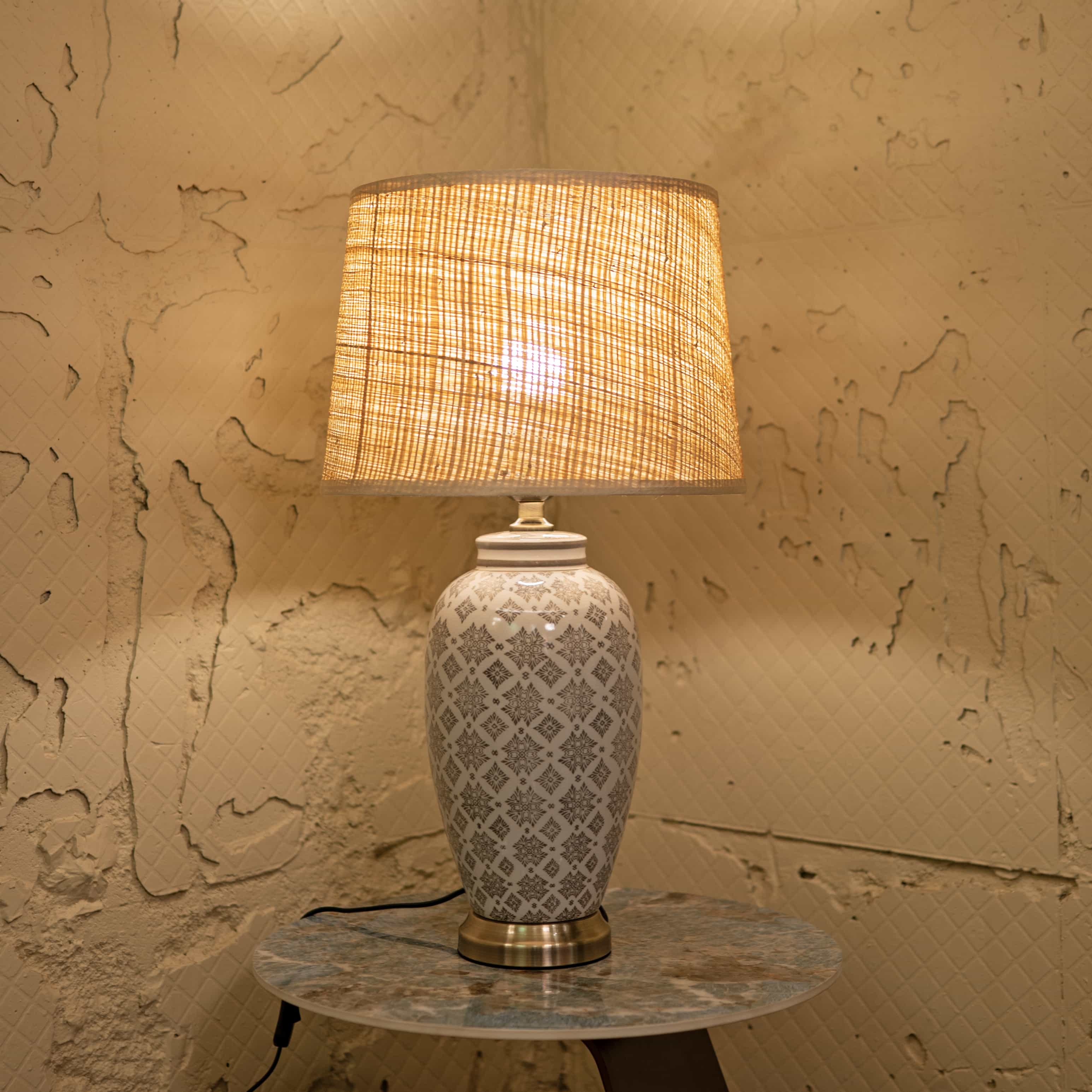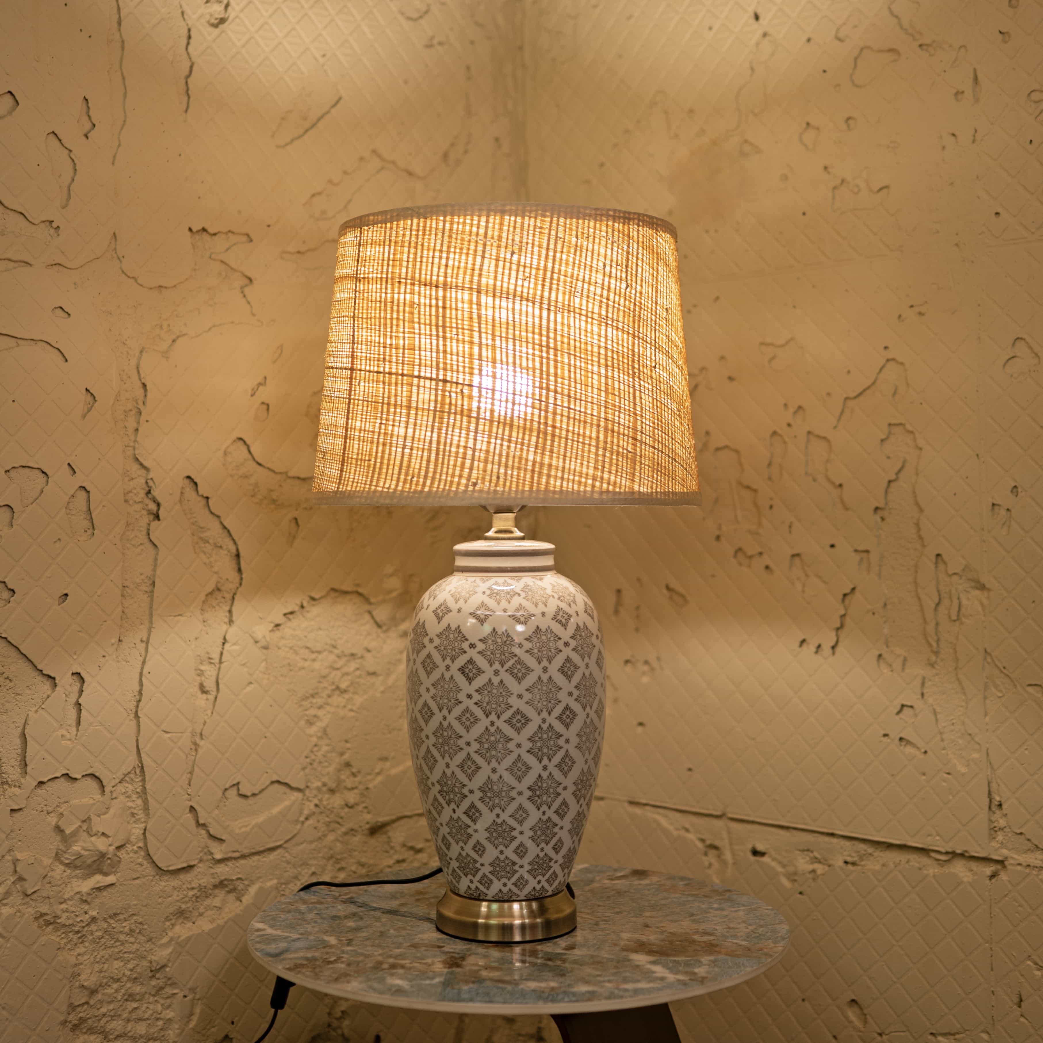 Soft Glow is a ceramic table lamp with a subtle geometric pattern and a warm-toned fabric shade. Its gentle light and timeless design bring a calm, welcoming feel to any corner of your home.