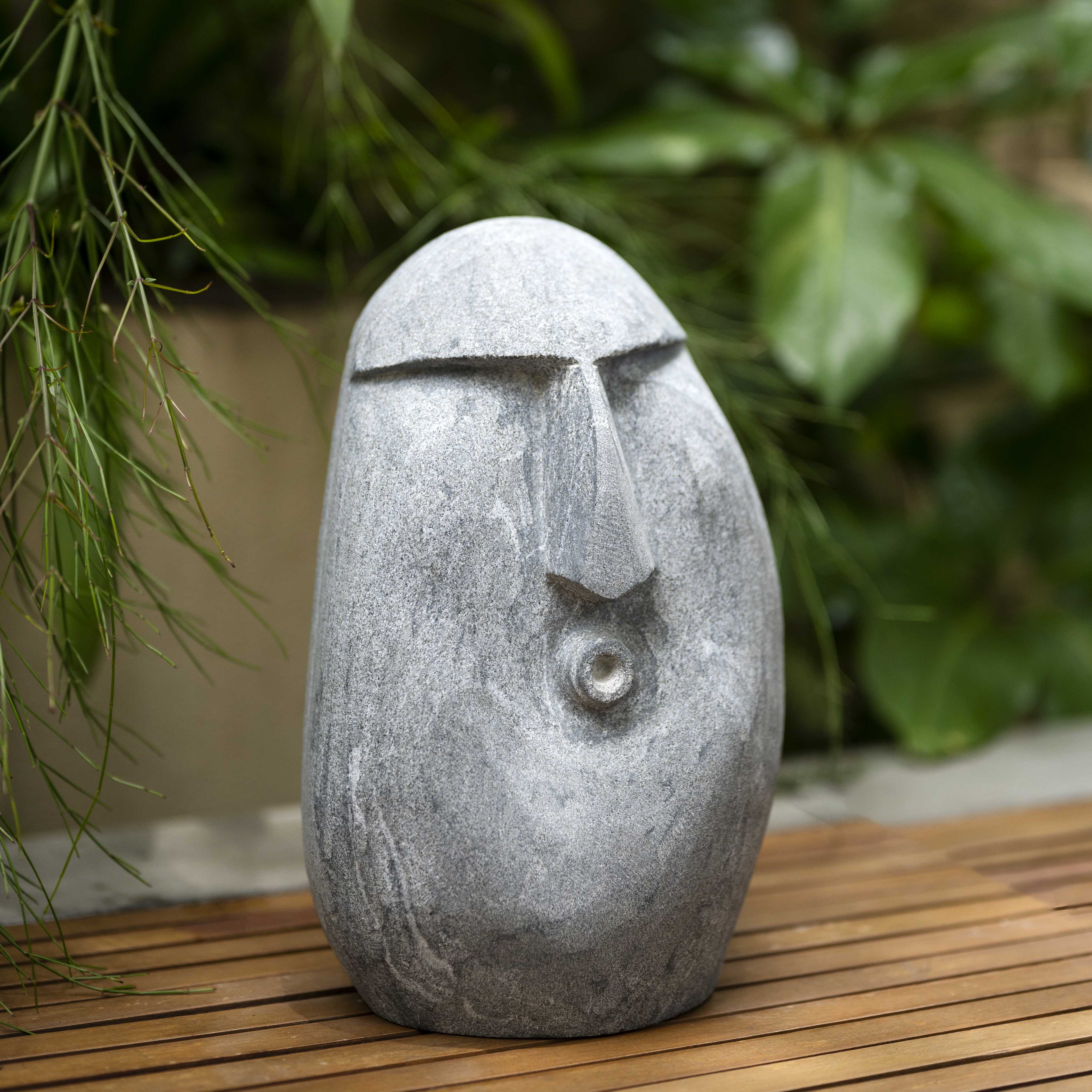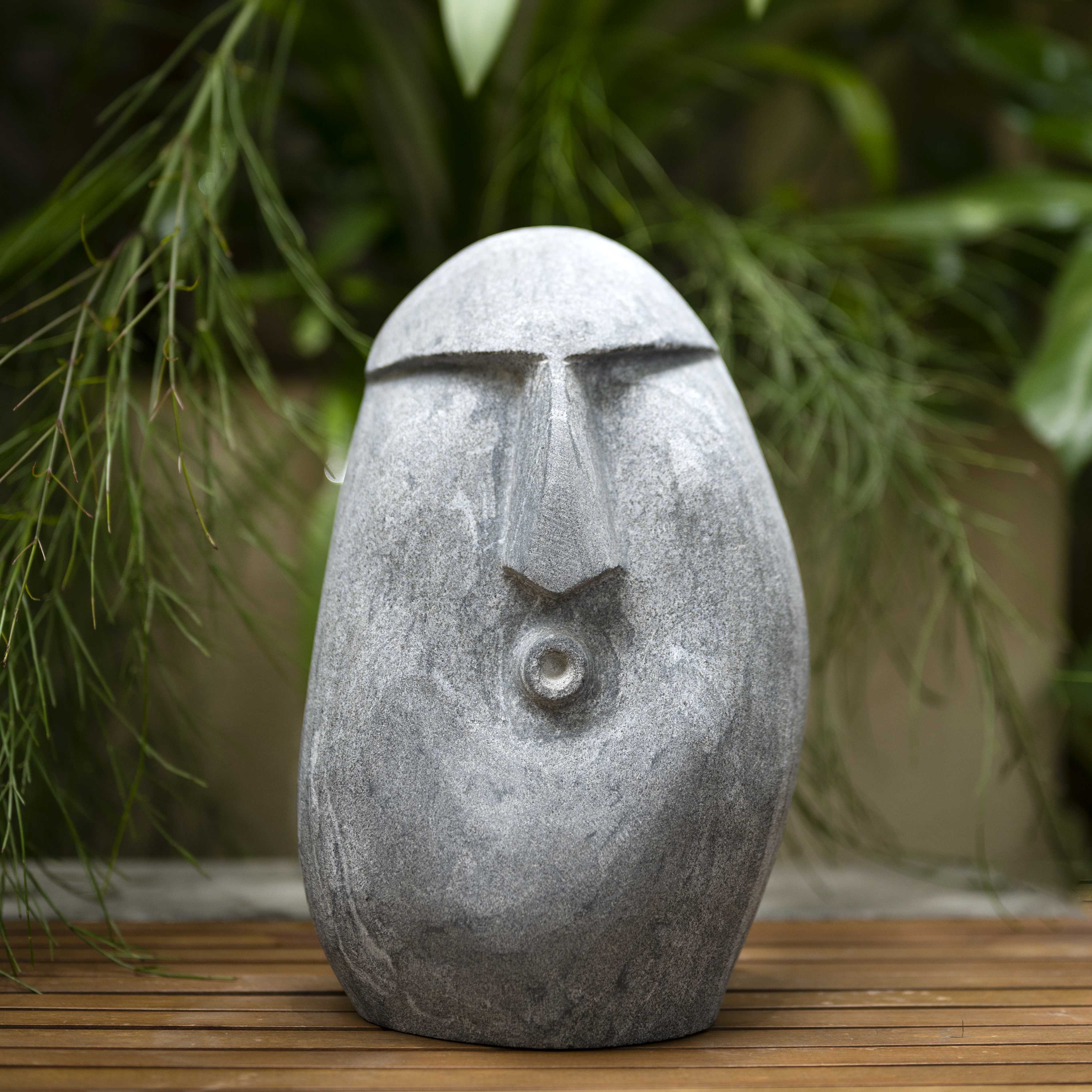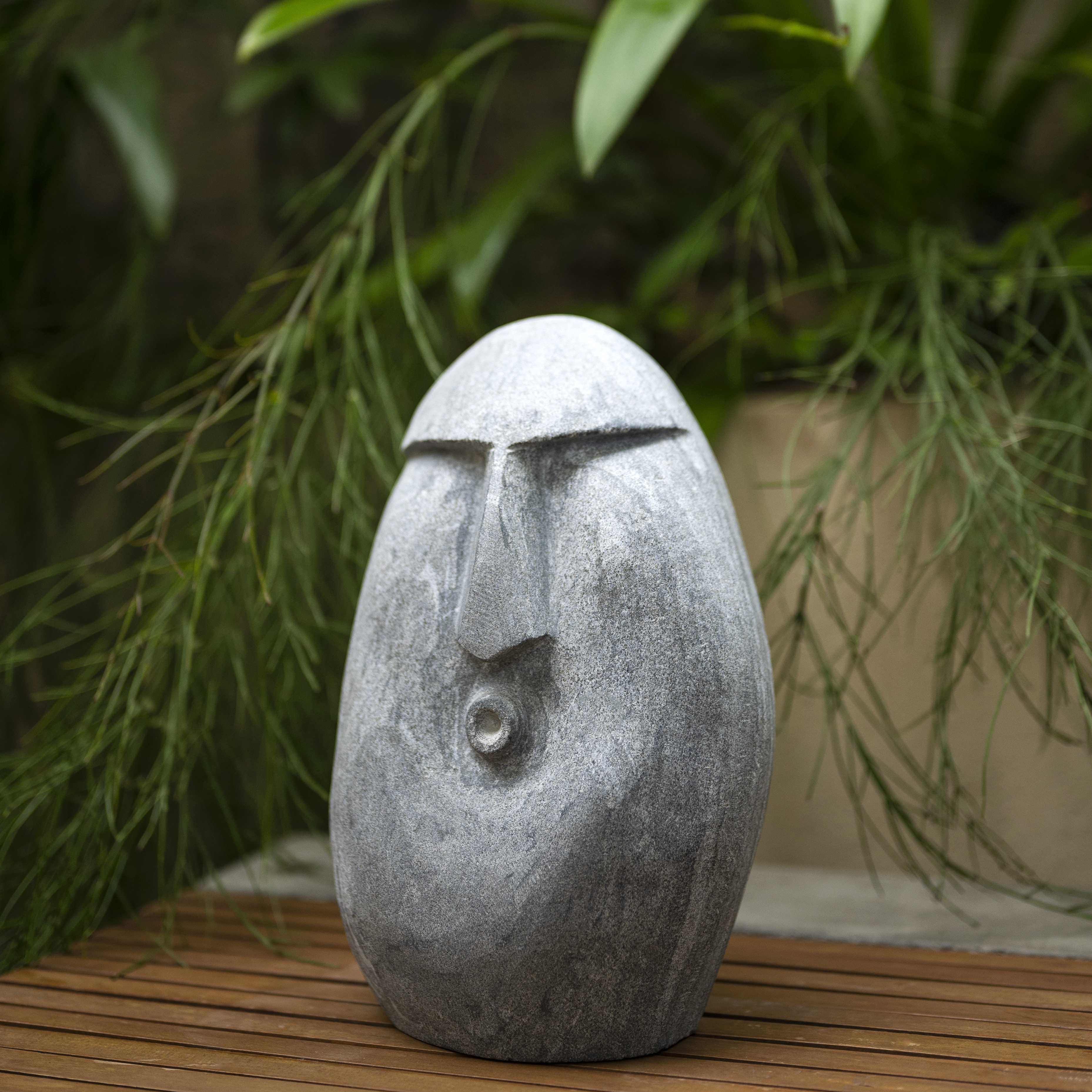 Whistleblower is a face stone sculpture. This piece is minimal and absolutely stands out. The grey stone makes this an easy piece to style. Add this to your outdoor space individually or combined with multiple potters, for a fun element.