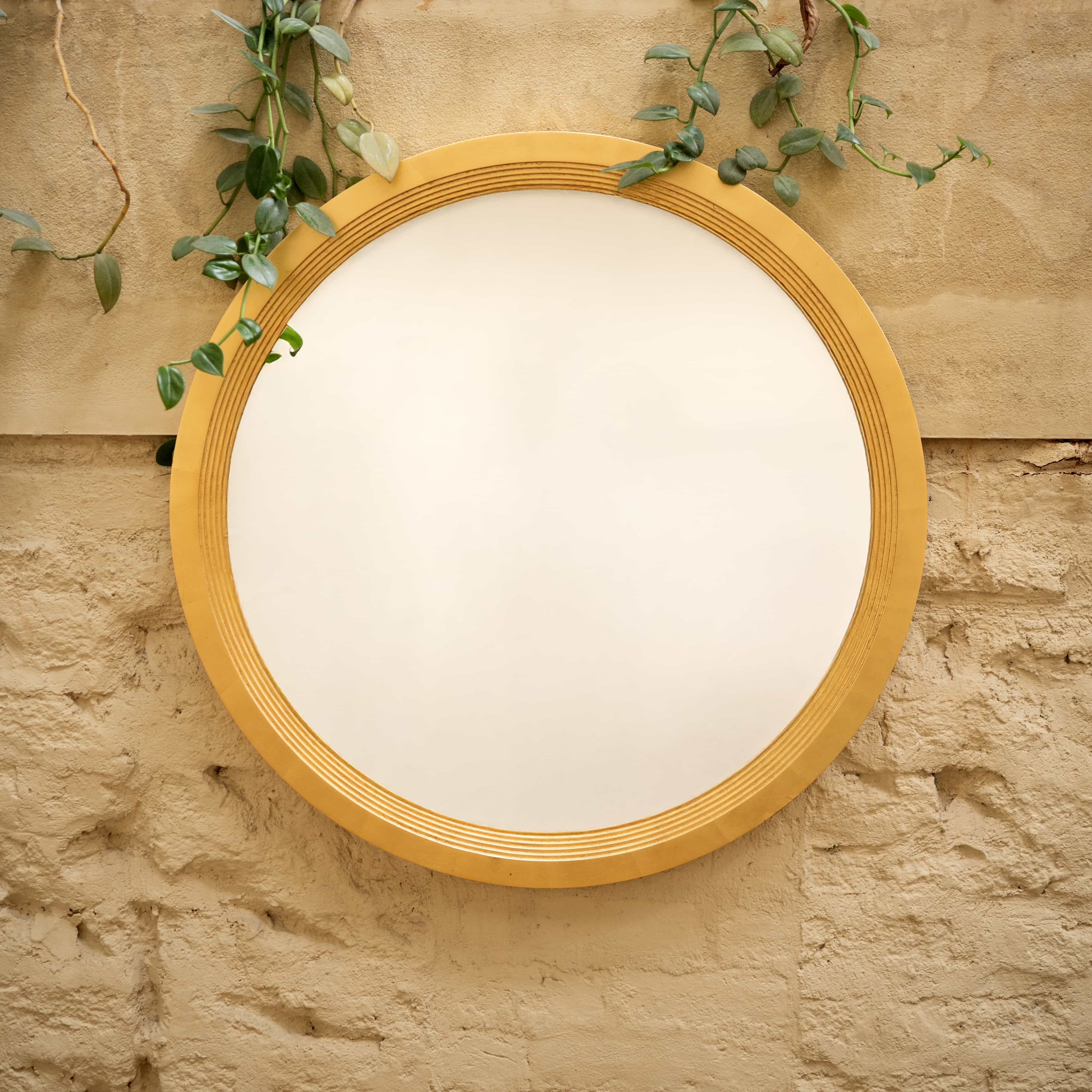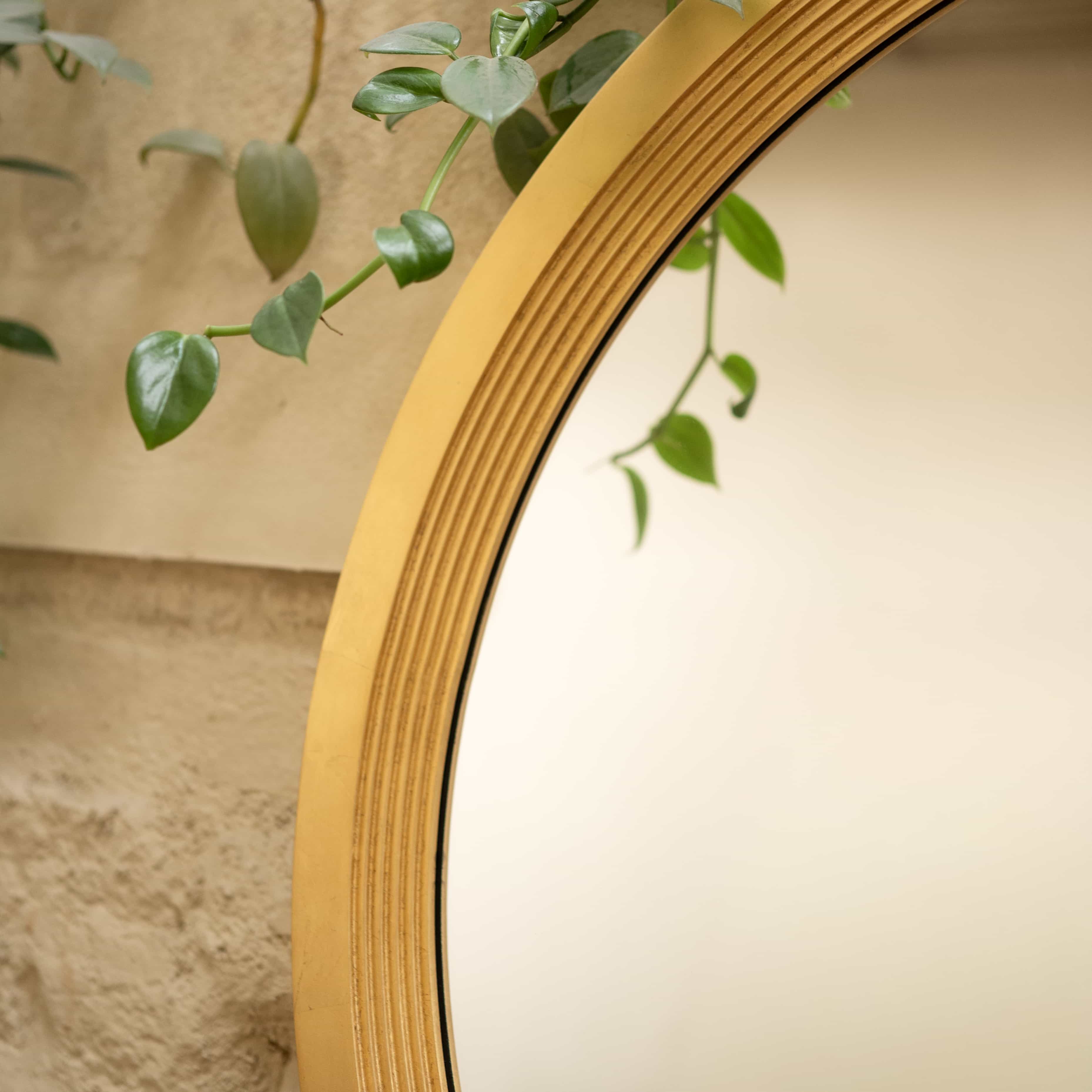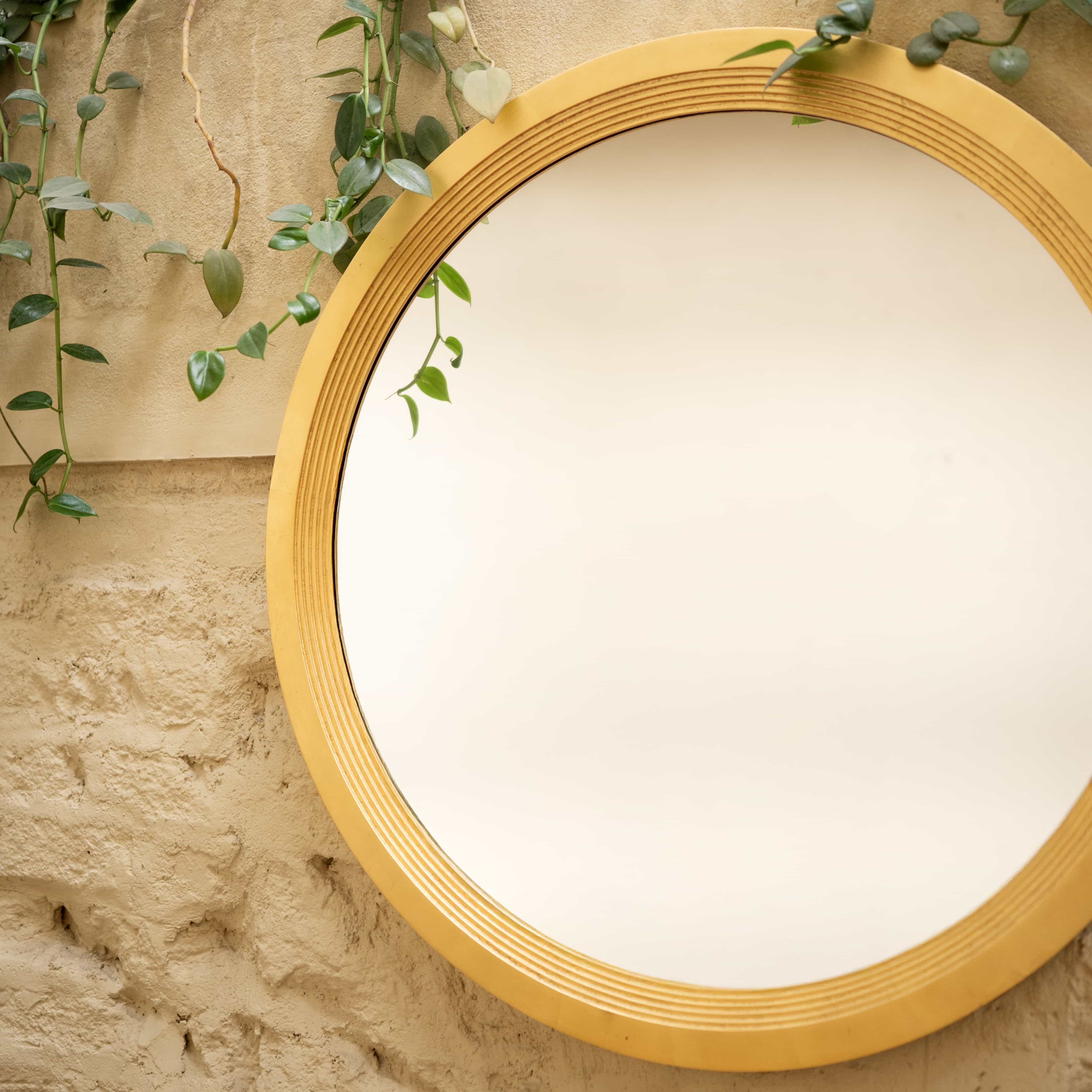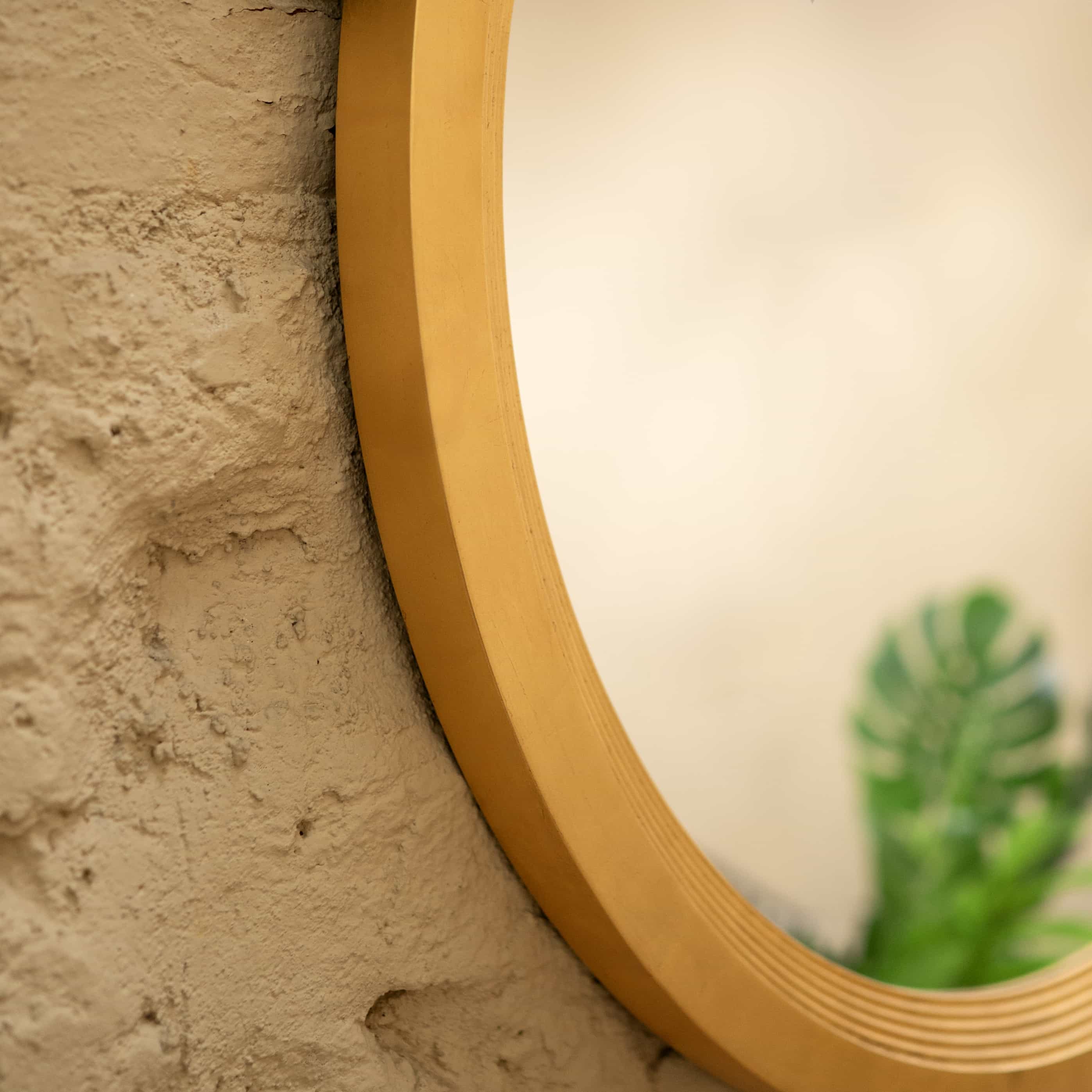 Sunbeam is a wall mirror with a gold frame. The gold of this piece lends it a vintage regal look. Add this to your living as a decor item, or to your vanity station.