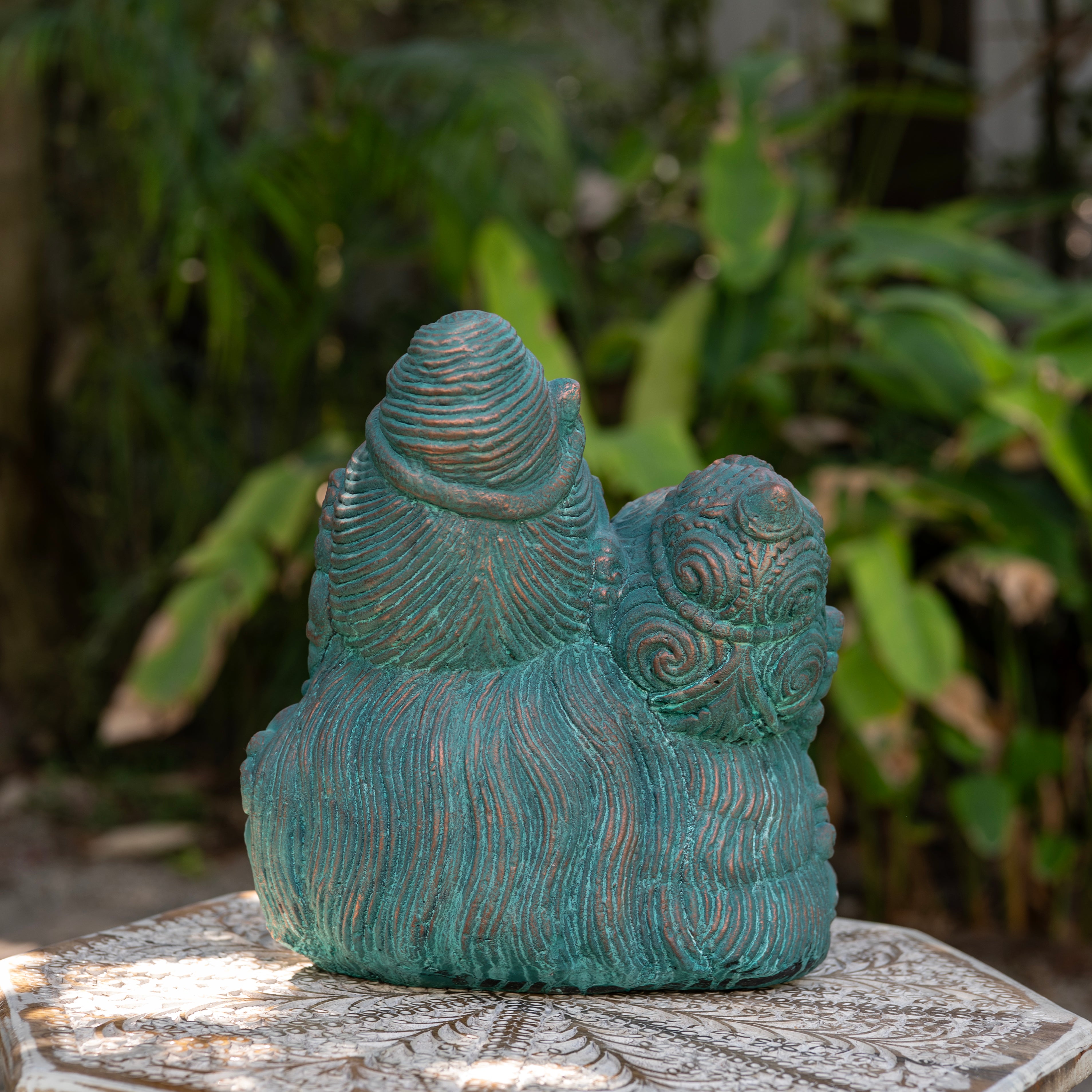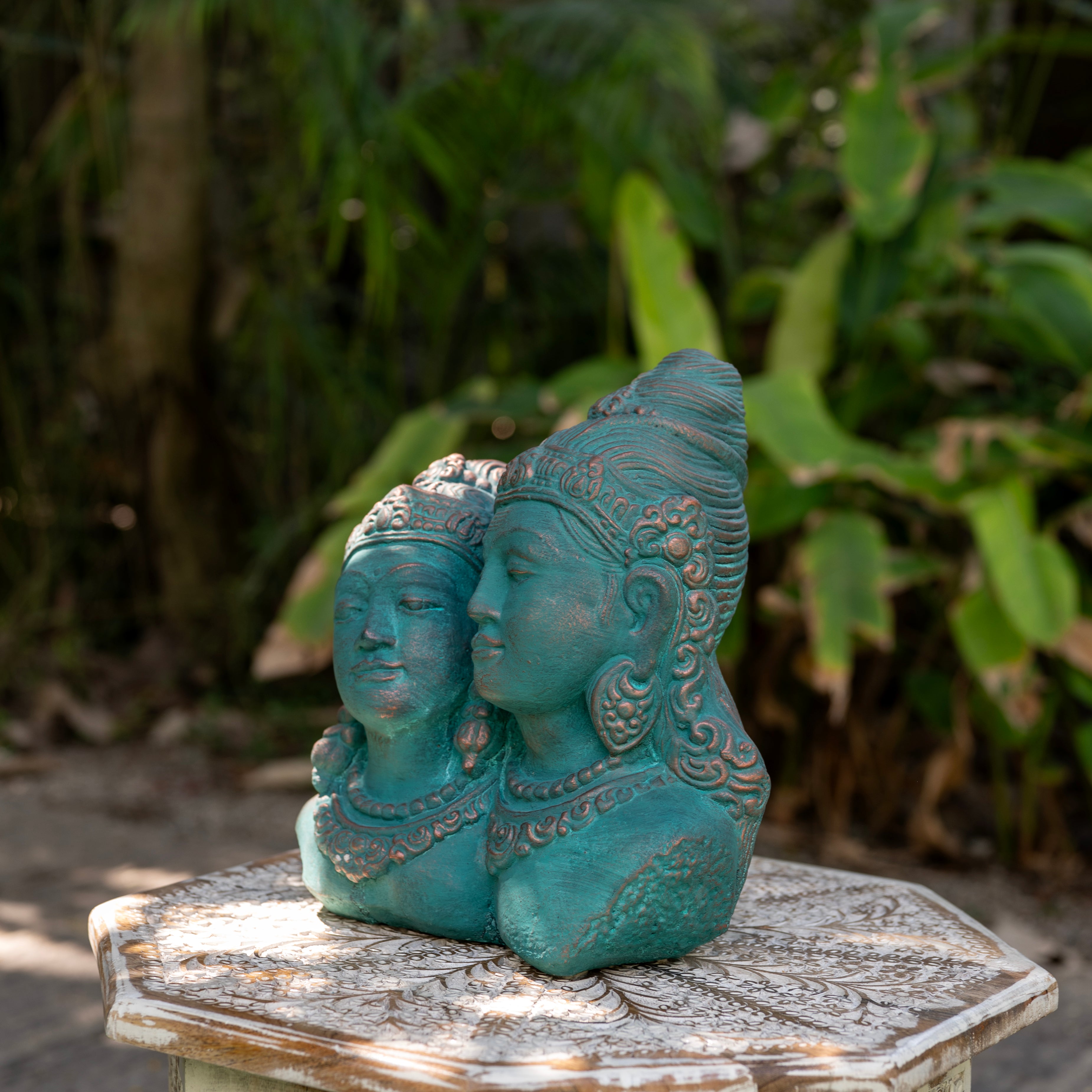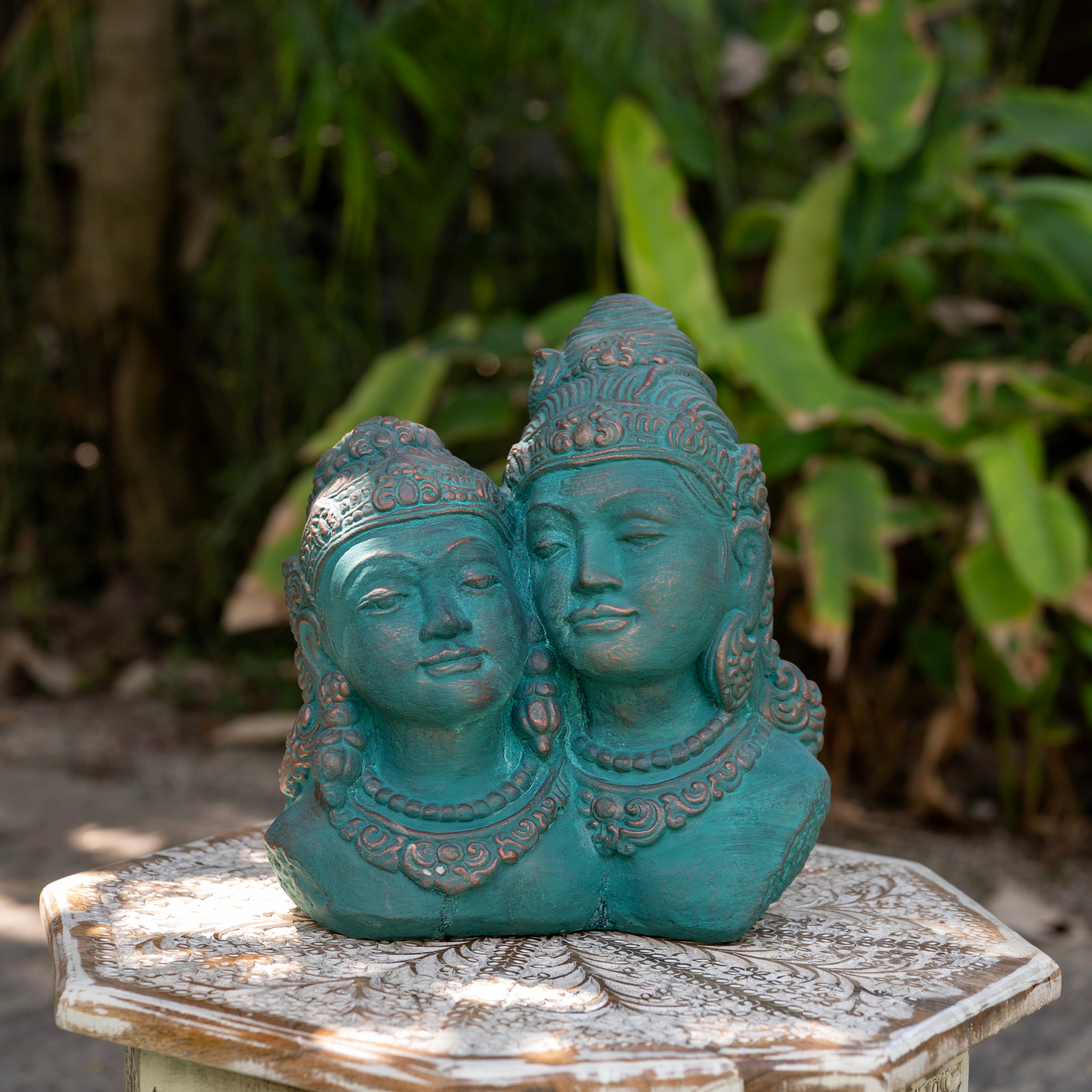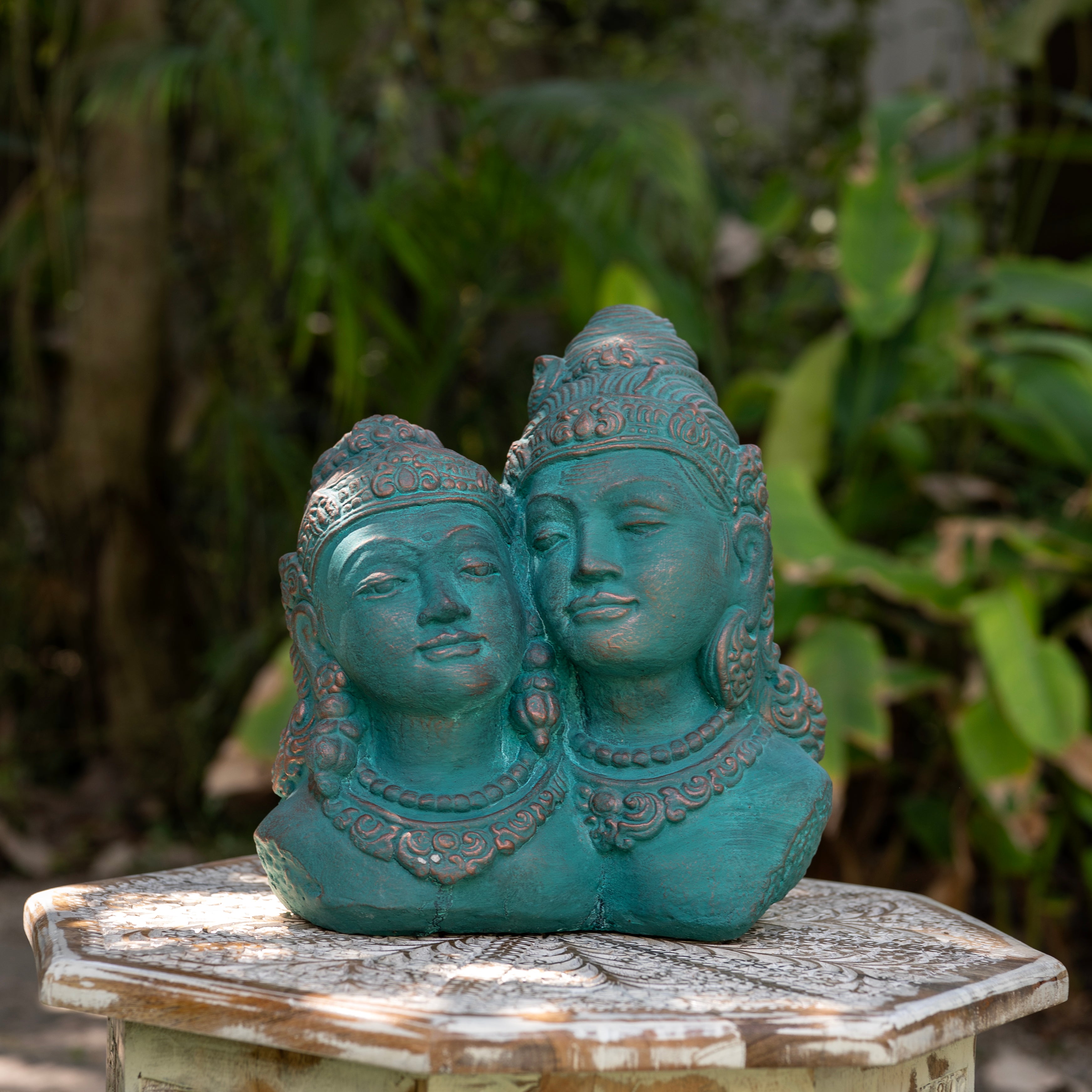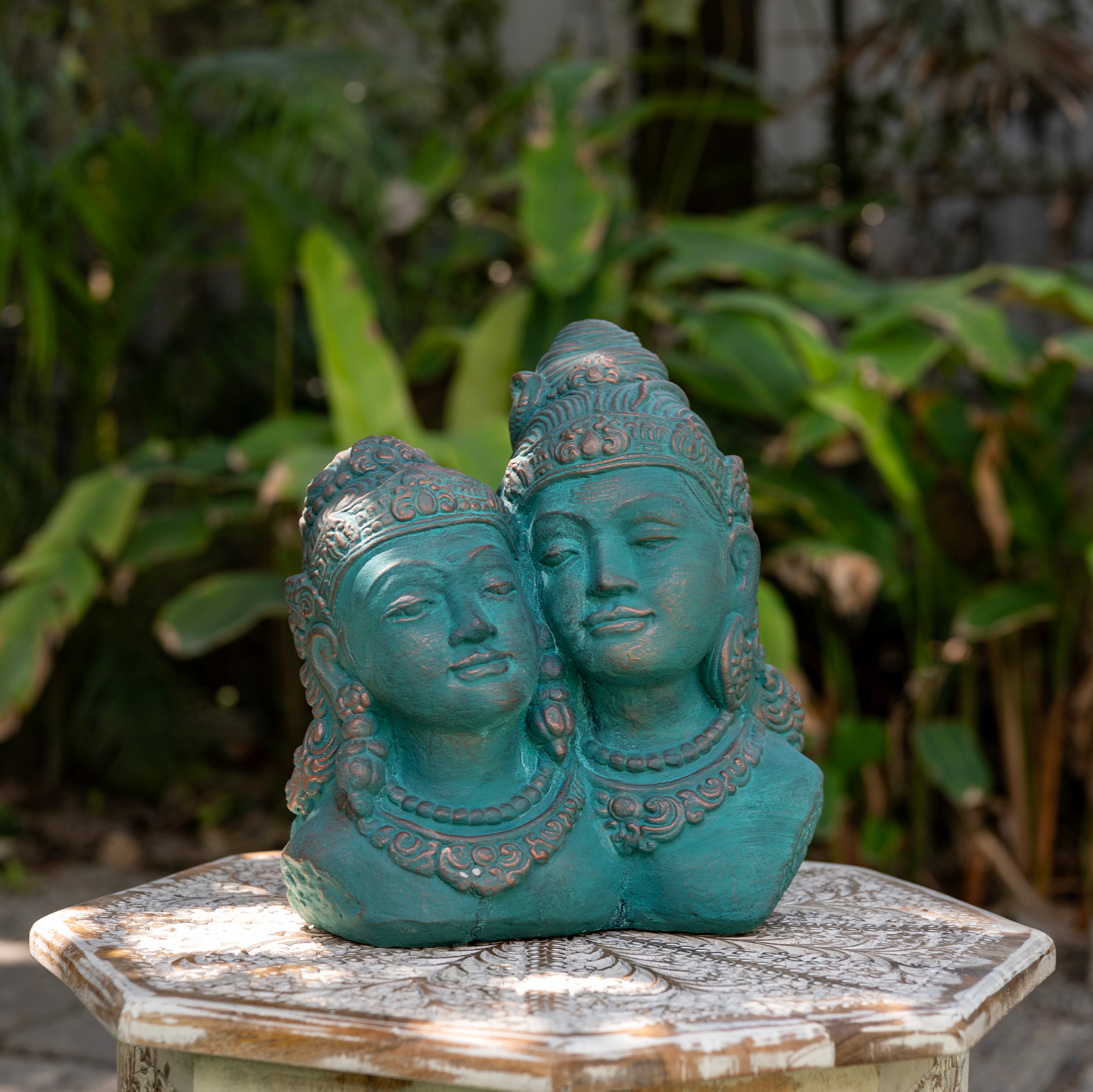 This heavy-cast bust depicts Rama and Sita in a unified, side-by-side silhouette with a striking oxidized teal finish. Hand-finished with warm bronze highlights on their matching tiered crowns, this weathered piece serves as a bold, architectural anchor for any space.