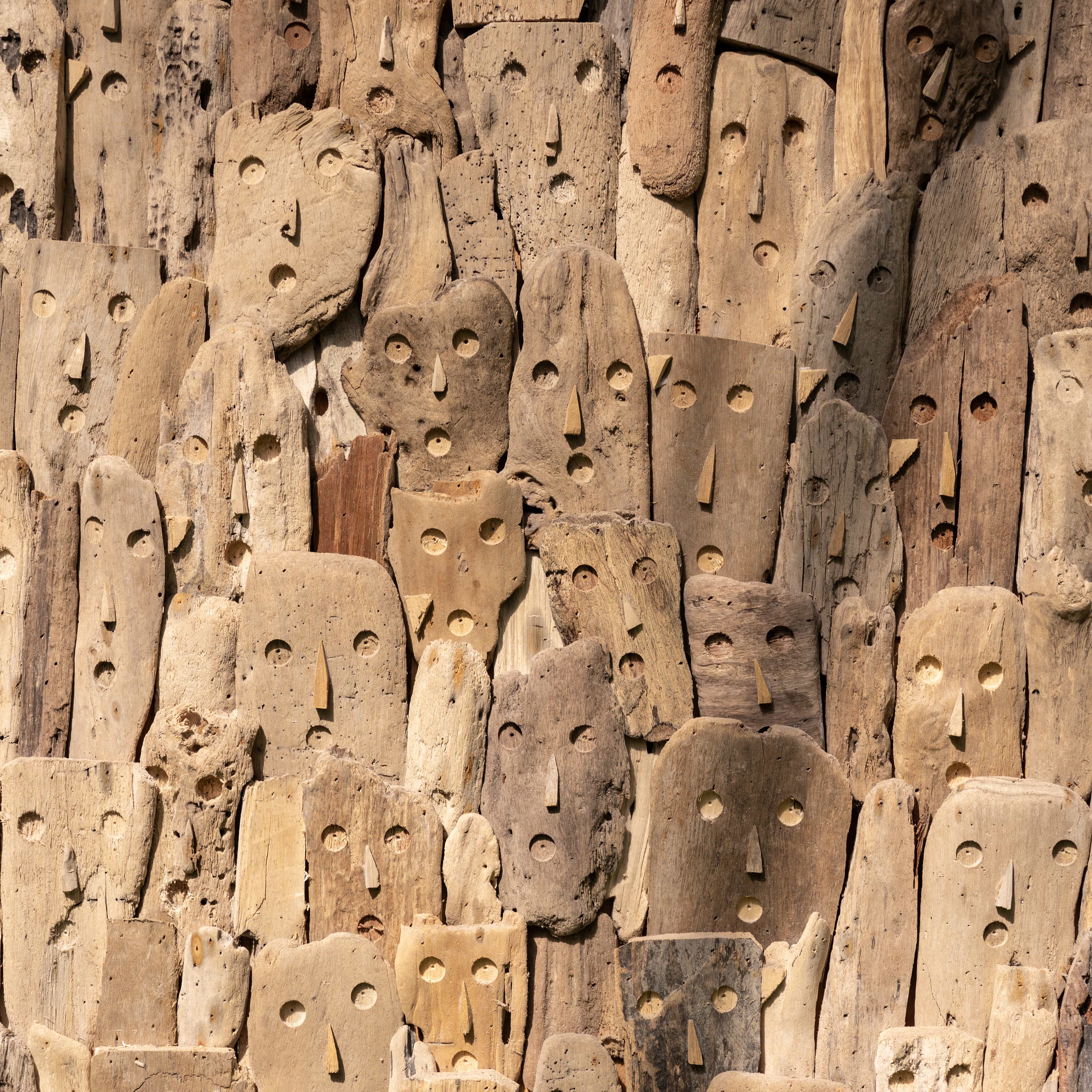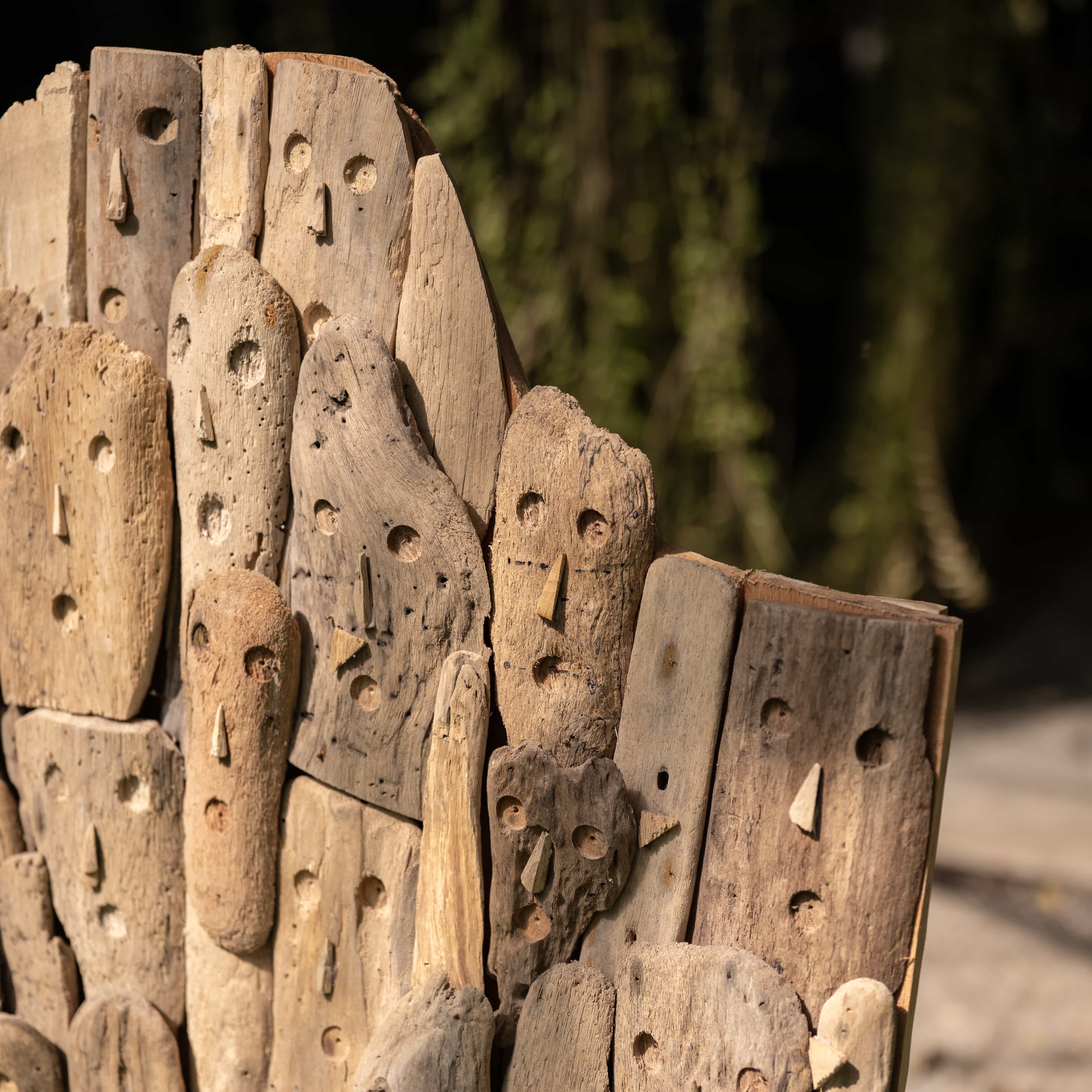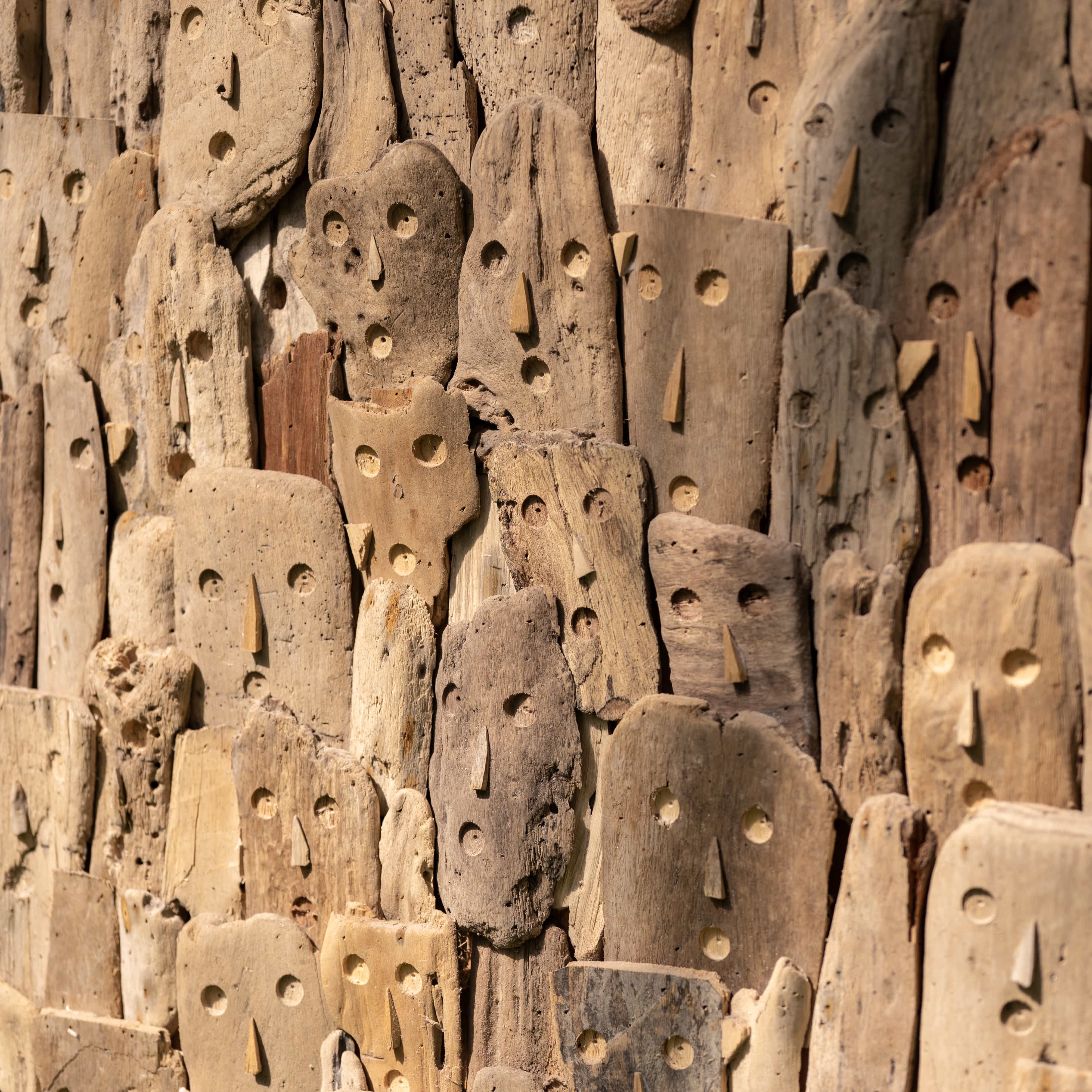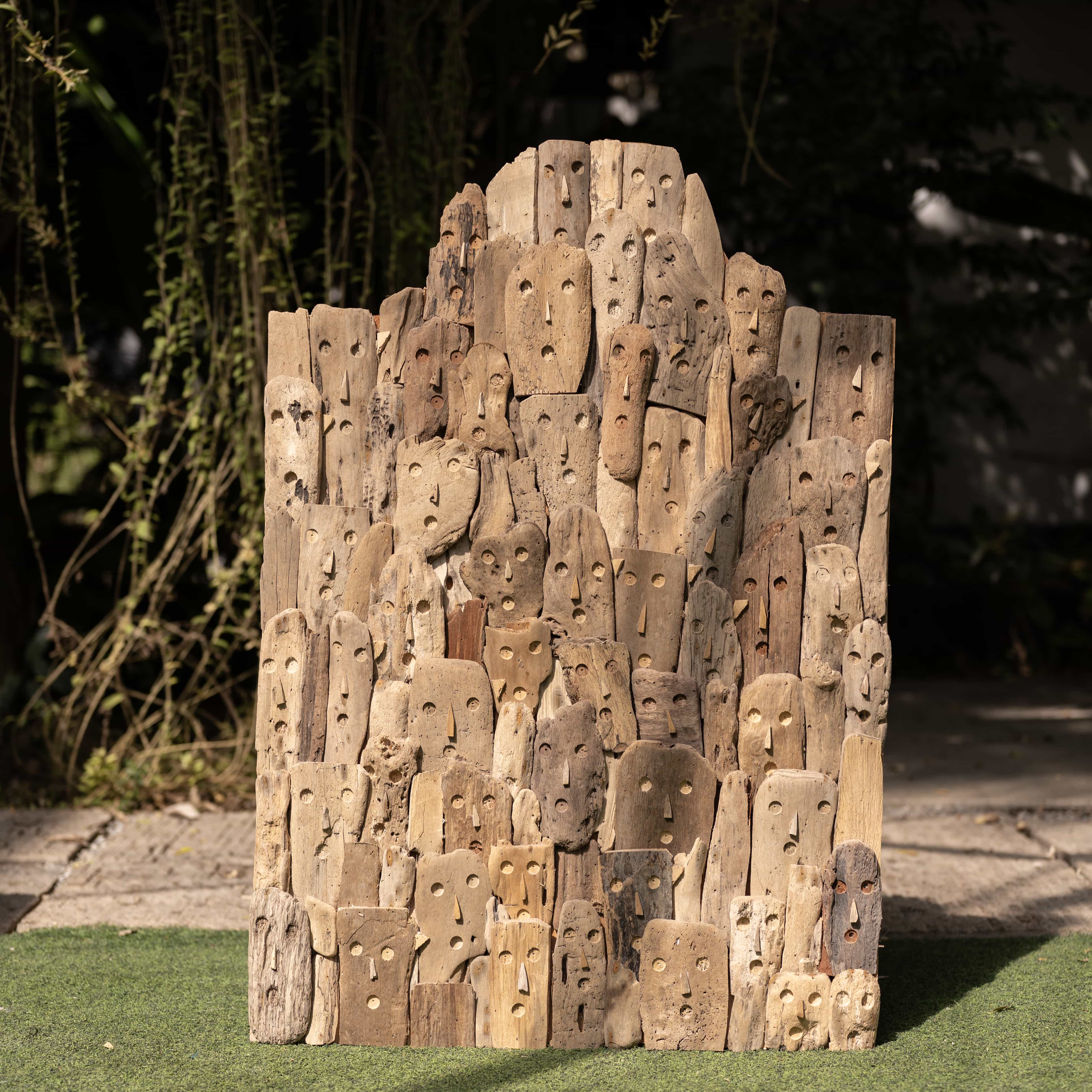 The artisan assembles weather-worn driftwood into a towering mosaic of silent, soulful faces to honor the collective spirit of a tribe. He views this sculpture as a living history, where every carved notch and sun-bleached grain sings a harmonic song of the sea and the soil.