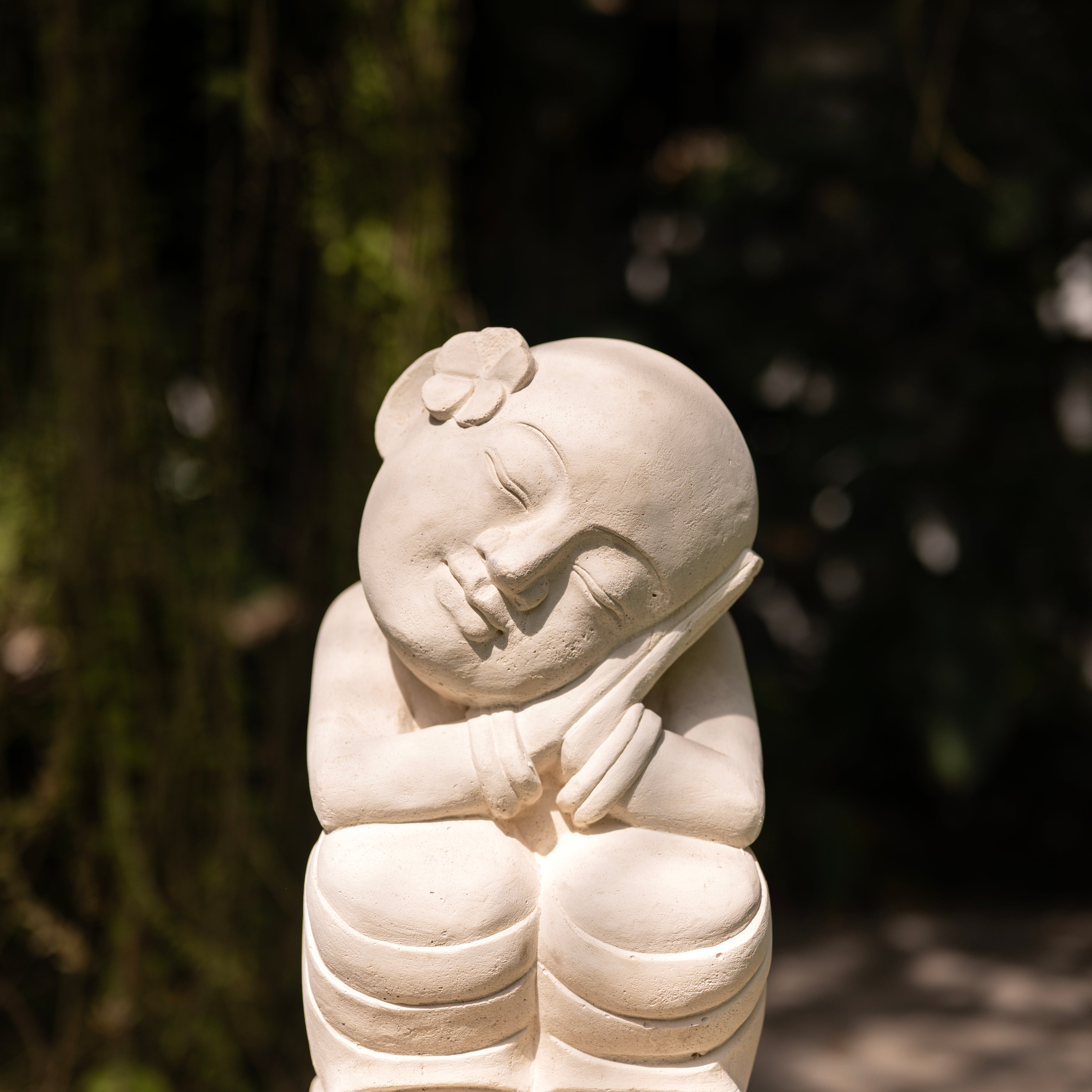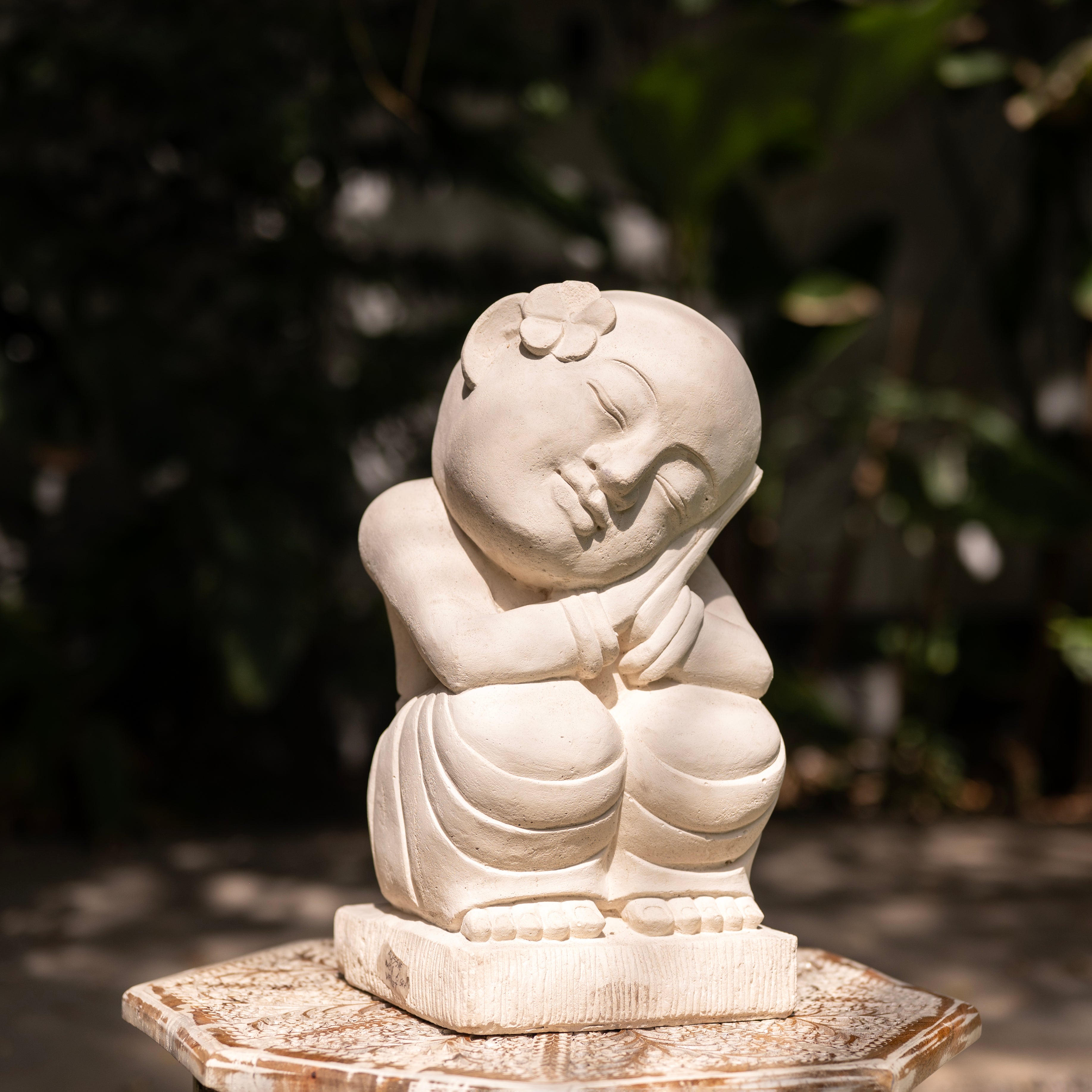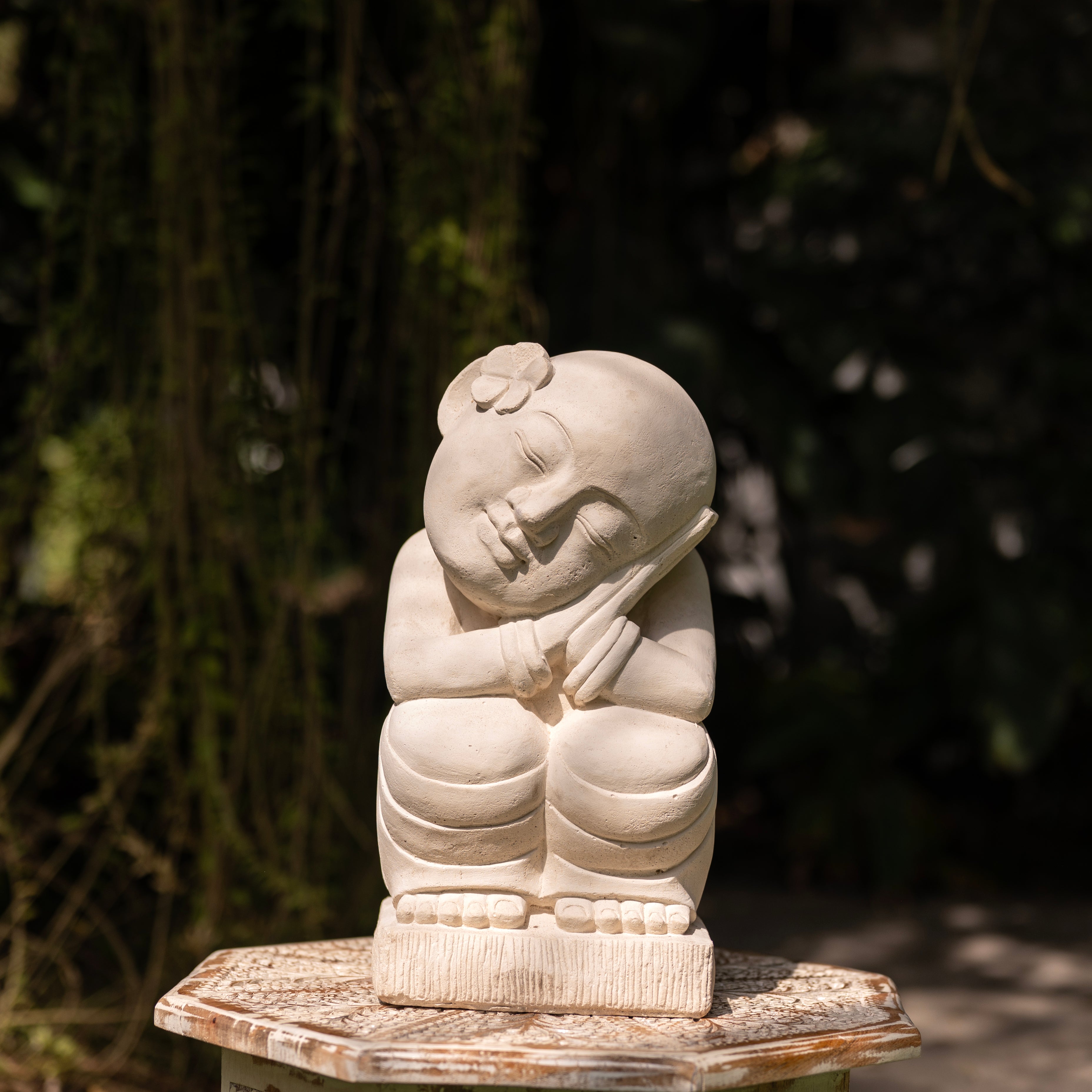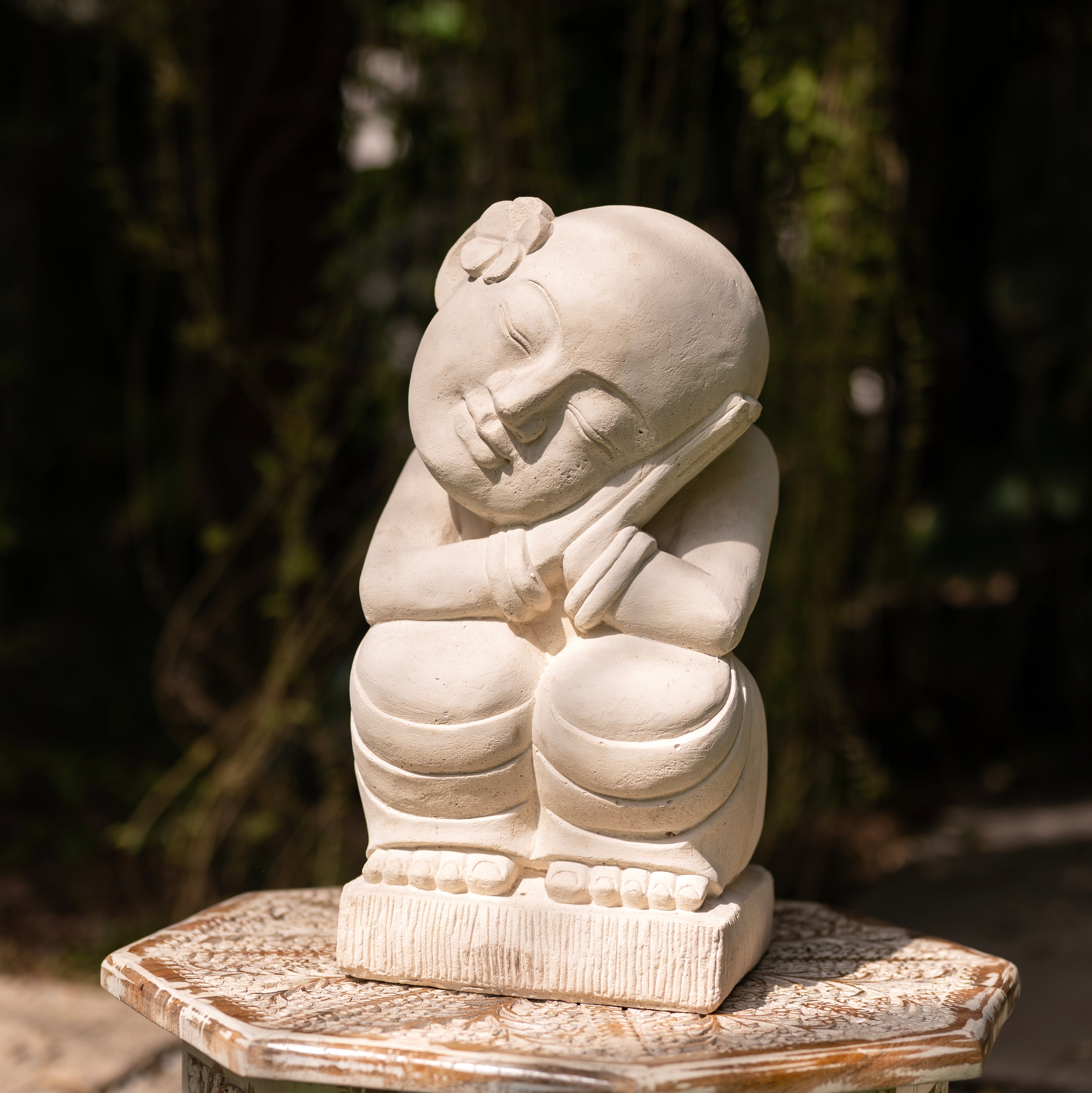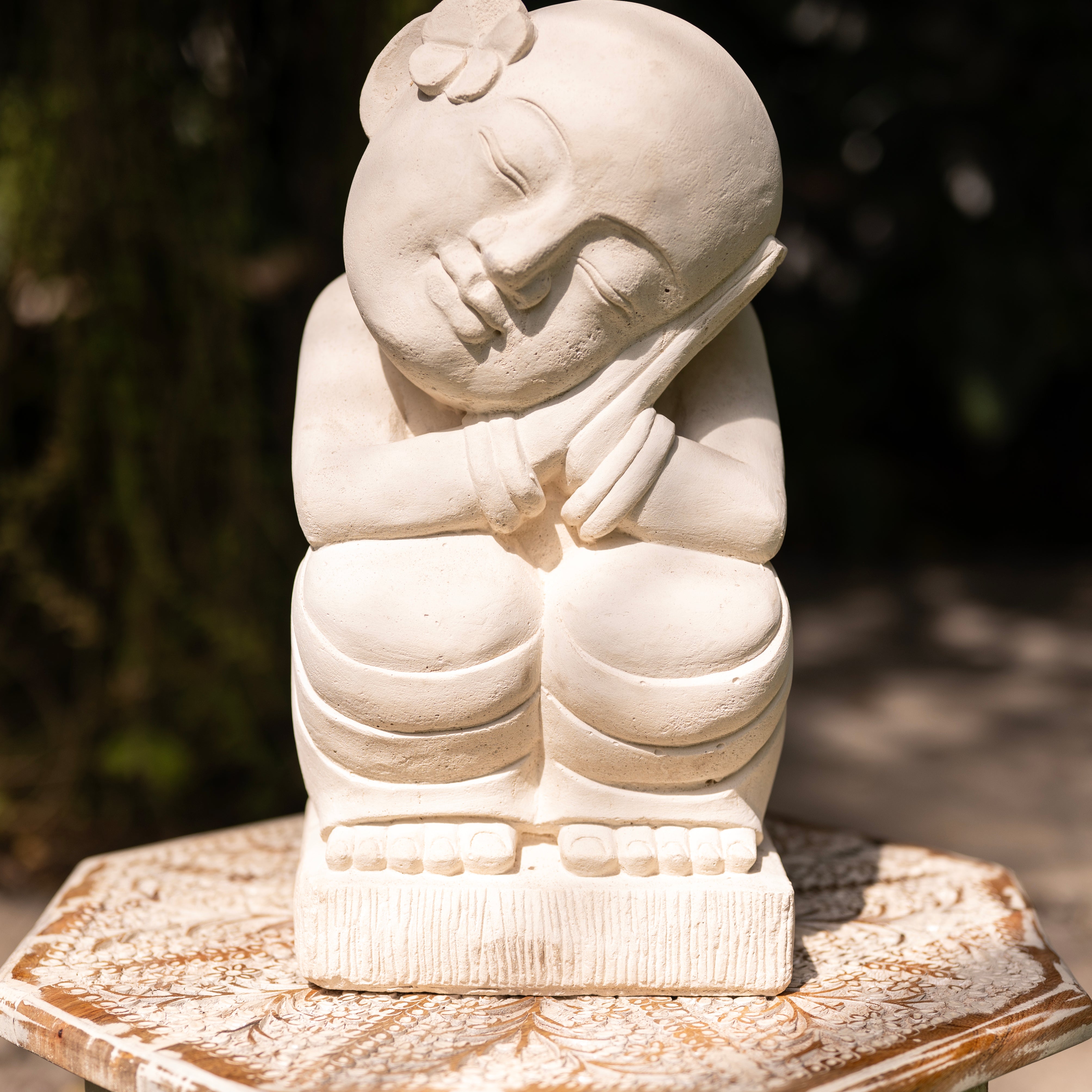 Carved as a study in rest and balance, the artisan shapes this form in quiet repose, its head gently supported like a structure at ease. Meant to sit like an architectural fragment, it brings stillness and contemplation into the space.
